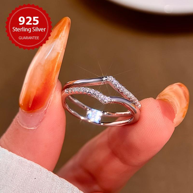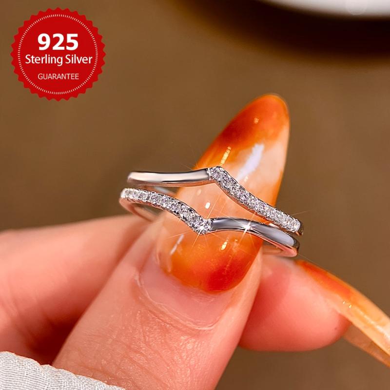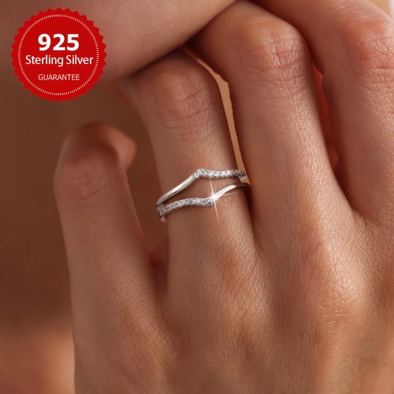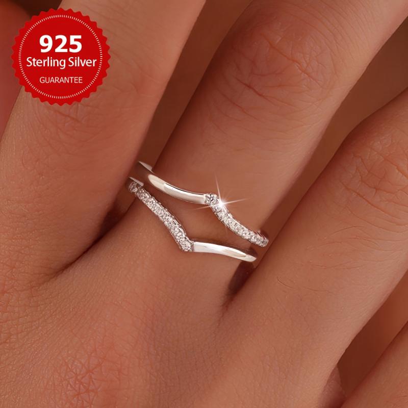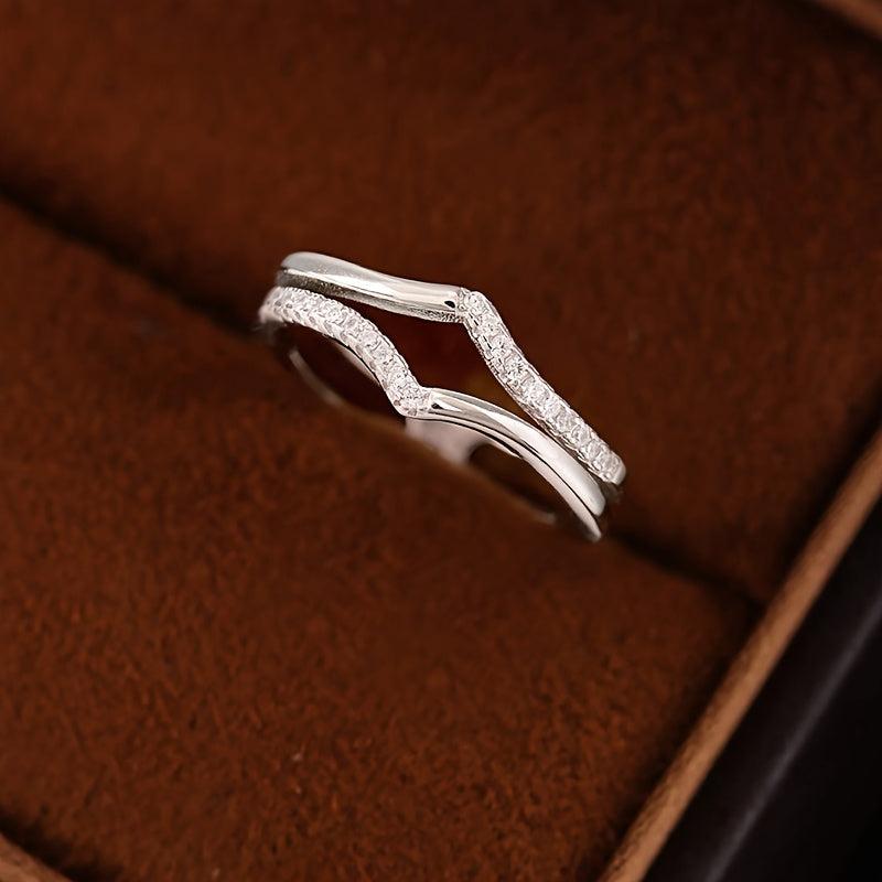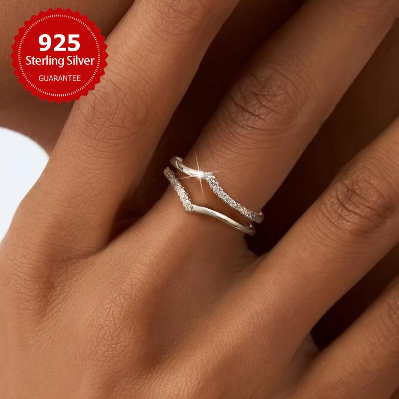 This elegant ring features a double layer design with zirconia inlay, perfect for weddings or daily wear. Made of pure silver, it shines beautifully.