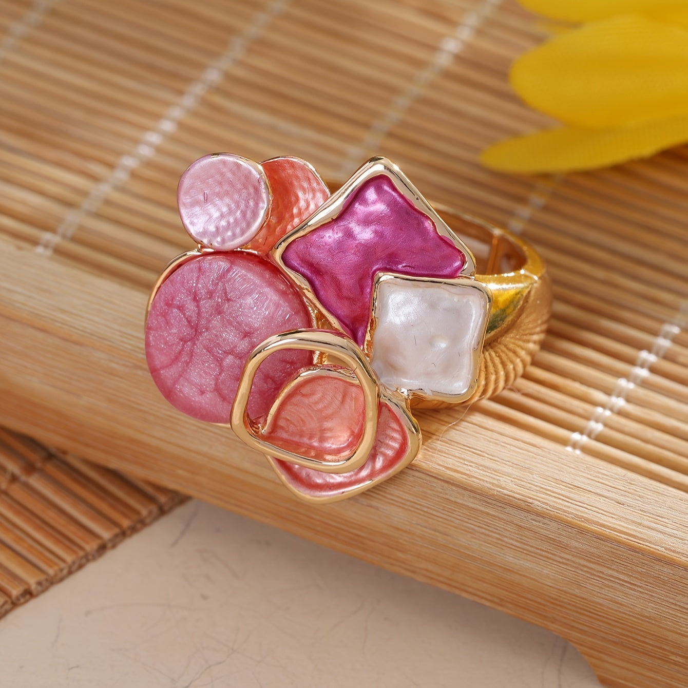Add a pop of color and style to your look with this adjustable statement ring featuring pink resin inlay and a wide band design with a geometric pattern. The ring is plated with 18K gold for a luxurious touch.