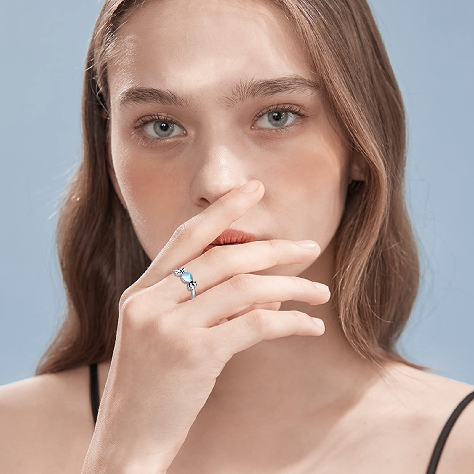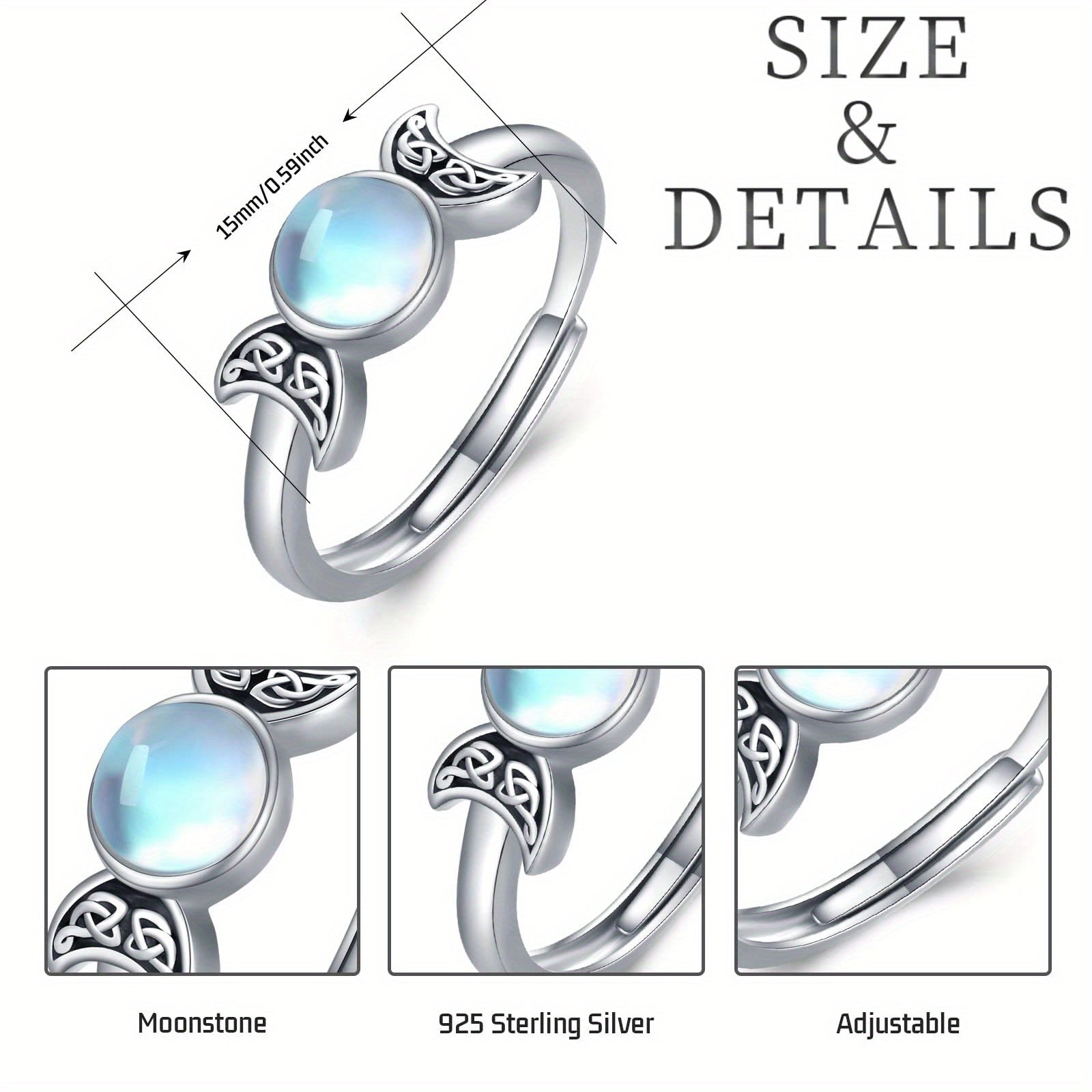 Elegant Triple Moon Goddess ring crafted from 925 sterling silver featuring moonstone. This adjustable ring is the perfect gift for your girlfriend or loved one.