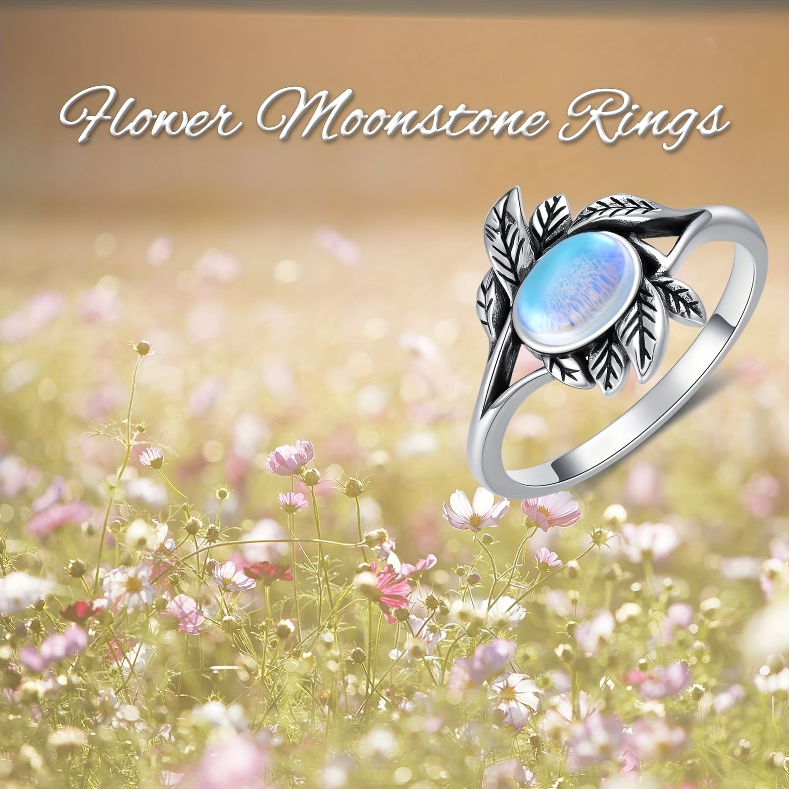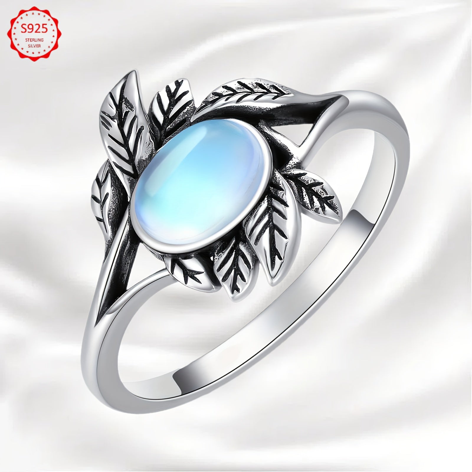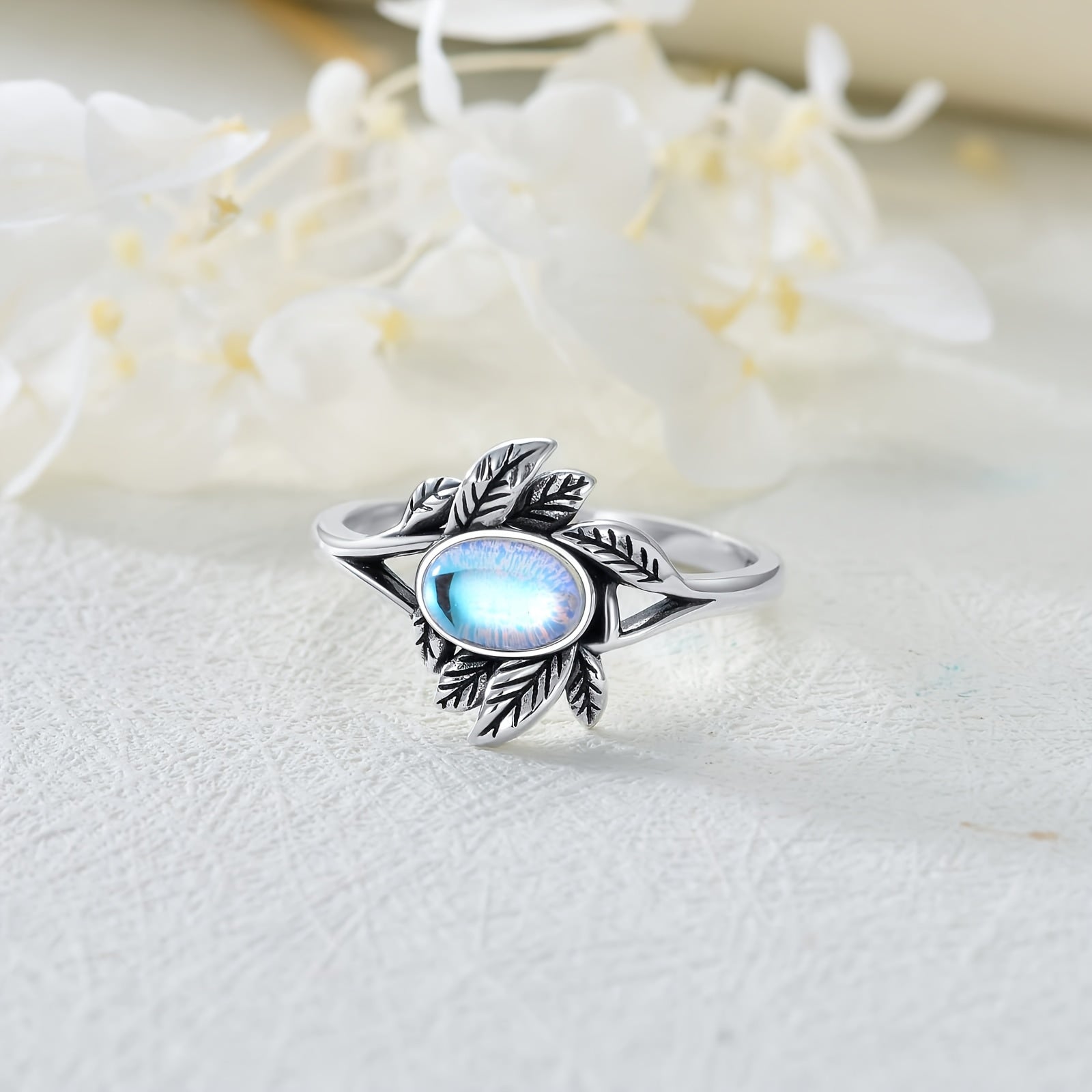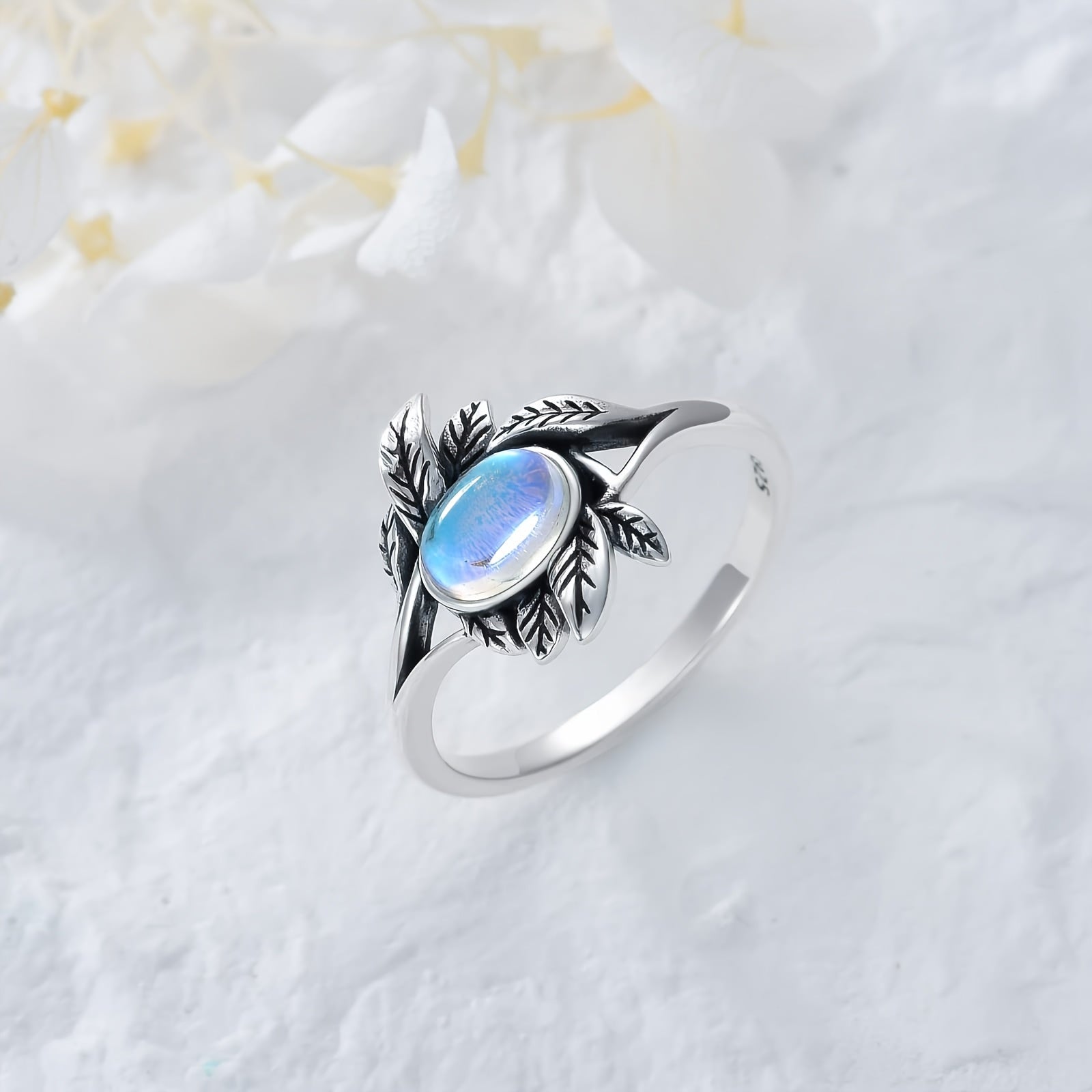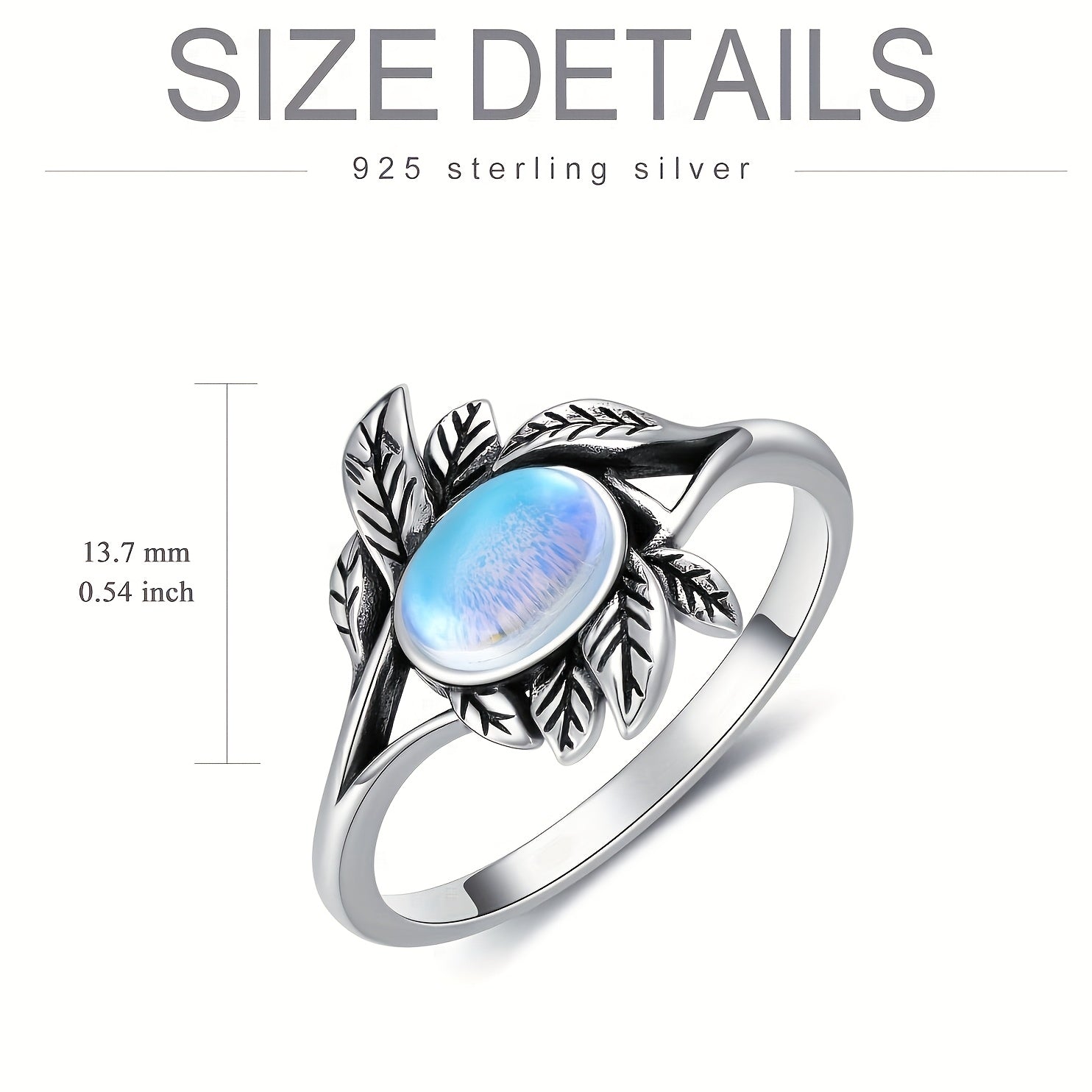 This elegant ring features a synthetic moonstone set in sterling silver with a delicate olive leaf design. Perfect for a birthday gift or everyday wear.