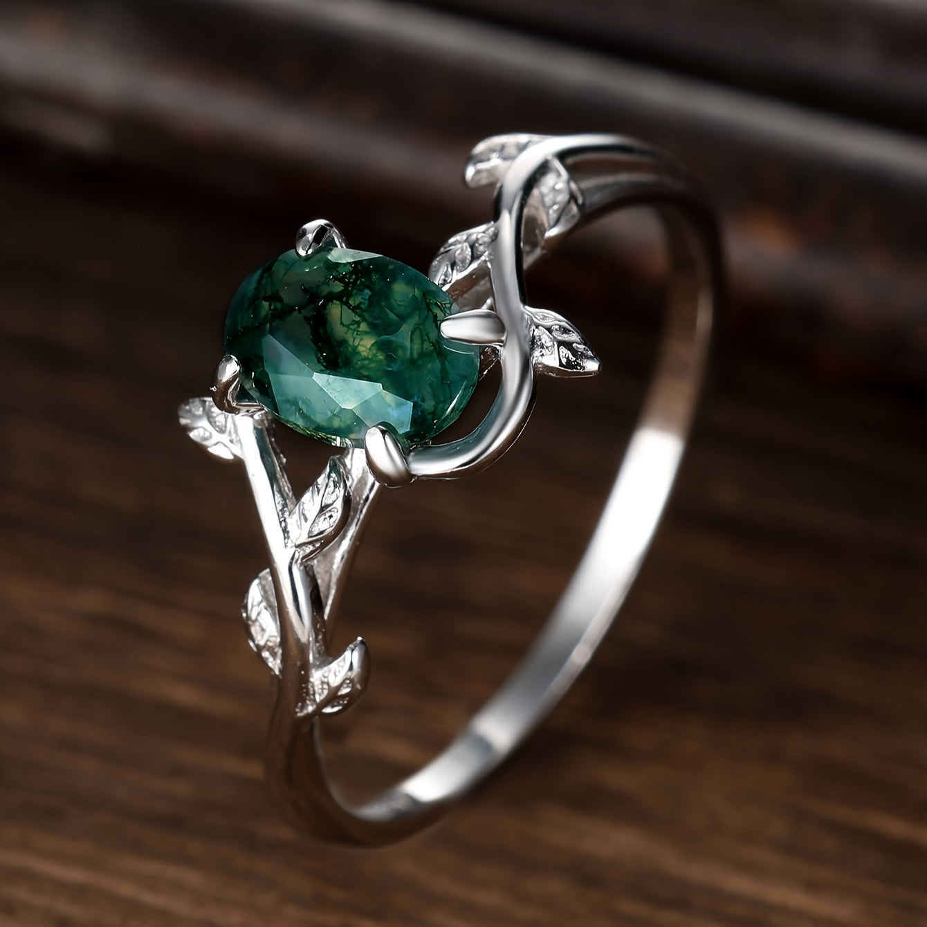 This stunning cocktail ring features a round green chalcedony gemstone set in a leaf-inspired four-prong setting. Perfect for engagement, weddings, or any special occasion.