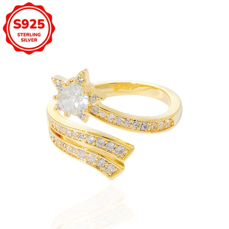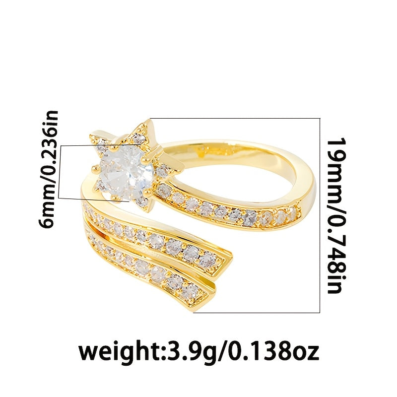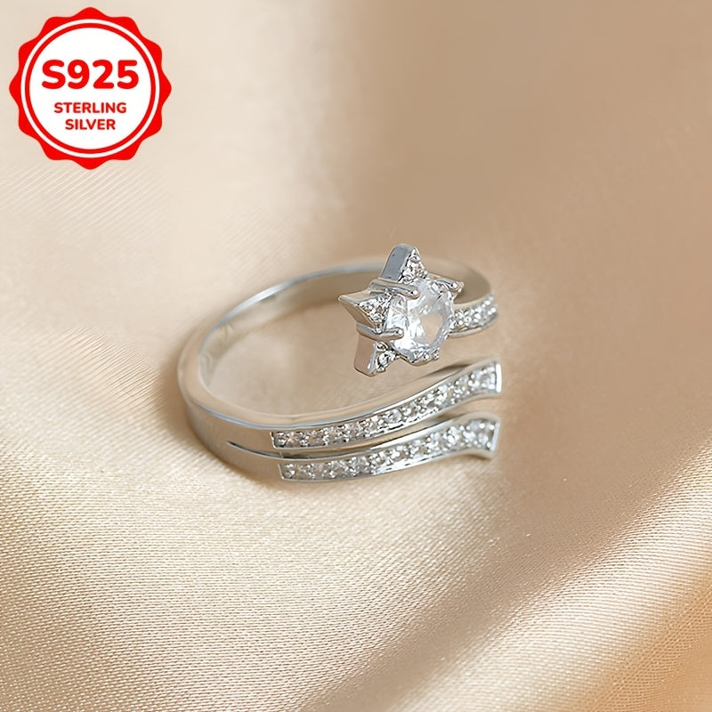 Elevate your casual attire with this delicate open ring featuring double stars symbolizing the 4 seasons. Crafted in synthetic Zirconia set on 925Silvery, this lightweight piece weighs 3.9g.