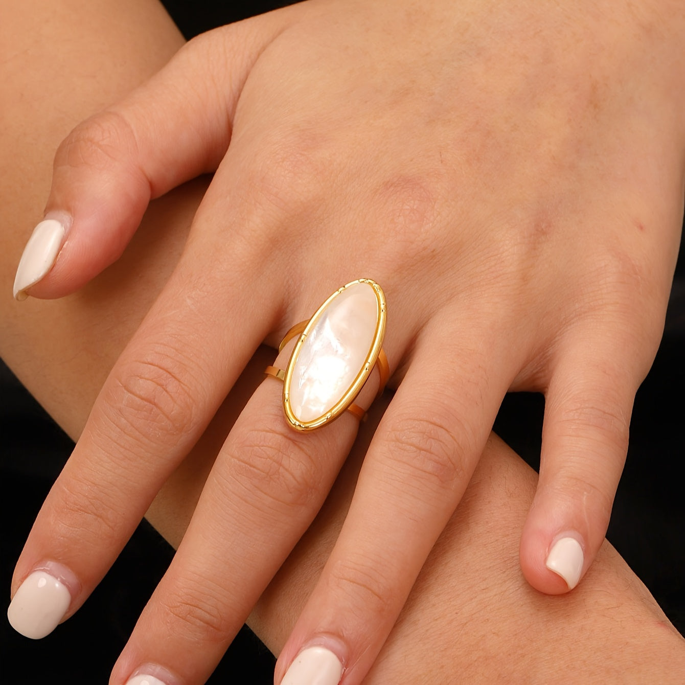 This stainless steel ring features natural iridescent mother of pearl, making it a versatile gift for teachers, back to school, graduation, or any season. Add a touch of bohemian style to any outfit!