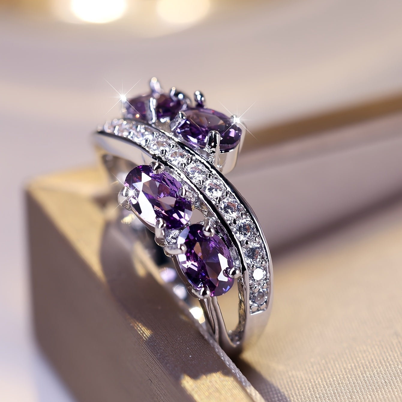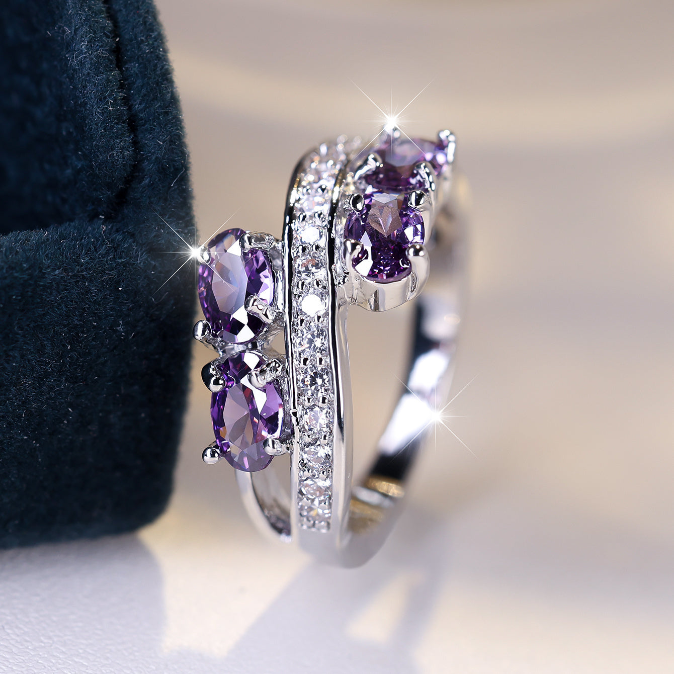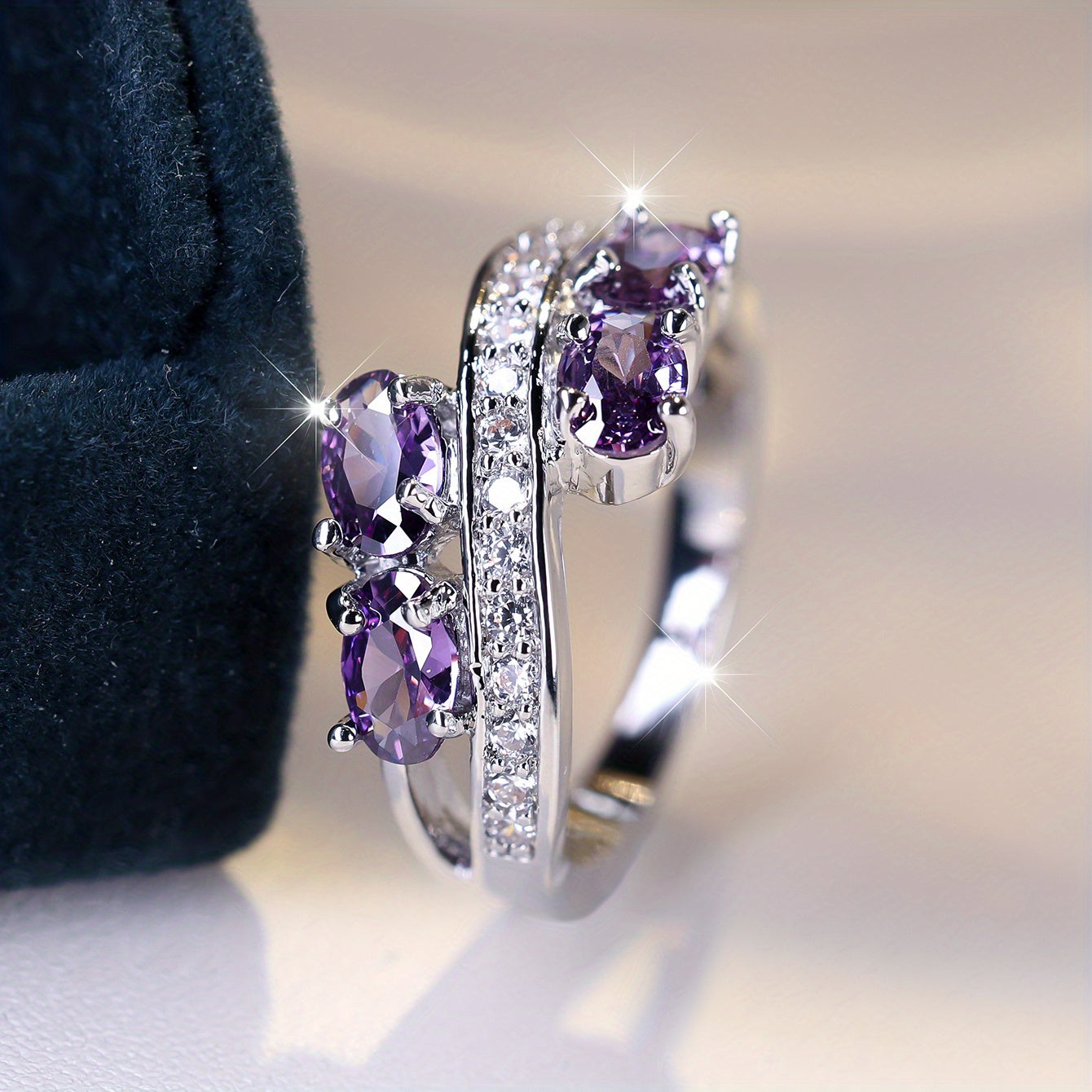 Add a touch of creativity to your wedding with this uniquely designed purple zirconia ring that exudes style and personality.