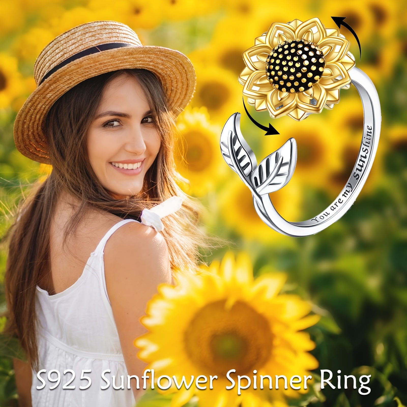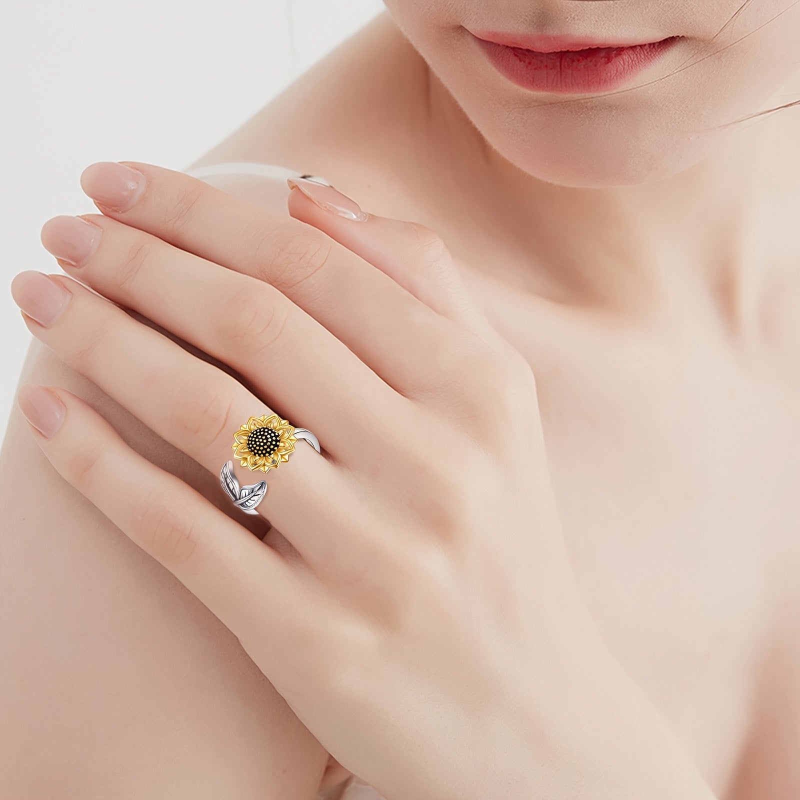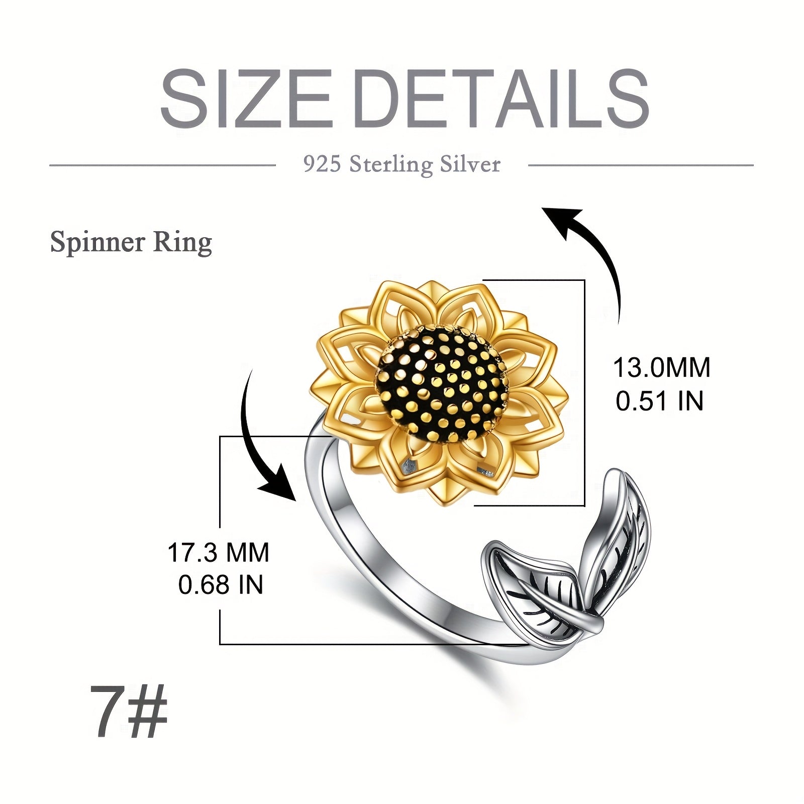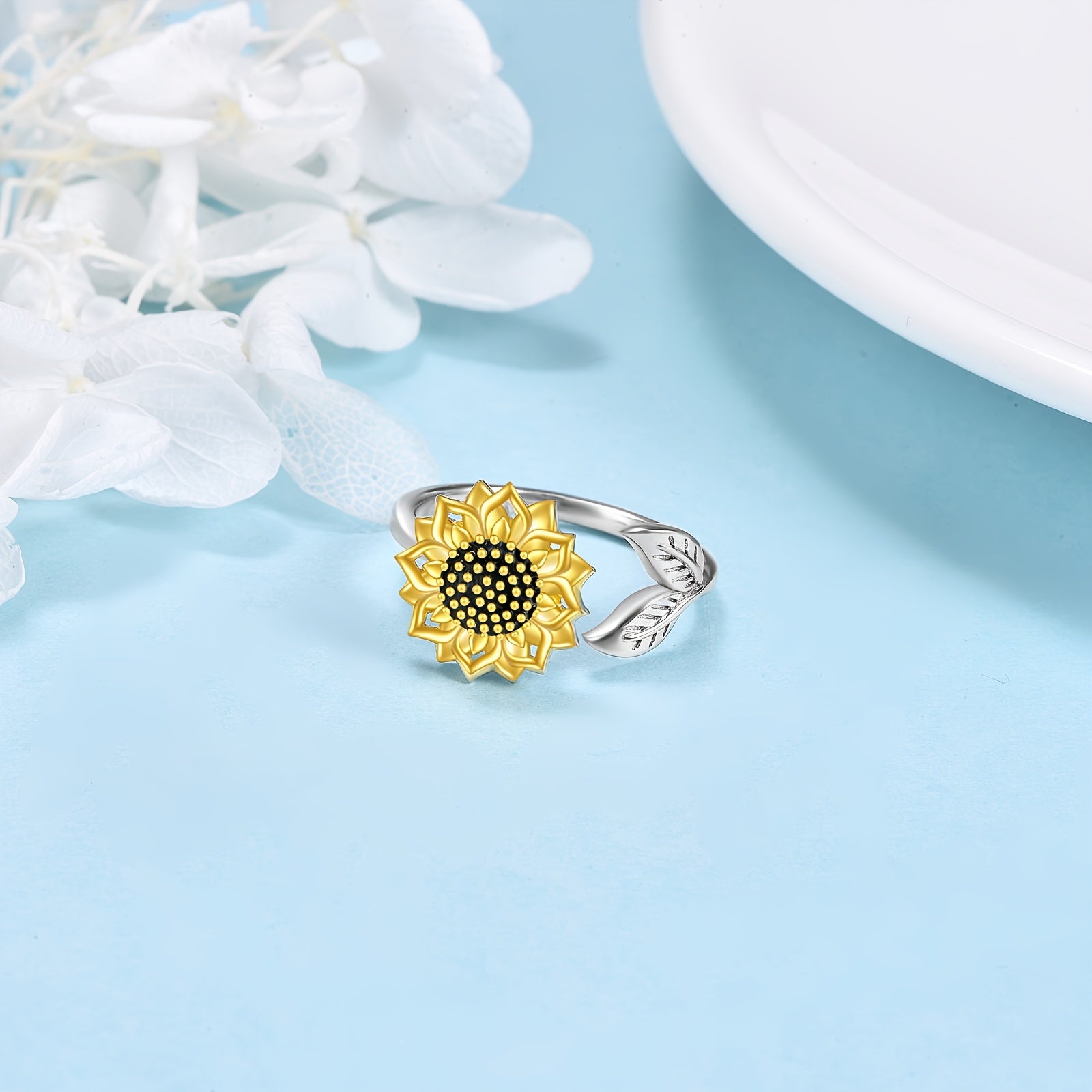 Elegant sunflower spinner ring crafted from 925 sterling silver. Perfect for women who love unique and stylish jewelry pieces.