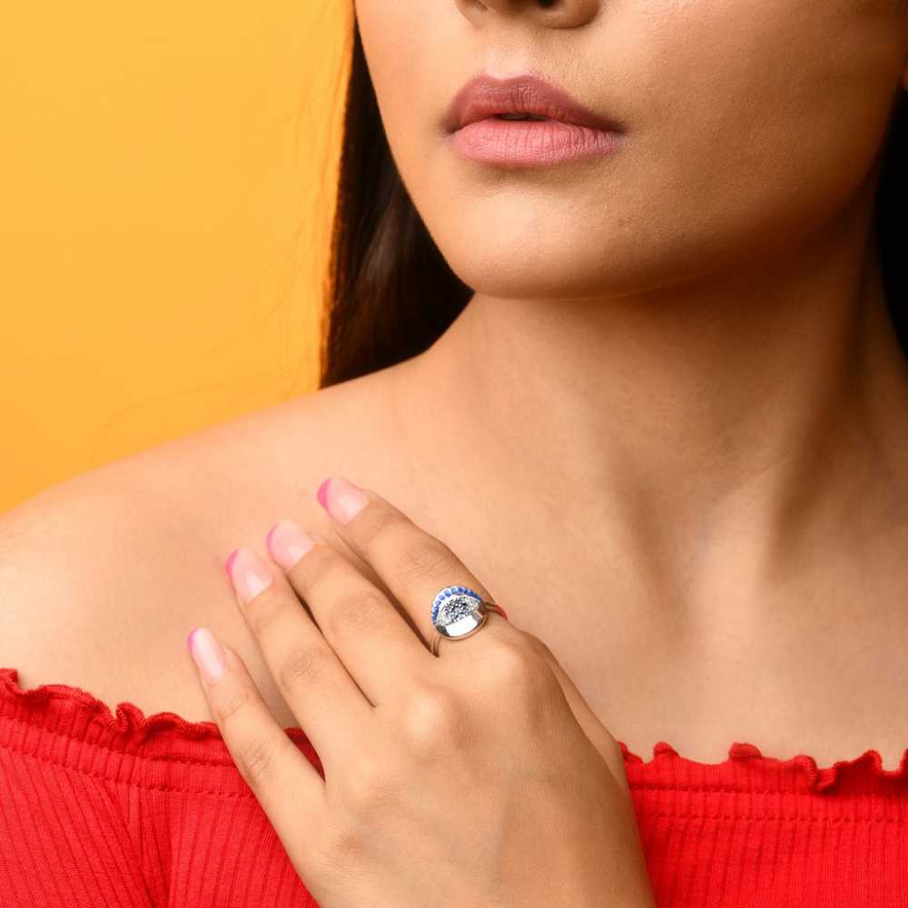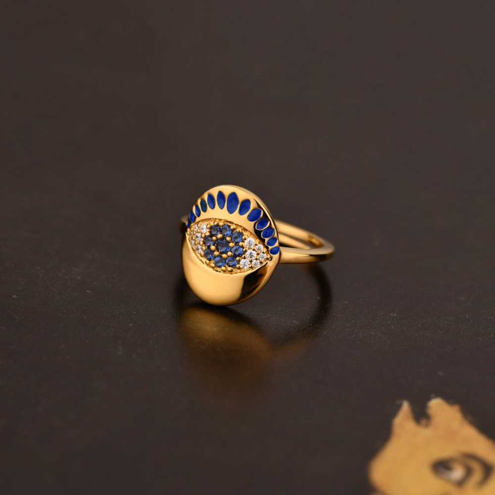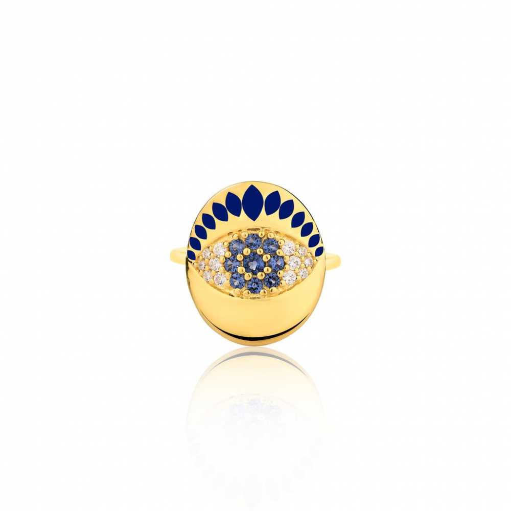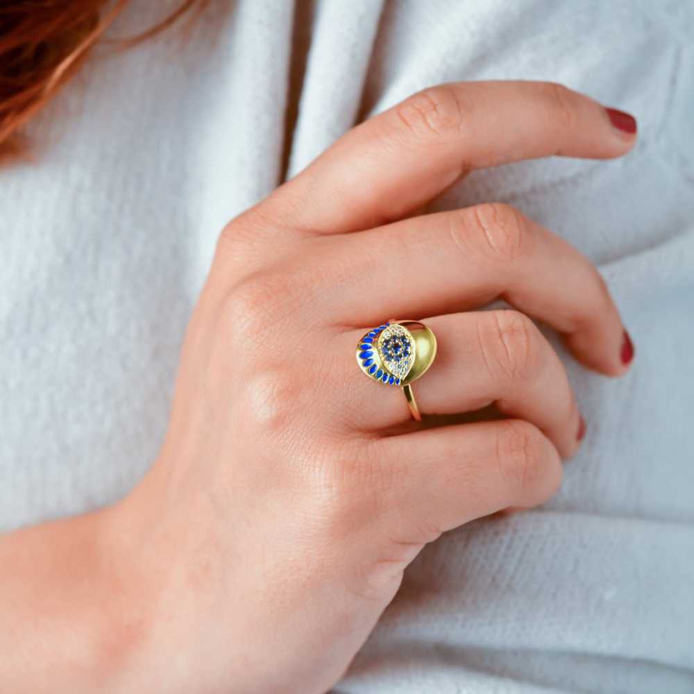Cette bague ajustable de protection contre le mauvais œil est un doux rappel qu'il faut répandre l'amour et la positivité. La bague est ornée de zircones cubiques et d'émail. Elle peut être portée en toutes occasions.