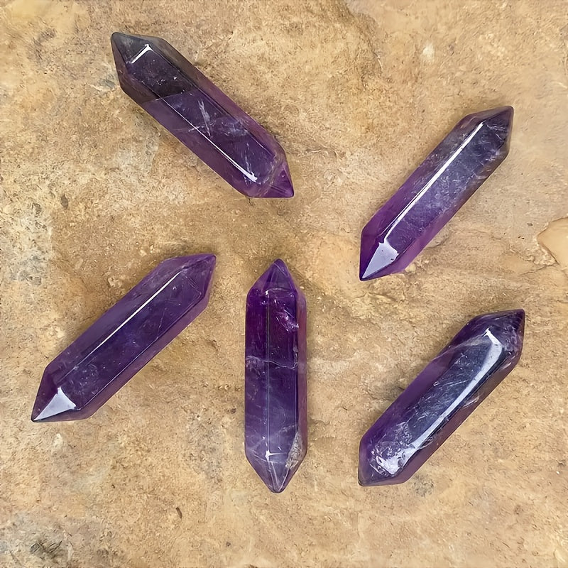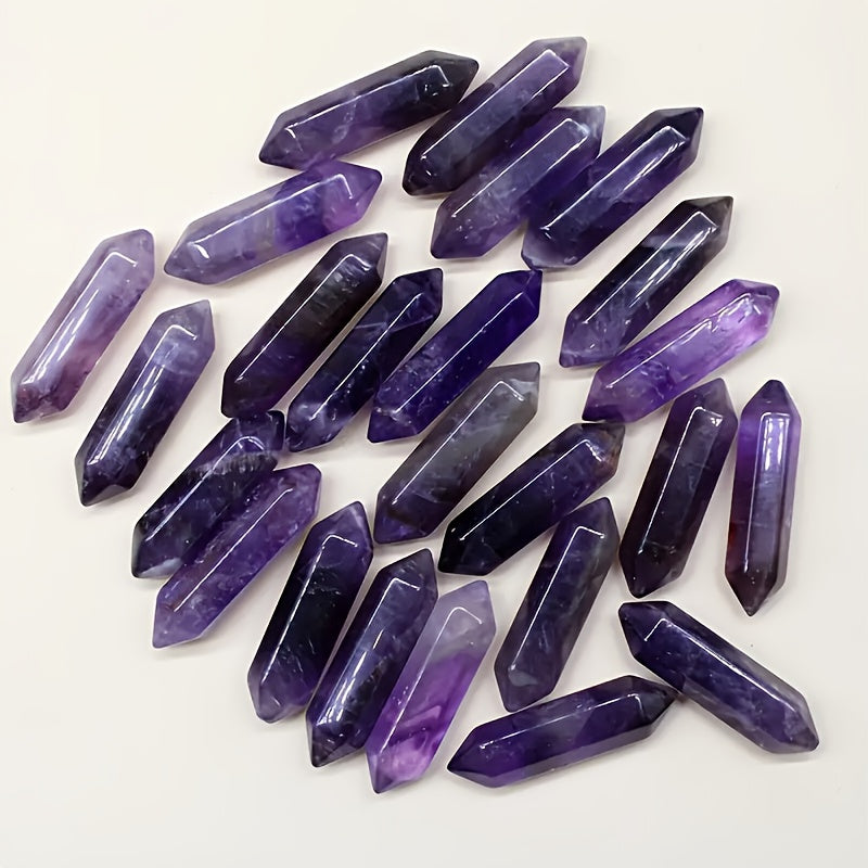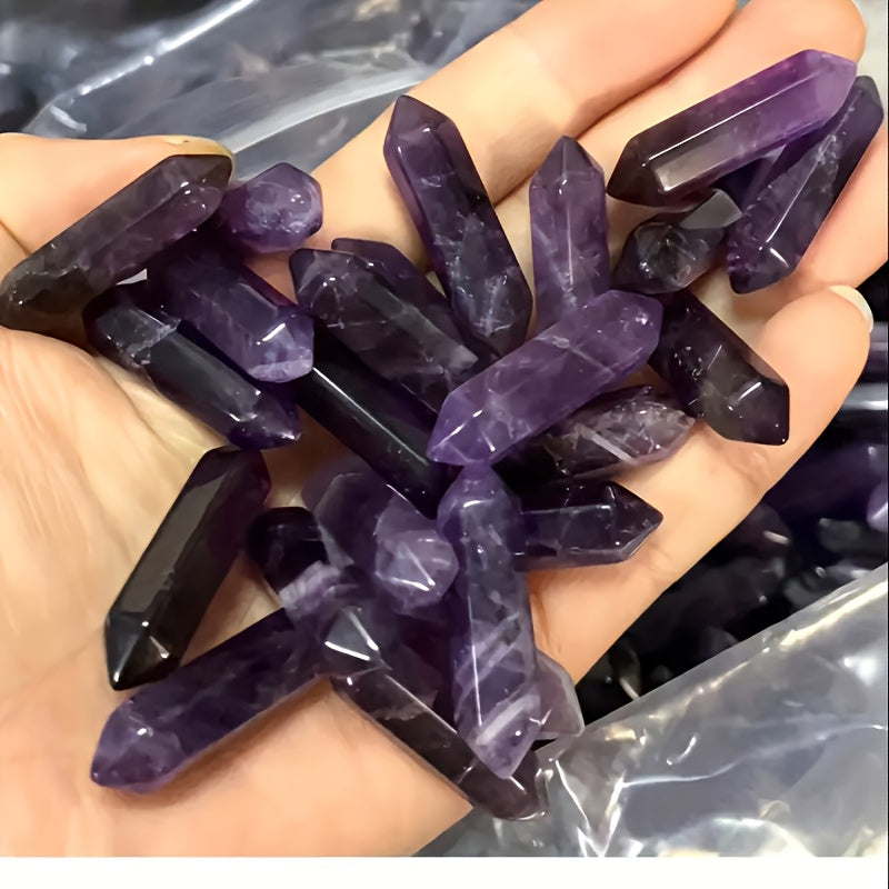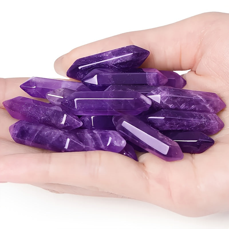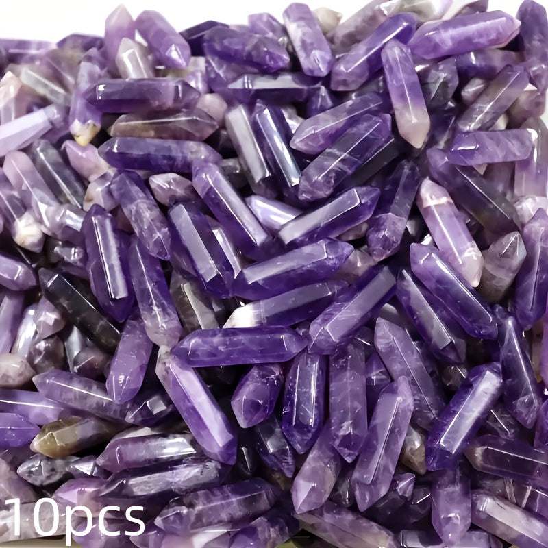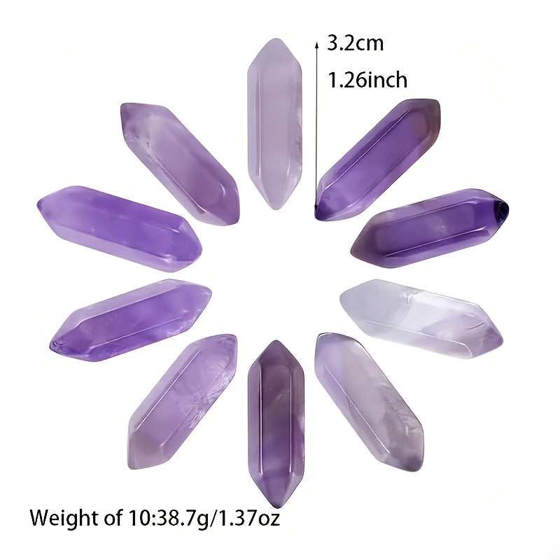 This set of 10 natural amethyst double pointed hexagonal column polished stones is perfect for office and home decorations. Each stone is unique and stylish, adding a touch of elegance to any space.
