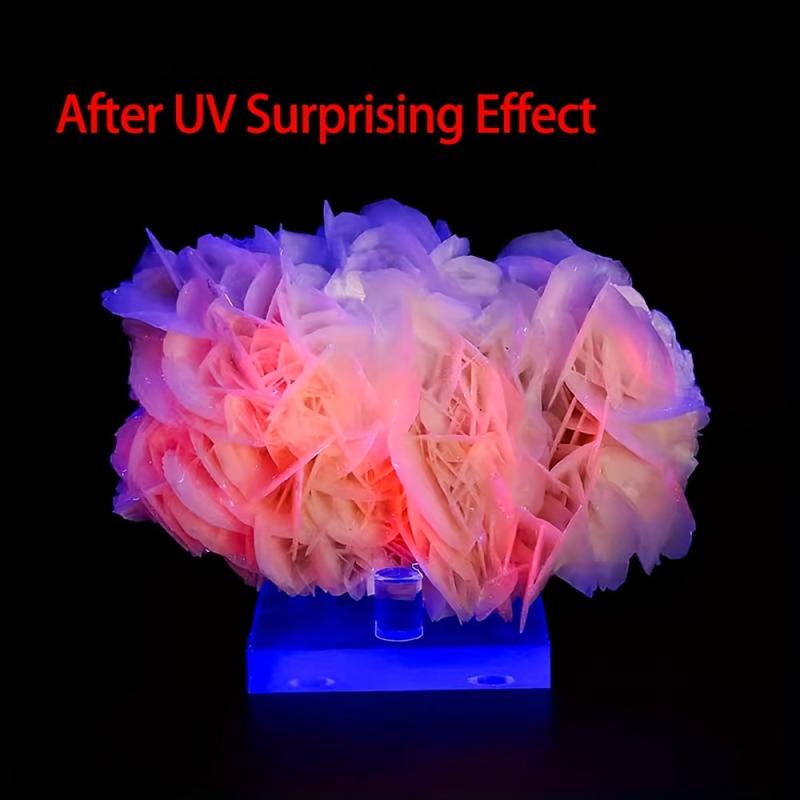 Add a unique touch to your jewelry making or home decor with this extra rare reactive fluorescent Rose Calcite crystal cluster. It glows under blacklight, making it a stunning addition to any collection.