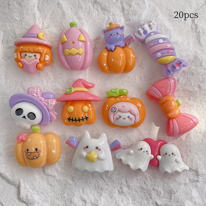 Enhance your Halloween DIY projects with this pack of 20 cartoon-themed resin ornaments. Perfect for creating unique hair accessories and adding a spooky touch to your crafts.