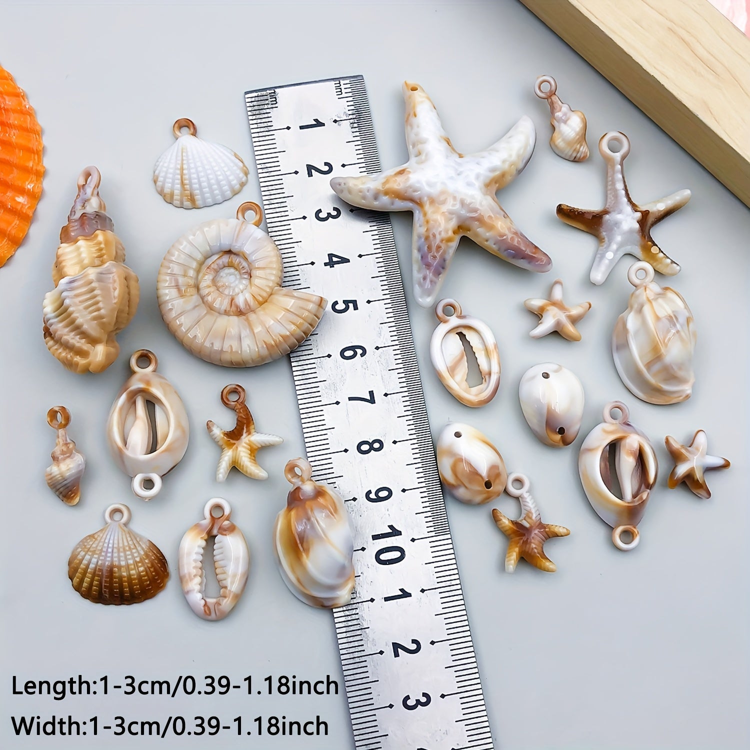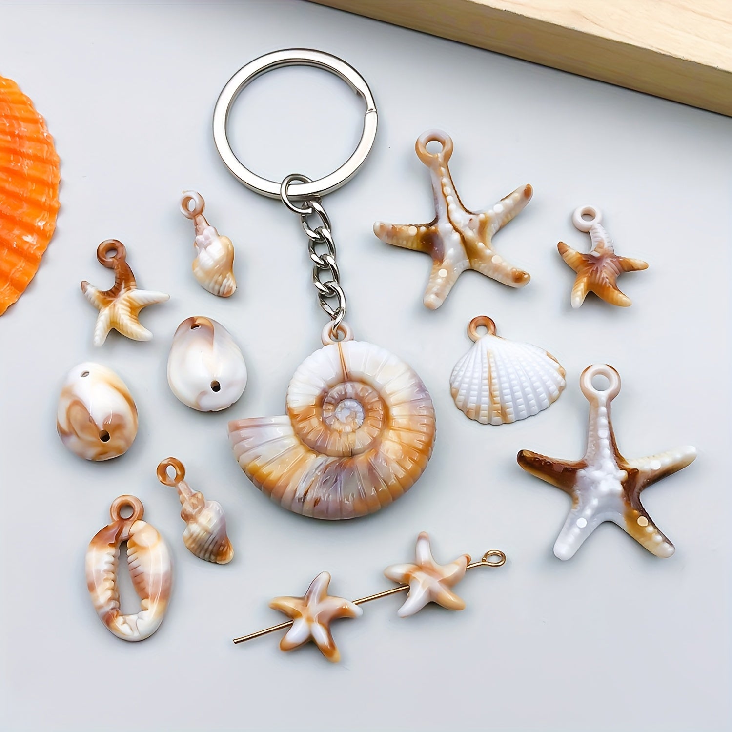 Add a touch of the sea to your jewelry creations with this set of 24 ocean-themed acrylic charms featuring shells, sea stars, and conchs. Perfect for DIY projects and crafting.