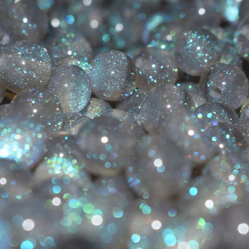 These synthetic round beads feature iridescent shimmer and are perfect for creating bracelets, necklaces, and other DIY crafts. Add a touch of sparkle to your projects with these grey glitter beads.