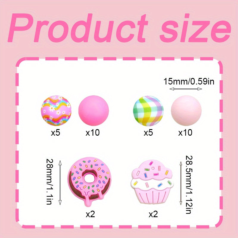 This set includes a variety of donut and cupcake elements silicone beads perfect for creating jewelry and decoration pieces. Ideal for earrings and other accessories.