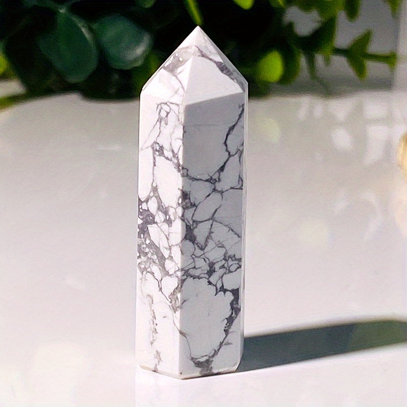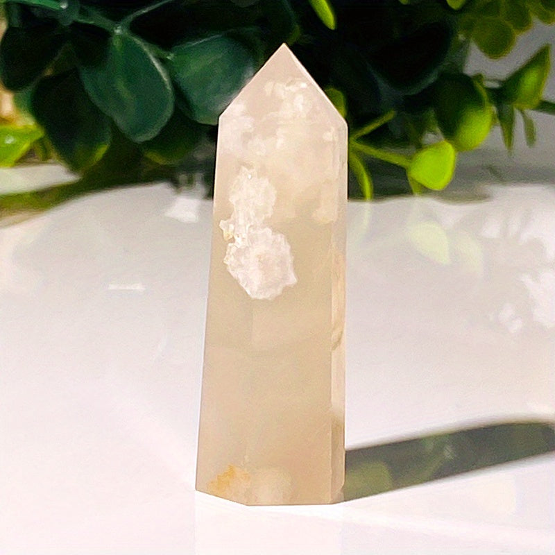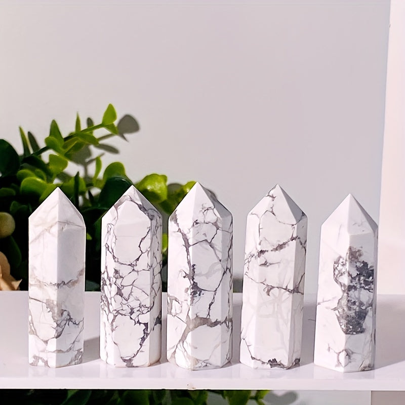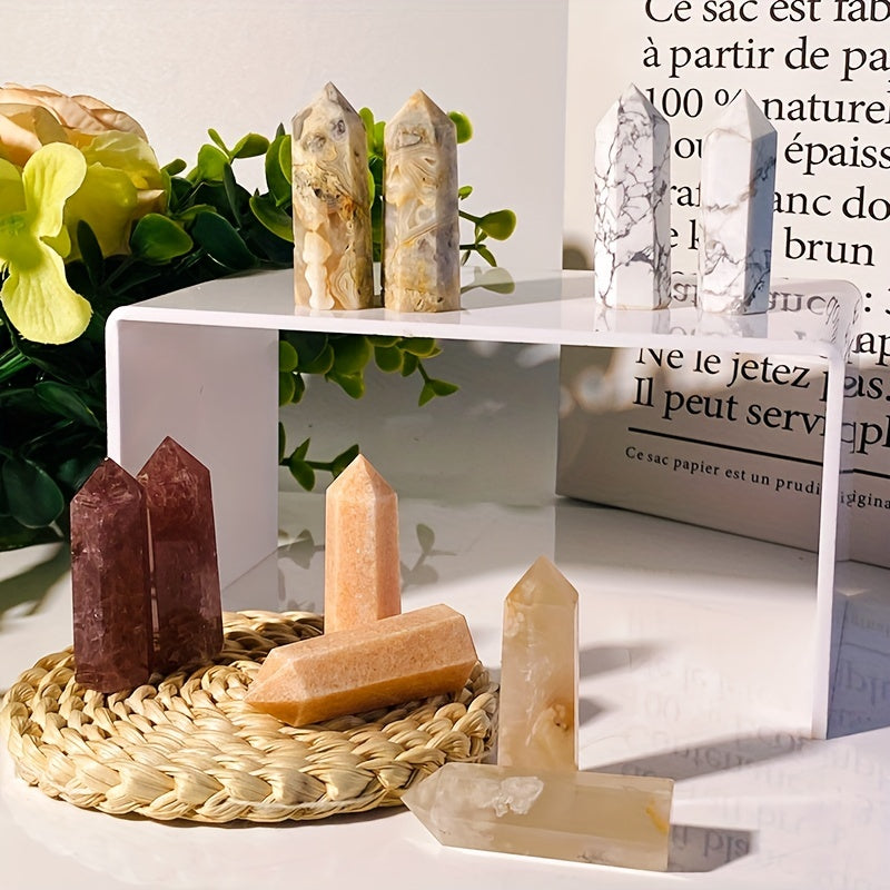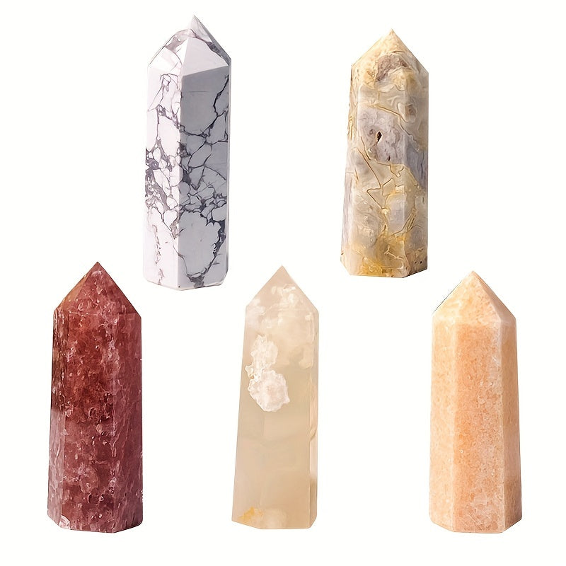 Enhance your space with this set of 4 natural gem healing stones - Howlite, Flower Agate, Sun Stone, and Quartz Point. Perfect for healing and decoration purposes.
