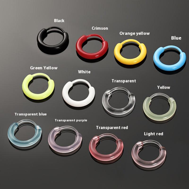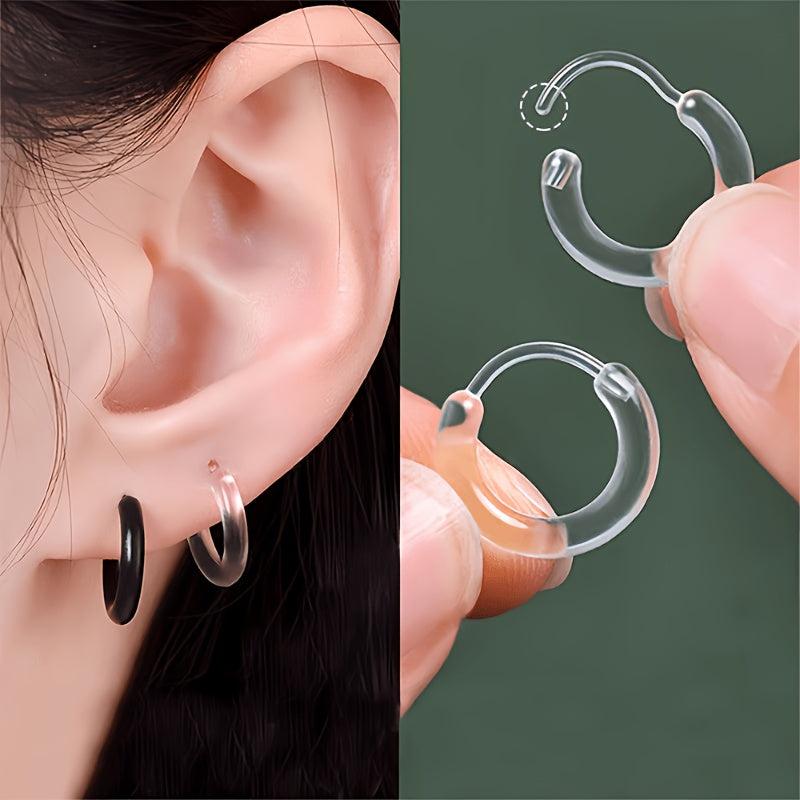 Get this set of 4 minimalist resin ring earrings and transparent invisible studs that require no piercing. They are comfortable and safe for women to wear.