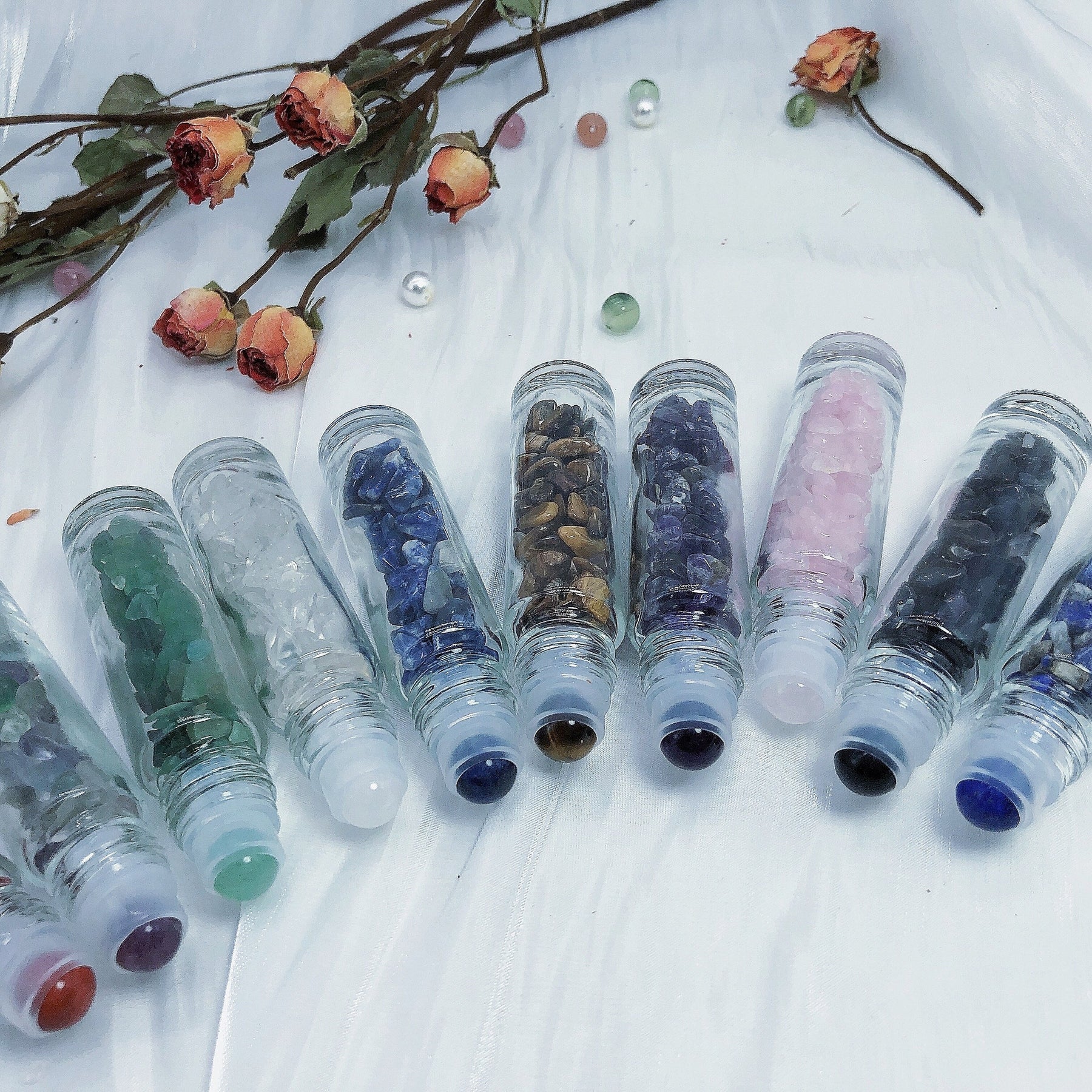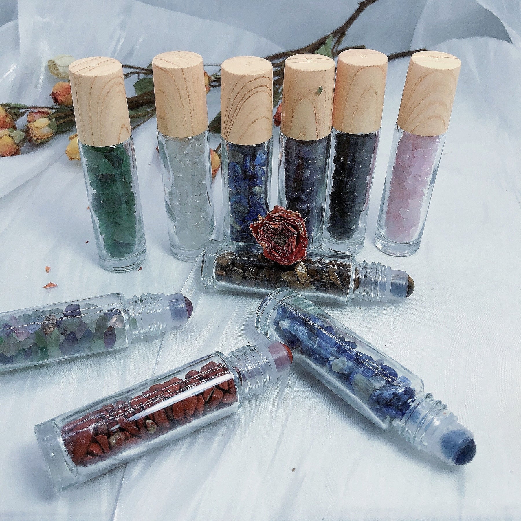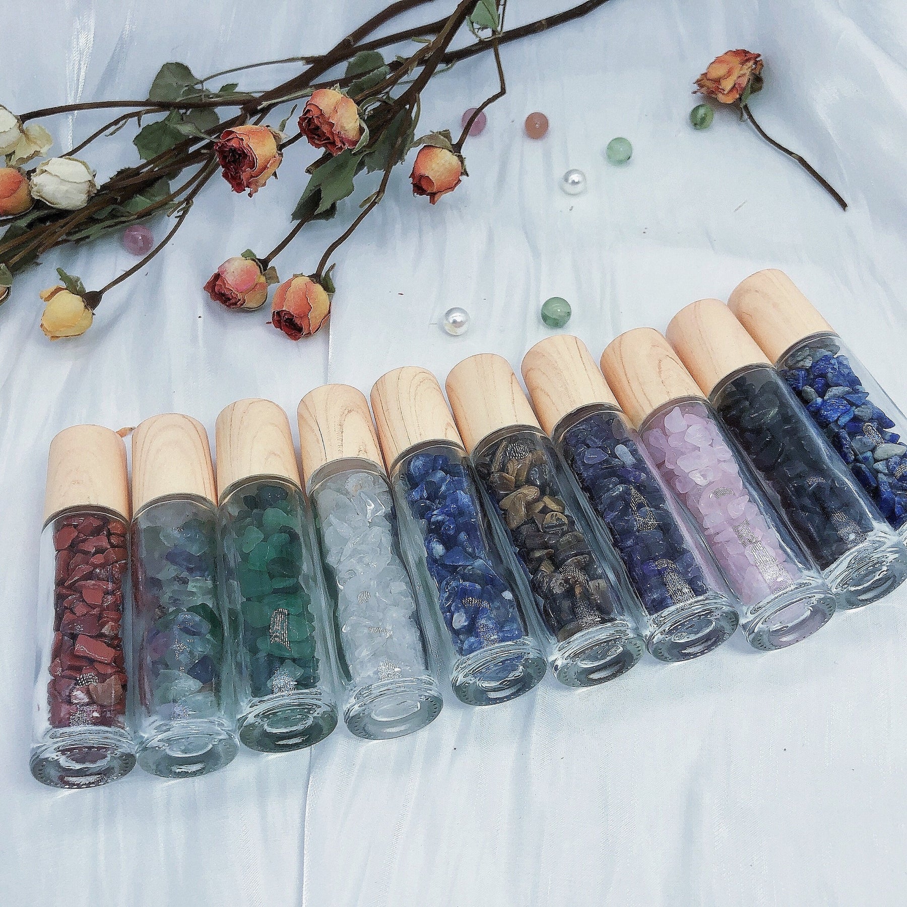 This set includes 5 10ml essential oil glass bottles made with natural gemstones, perfect for traveling or carrying your favorite scents on the go.