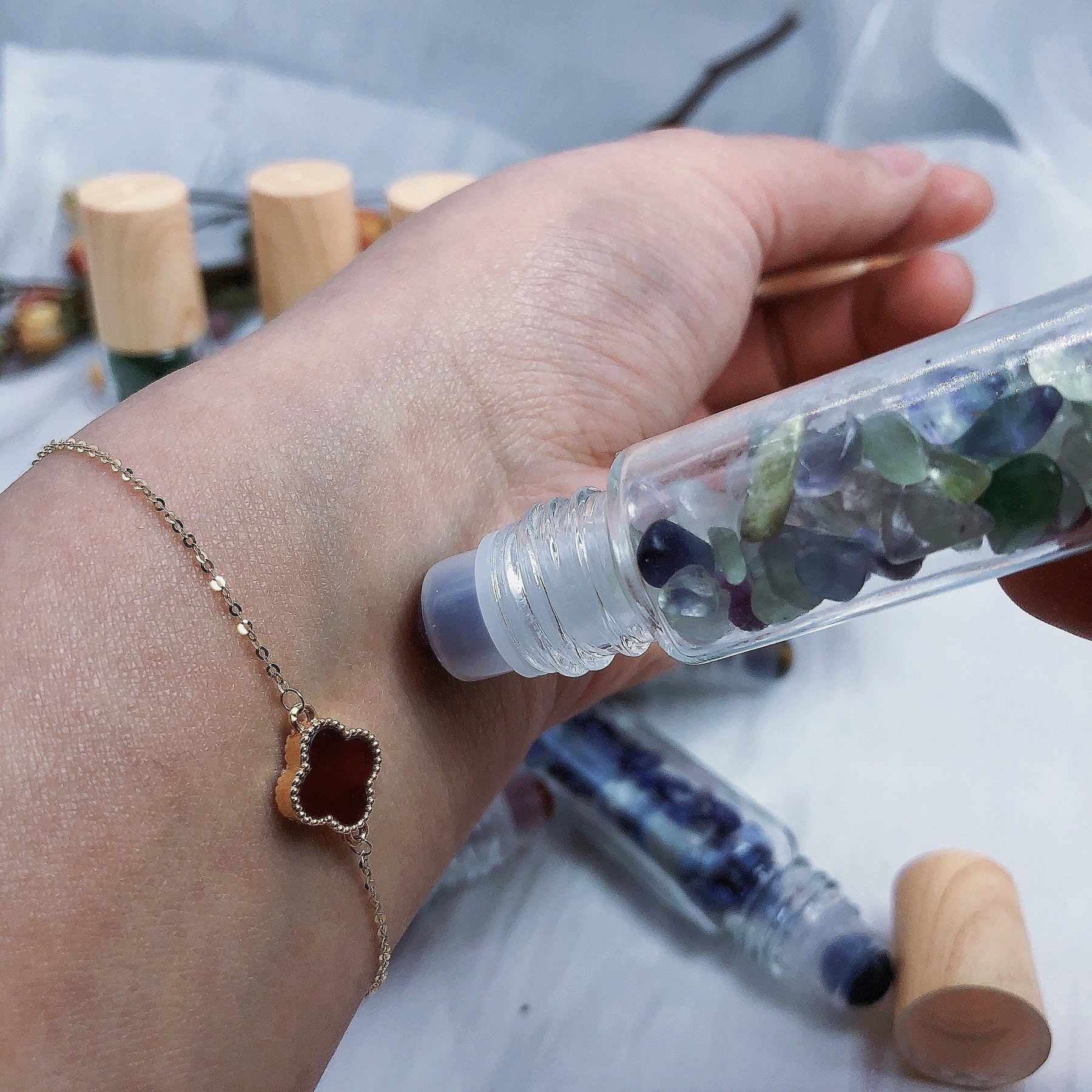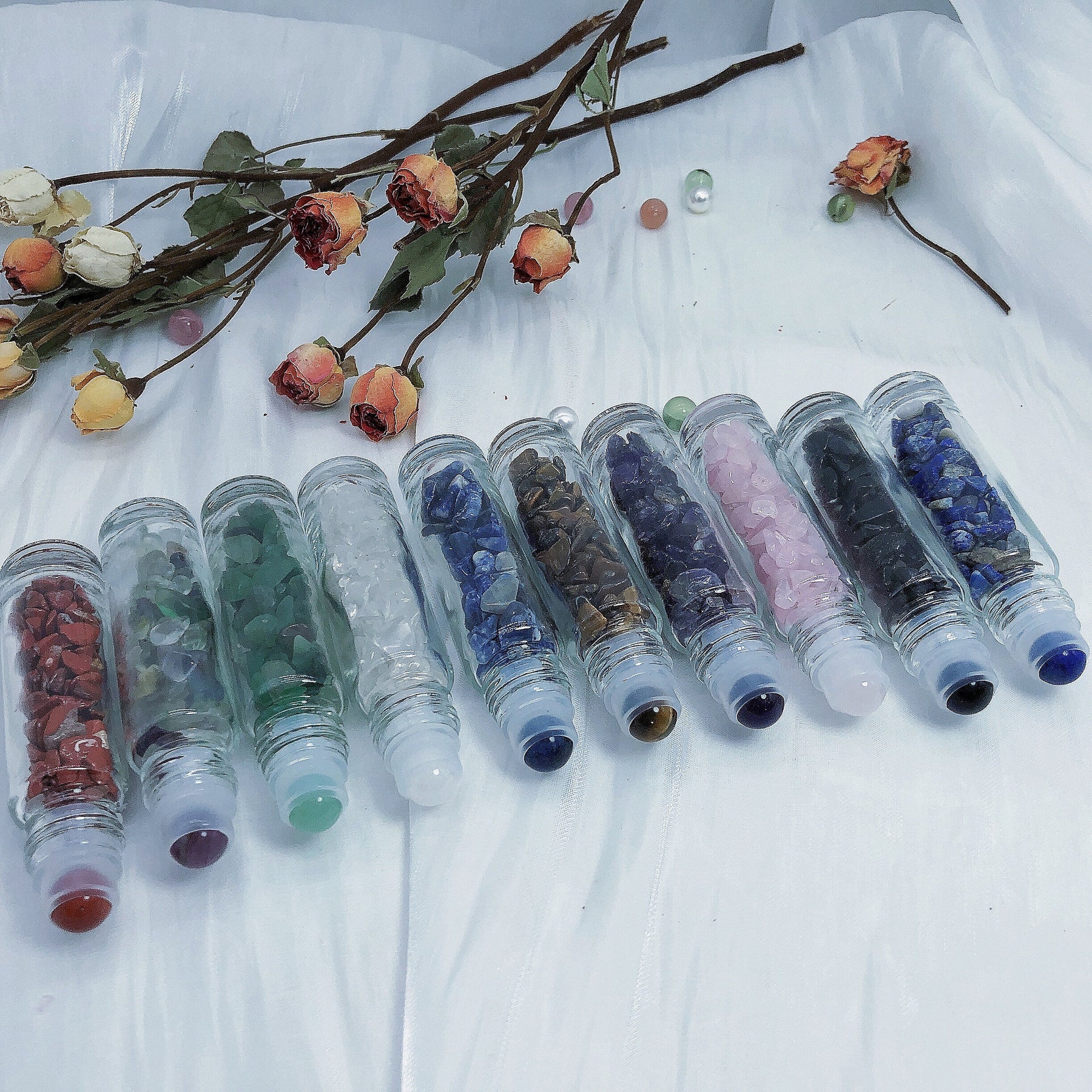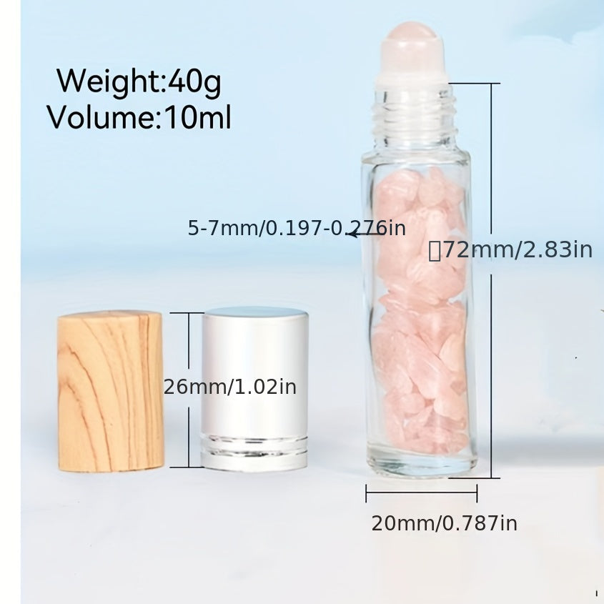 This set includes 5 10ml essential oil glass bottles made with natural gemstones, perfect for traveling or carrying your favorite scents on the go.