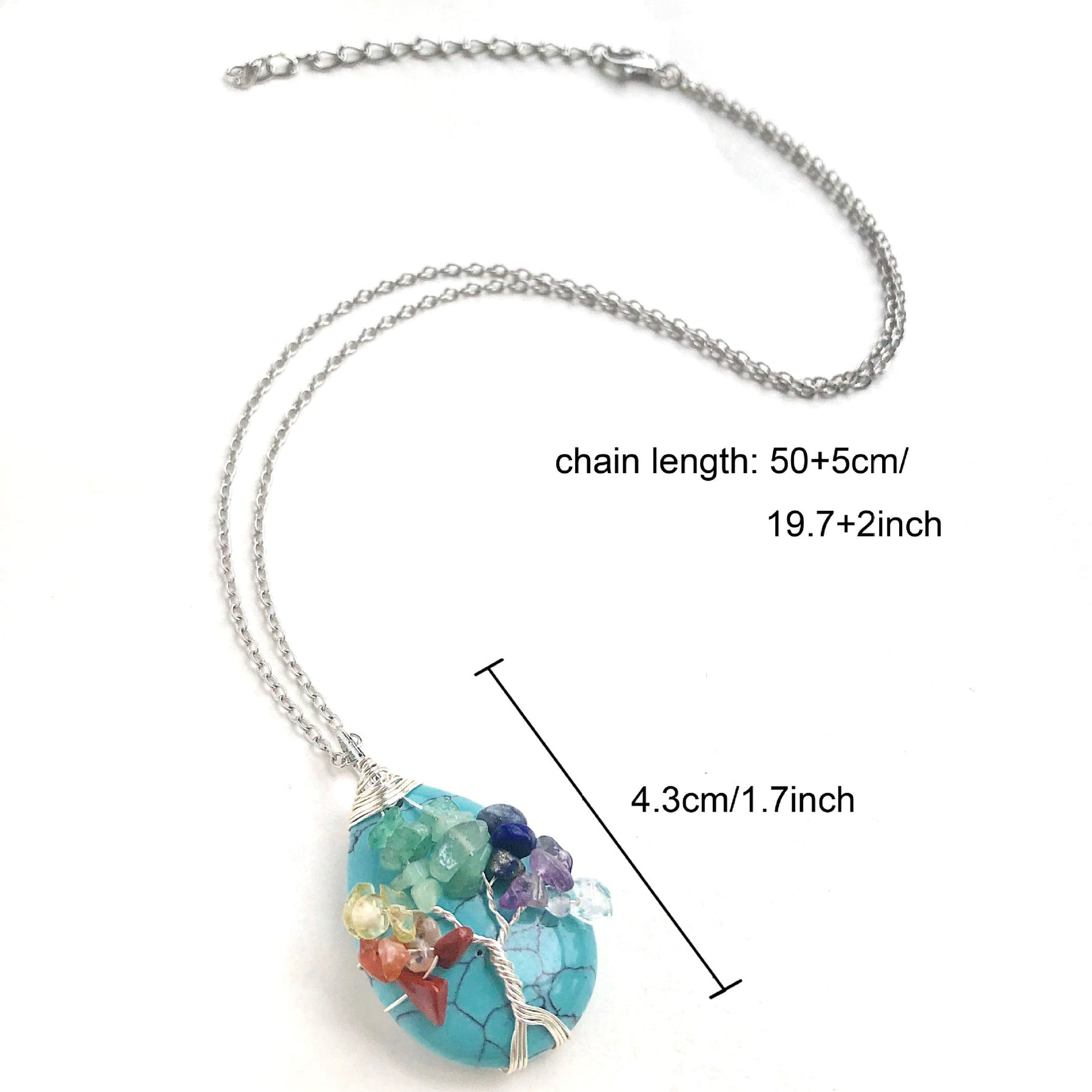 This beautiful necklace features a Tree of Life design with 7 chakra agate gemstones in a water drop shape. It is a powerful chakra healing amulet that brings balance and positive energy.