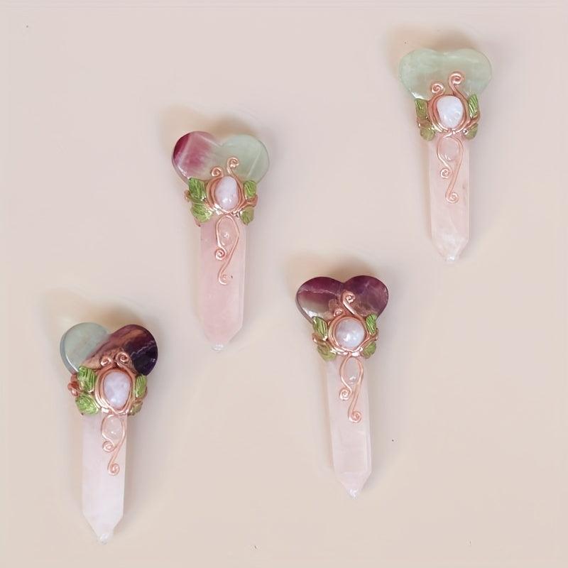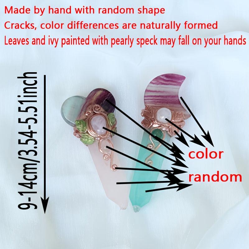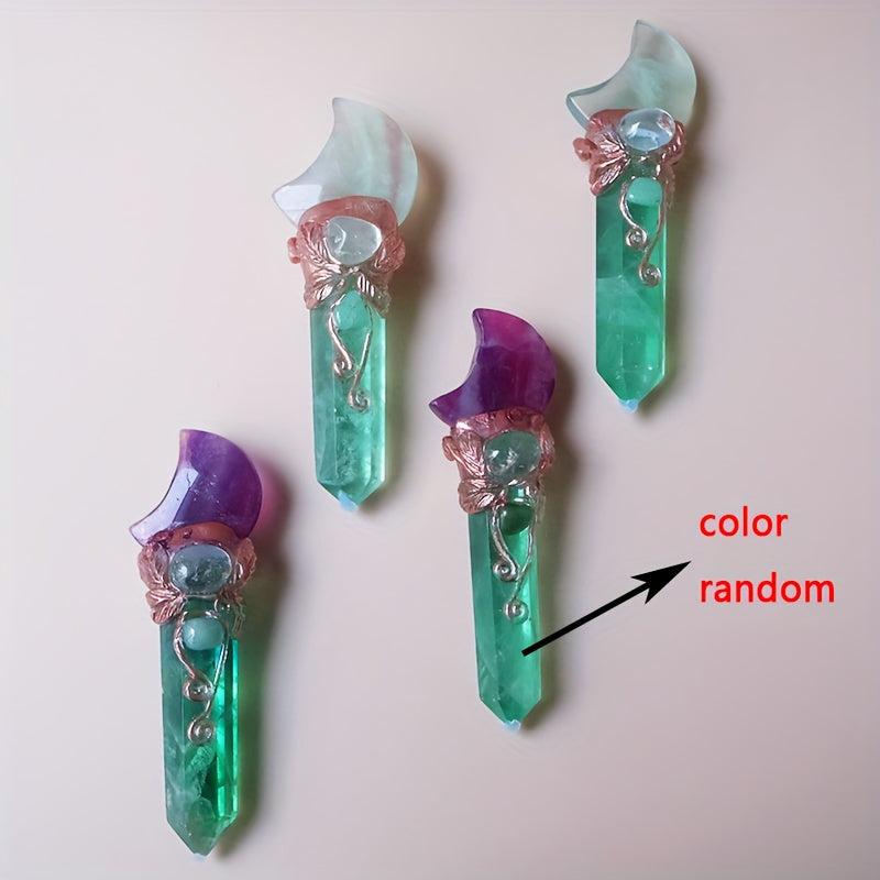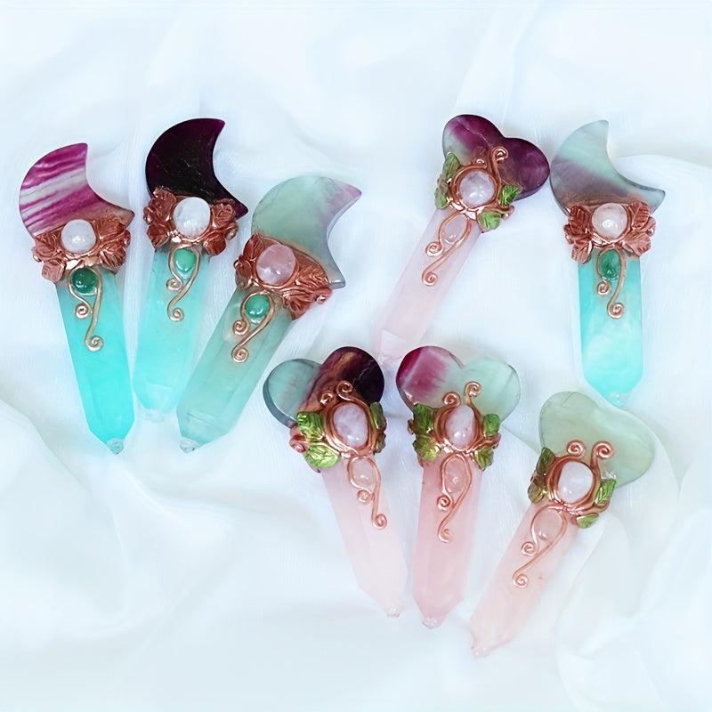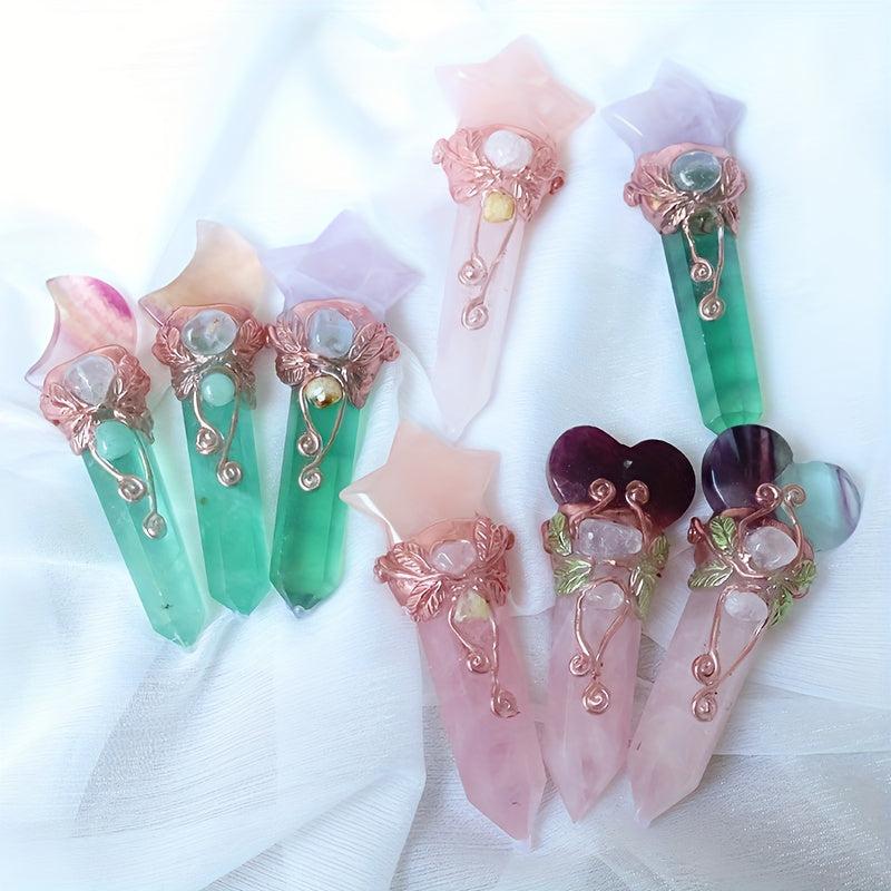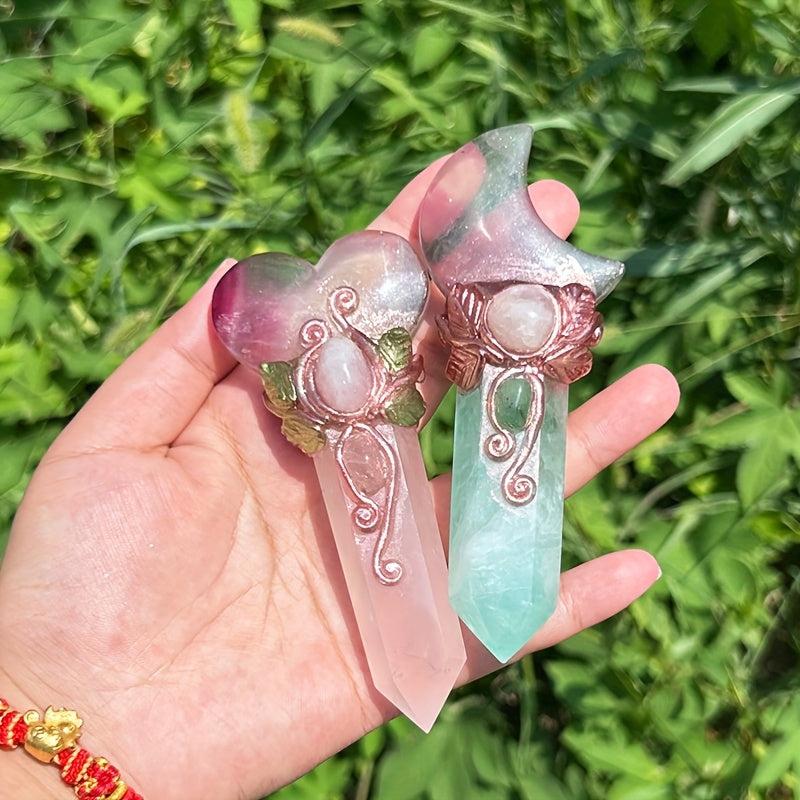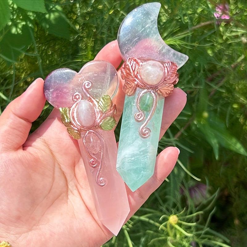 This magical wizard staff features a swirl of multicolor crystal and fluorite hearts and moons with stunning golden accents throughout.