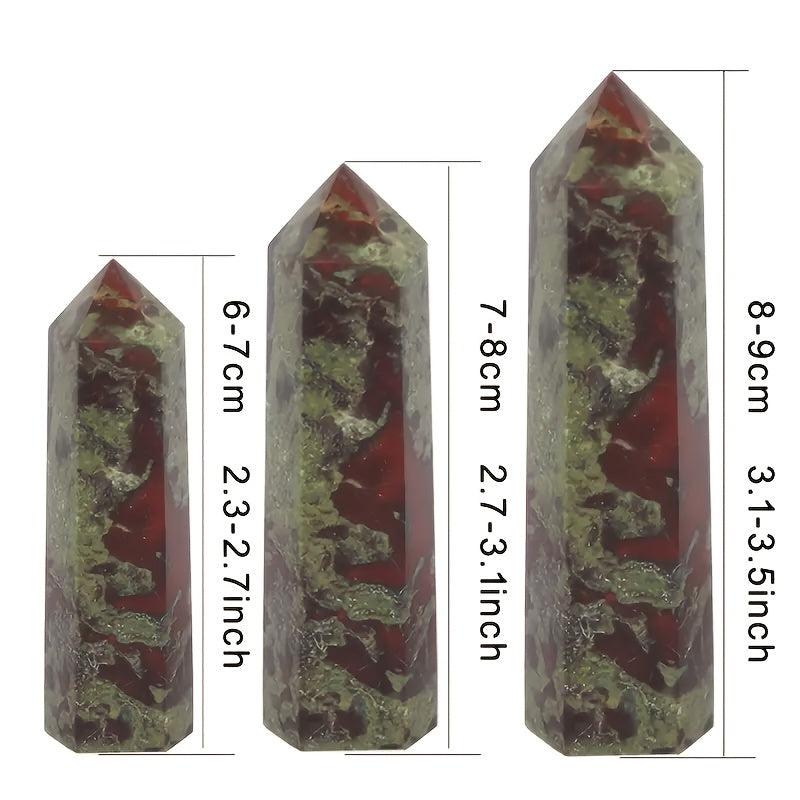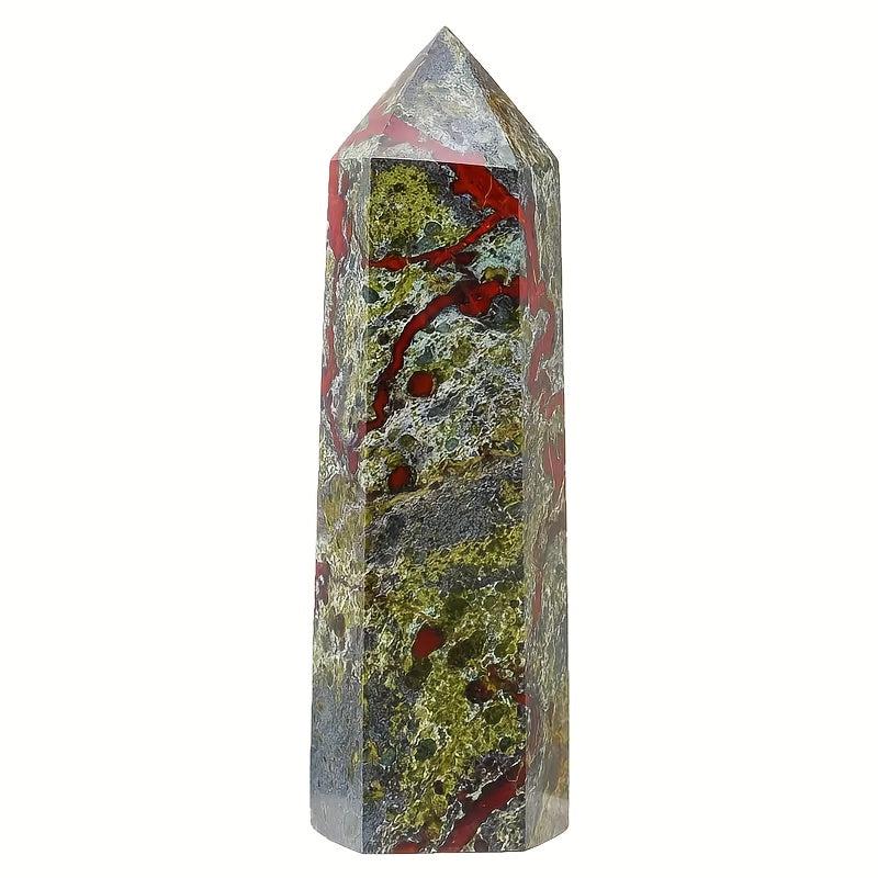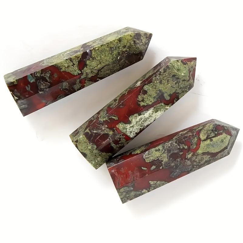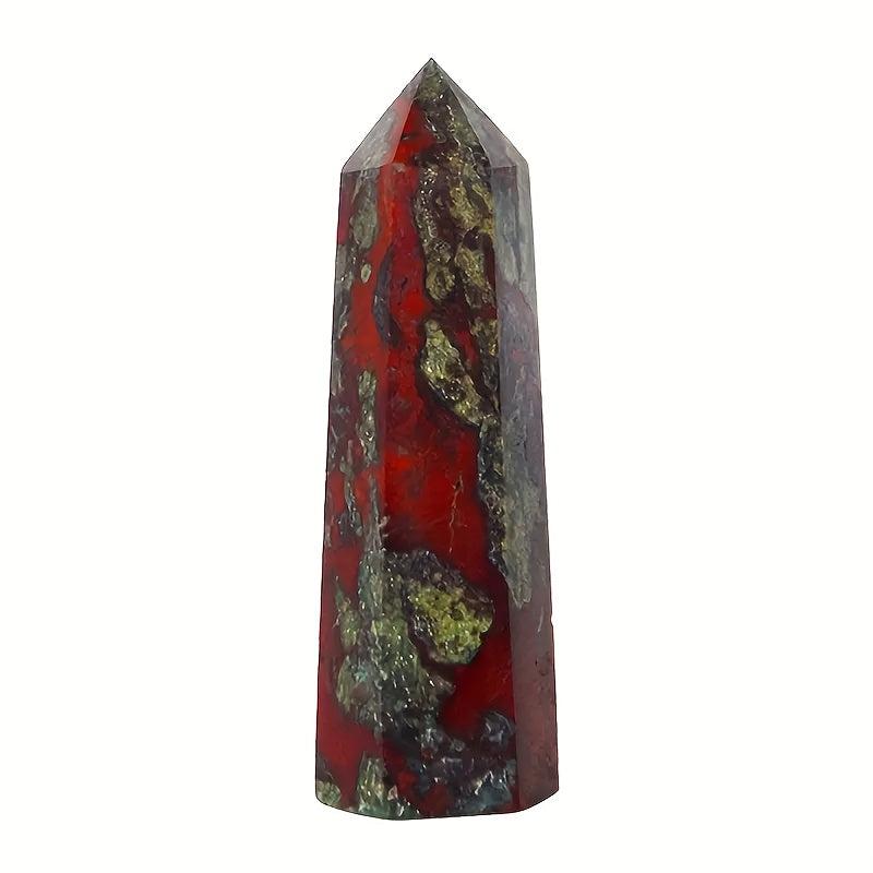 Experience the power of Dragon's Blood Stone with this boho natural crystal wand. The wand features a pointed 6 hedron section carved mineral stone.
