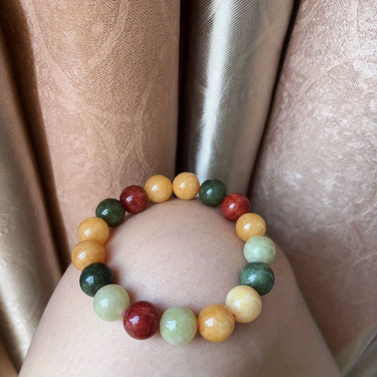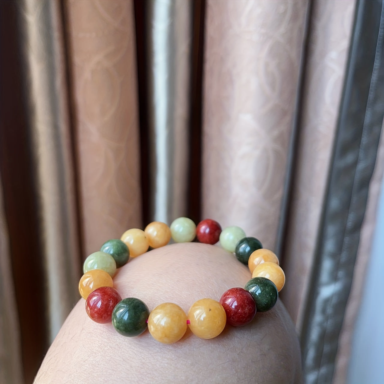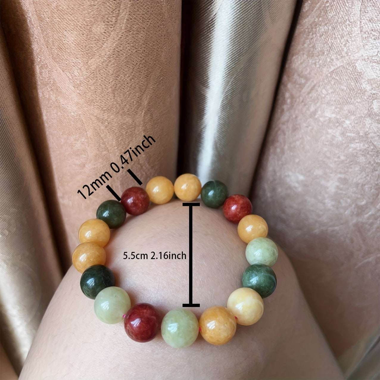 This bracelet features a combination of jade and red agate beads on a hand string. The beads measure 12mm (0.47 inches) in size.