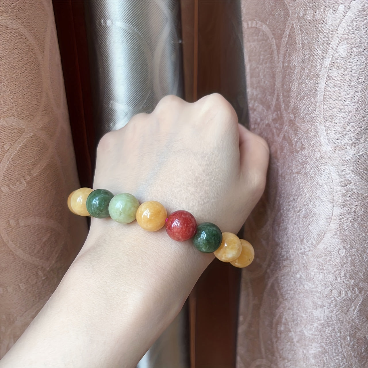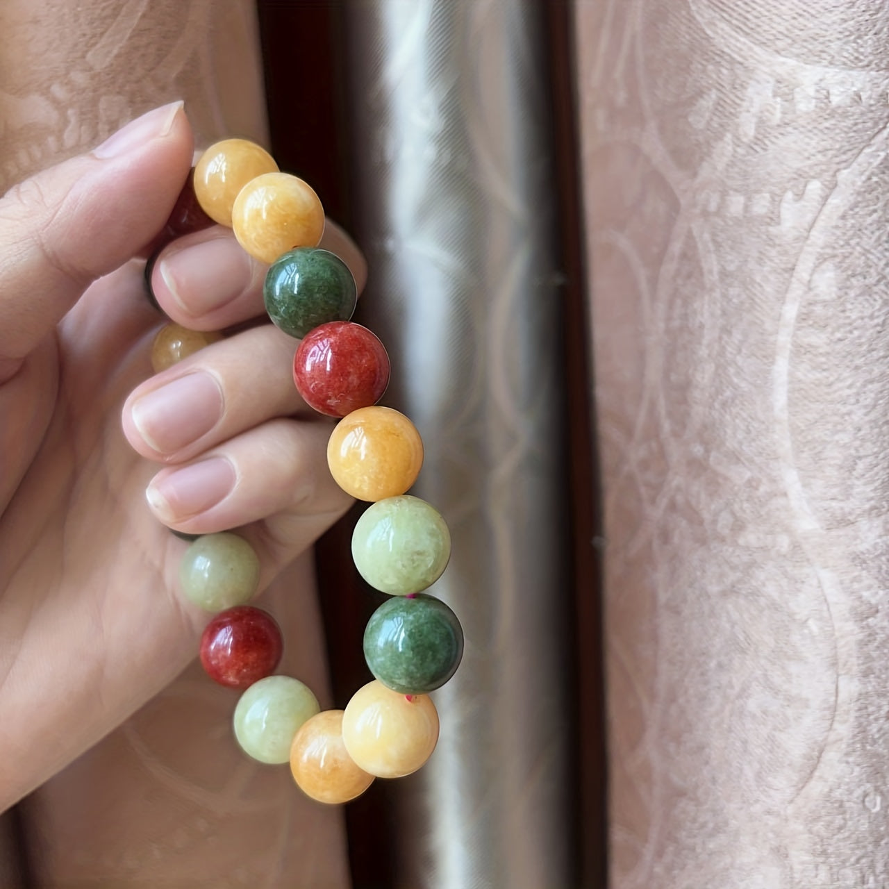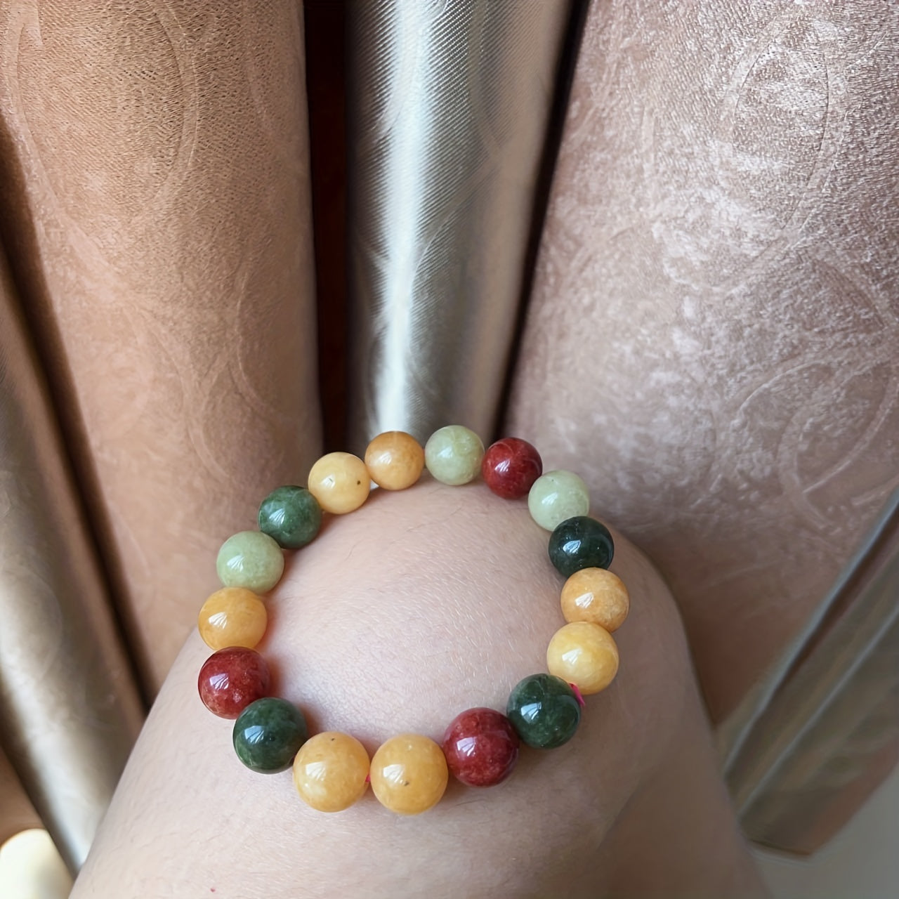 This bracelet features a combination of jade and red agate beads on a hand string. The beads measure 12mm (0.47 inches) in size.