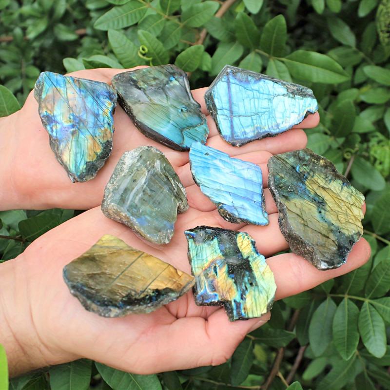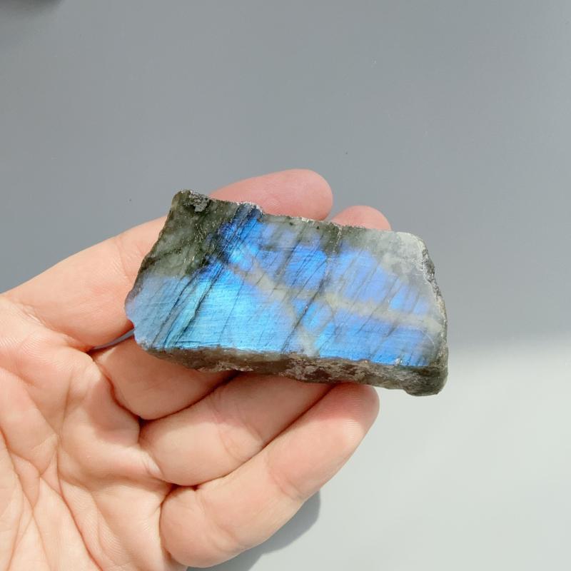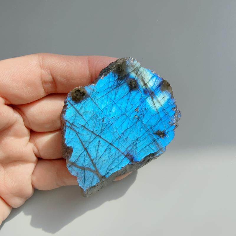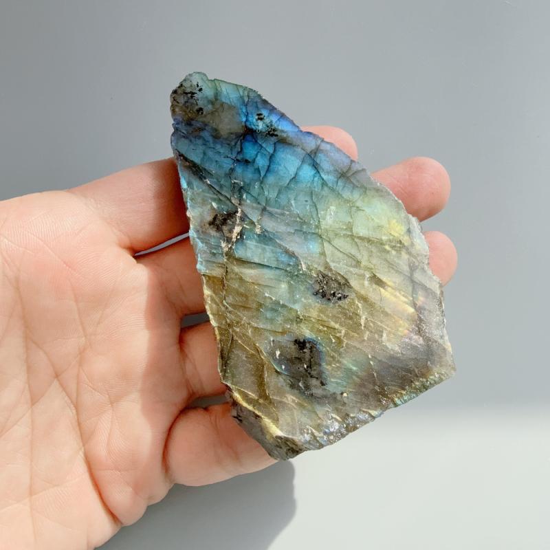 Enhance your interior with this natural Labradorite slab, showcasing its unique luminous and mesmerizing qualities. Perfect for adding a touch of elegance to any space.