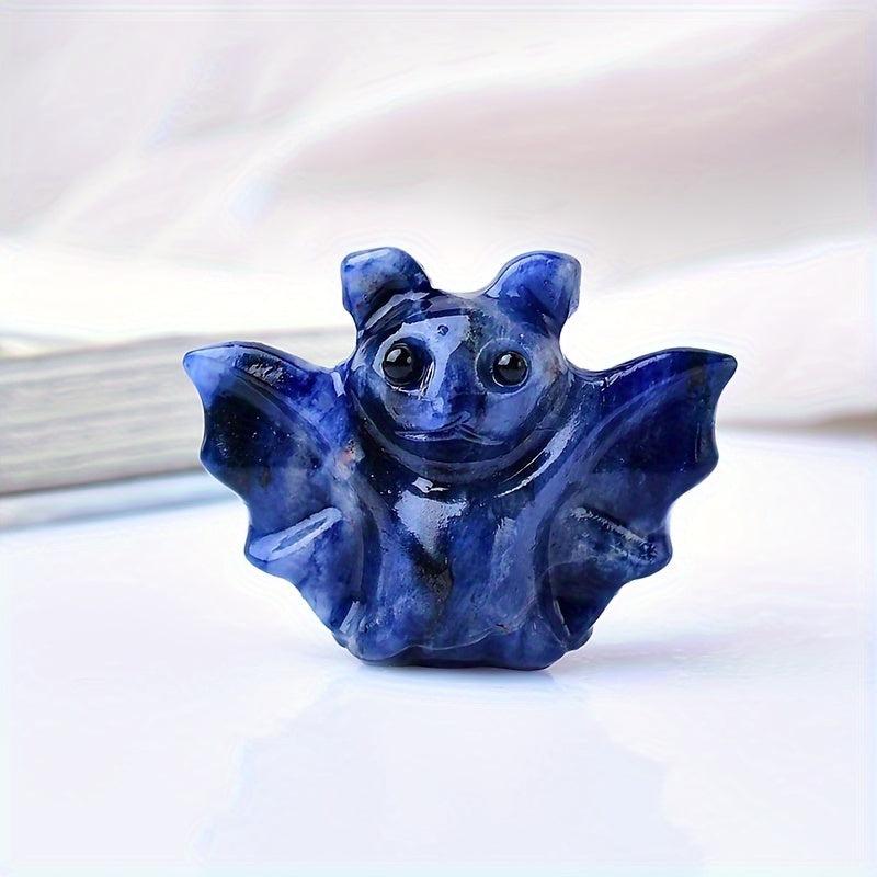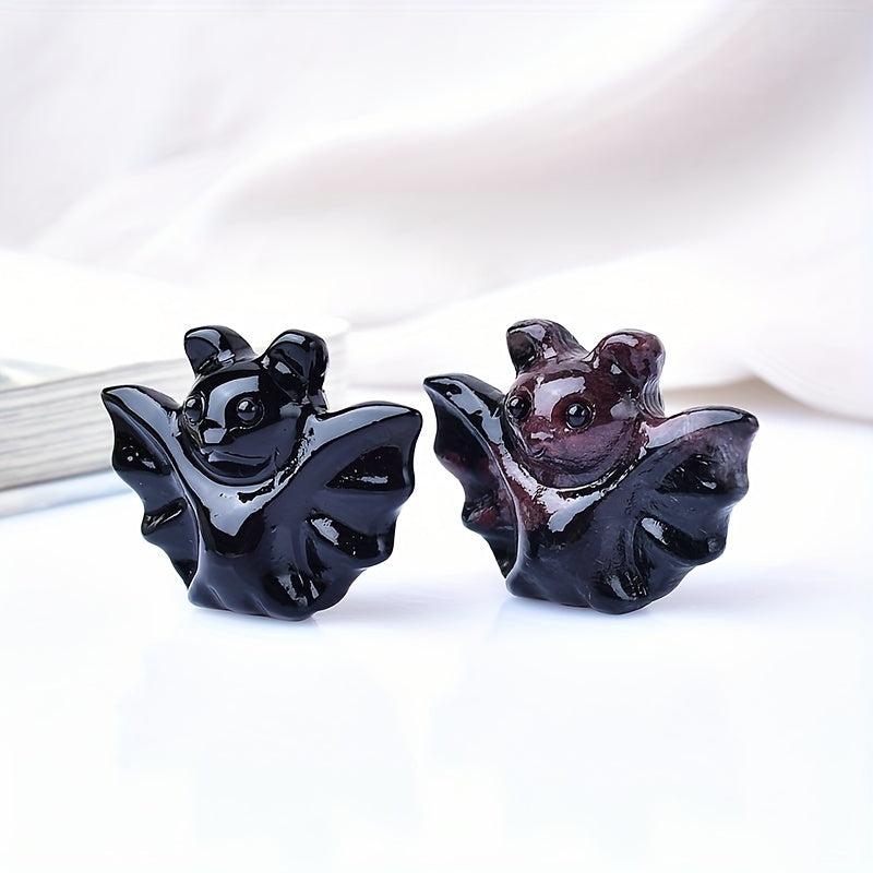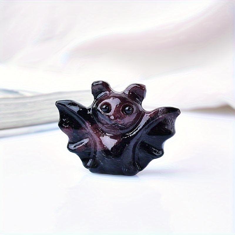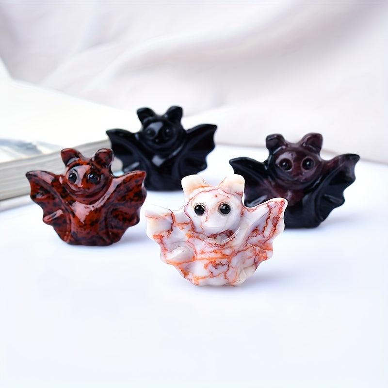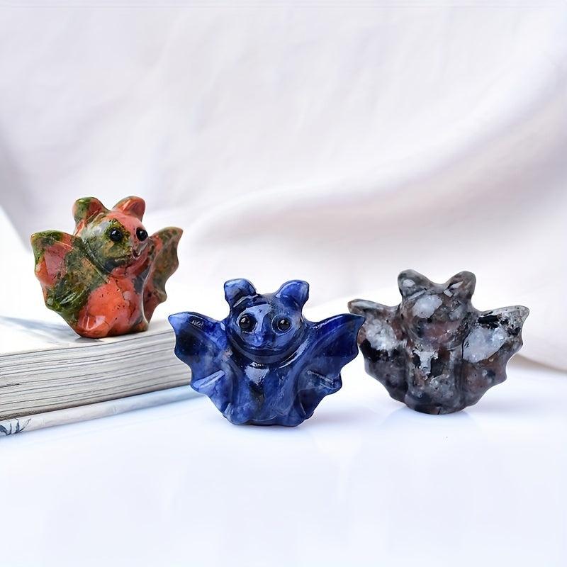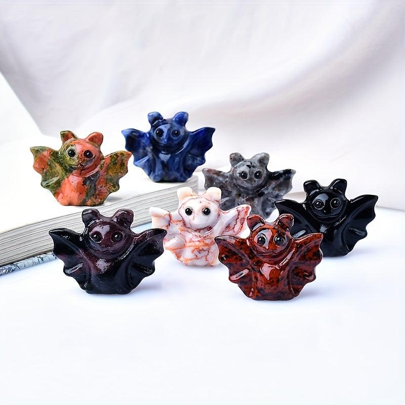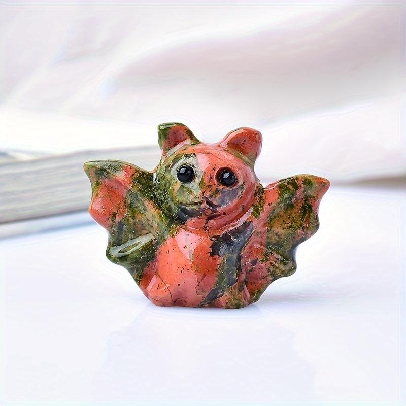 Enhance your home decor or jewelry making with this intricately hand-carved mini bat statue. Made from natural stone in green, grey, or red colors, it adds a touch of gothic charm to any setting.