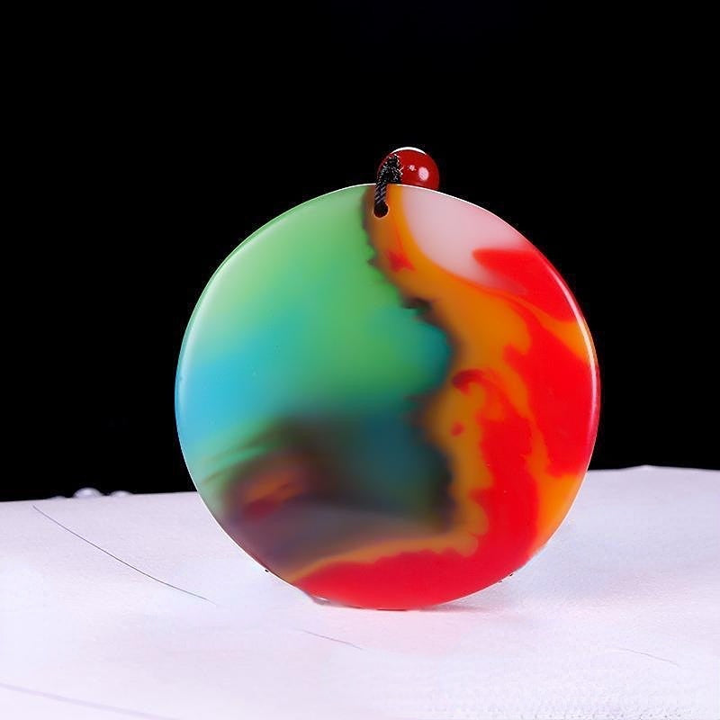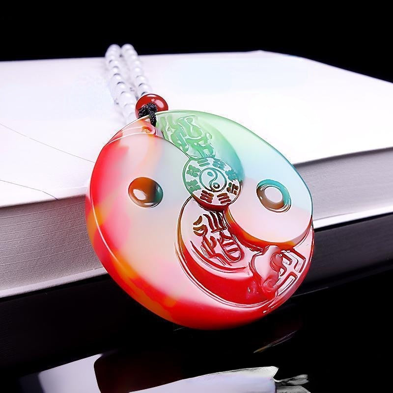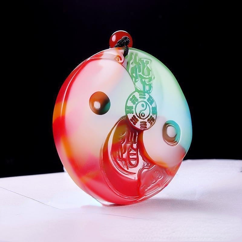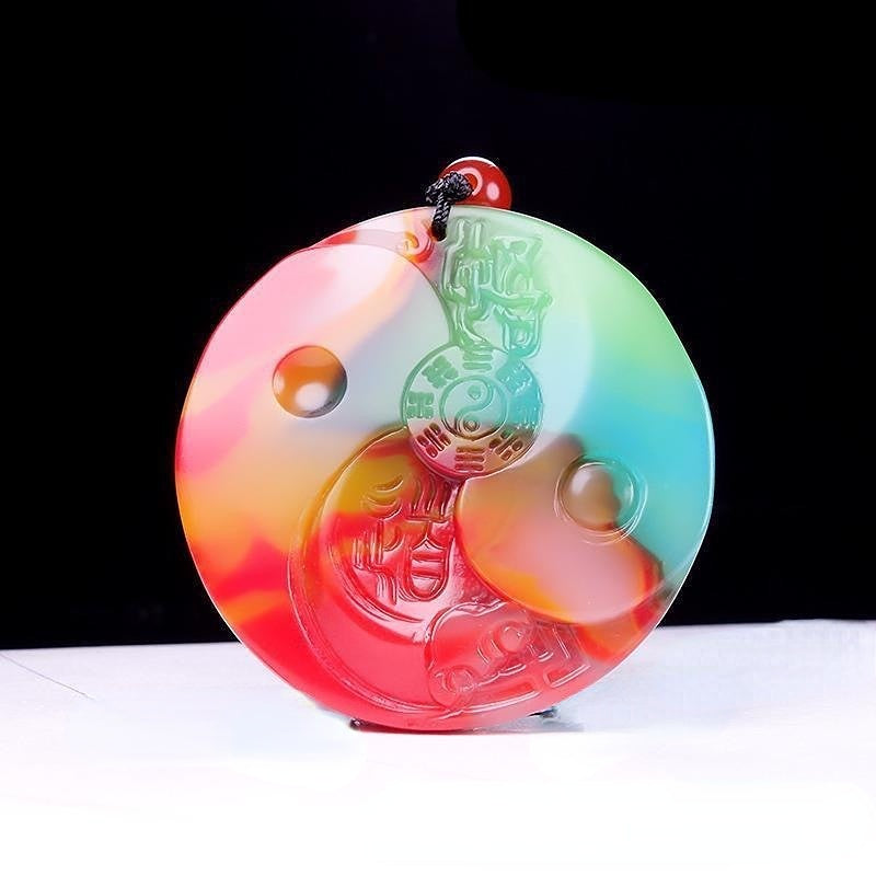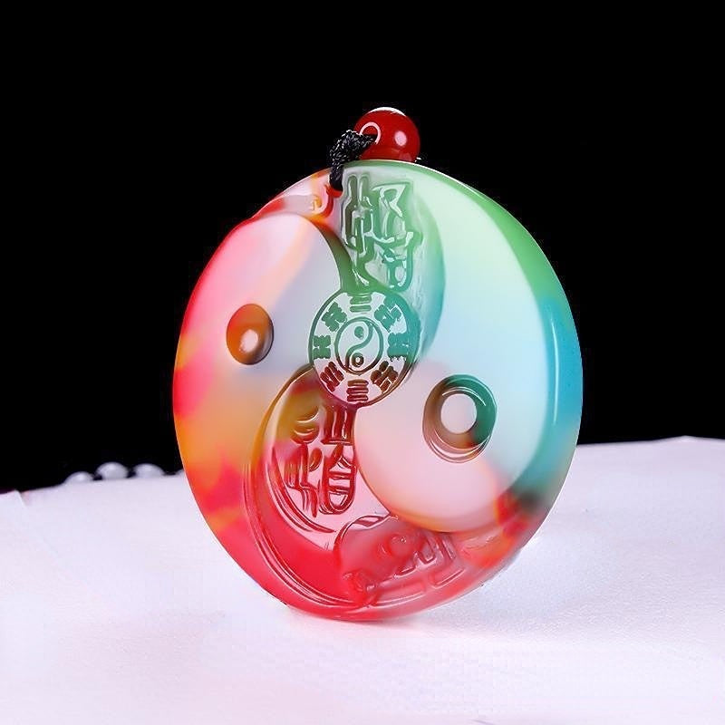 This beautiful pendant is made of natural colorful jade and features the Tai Chi Eight Diagrams design. Suitable for both men and women.