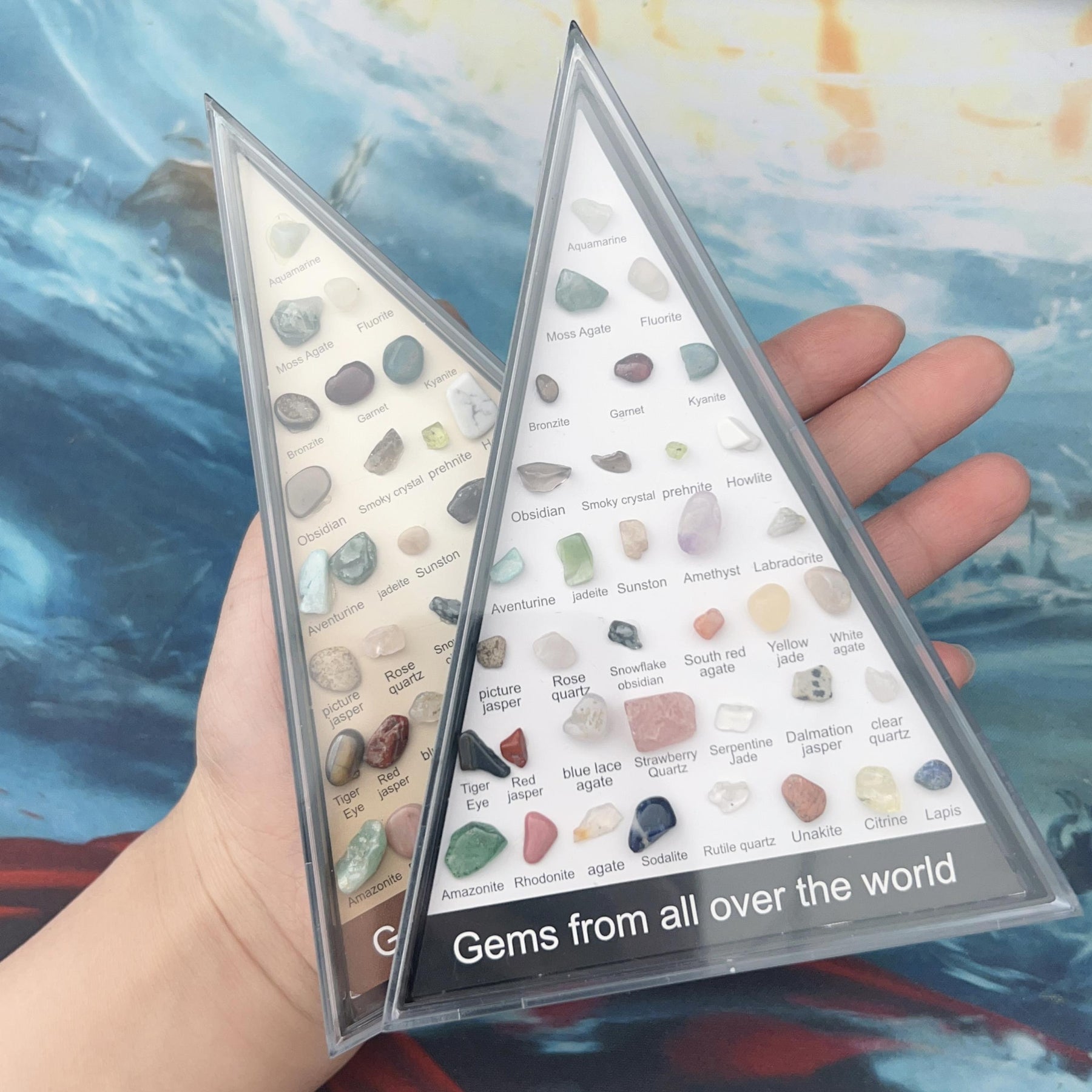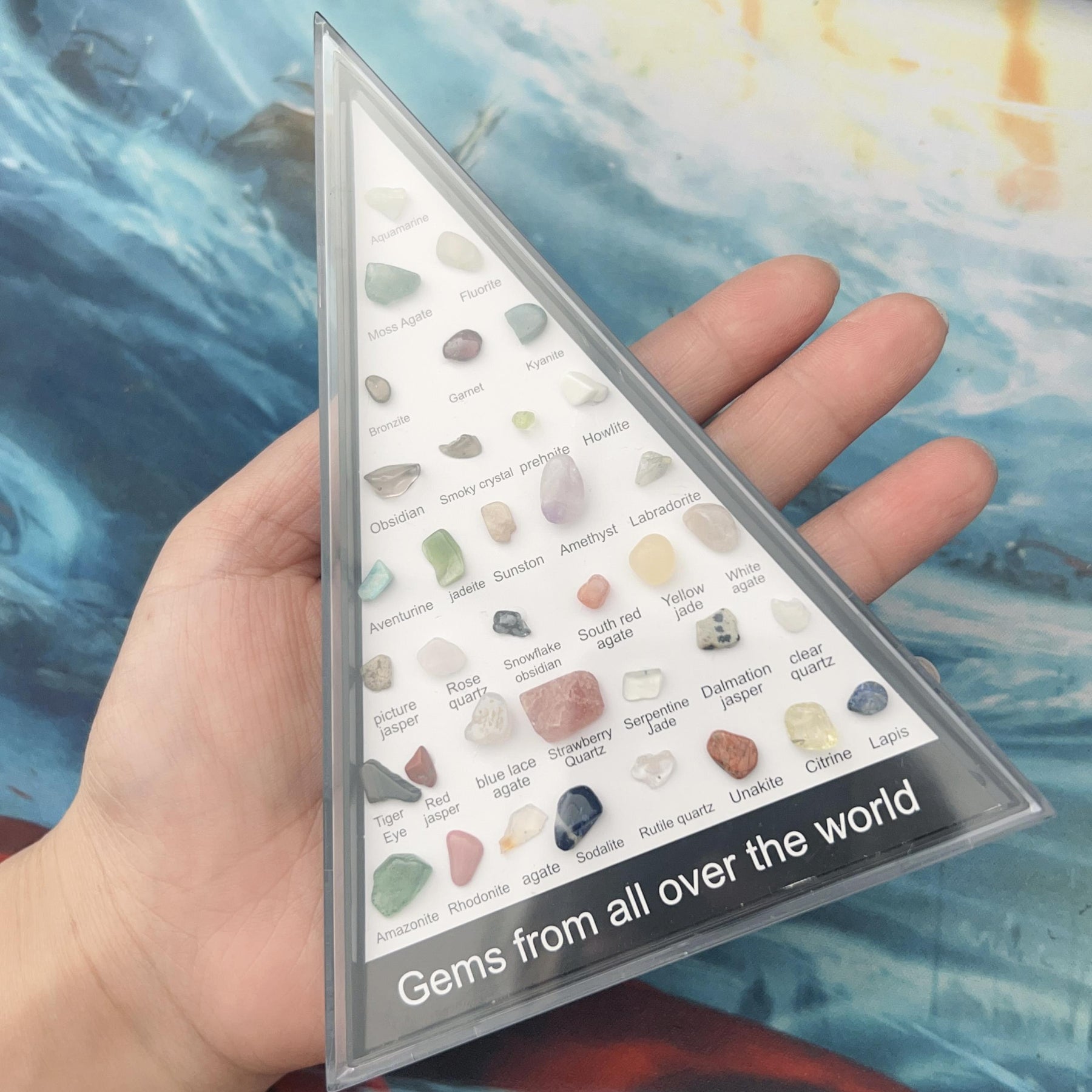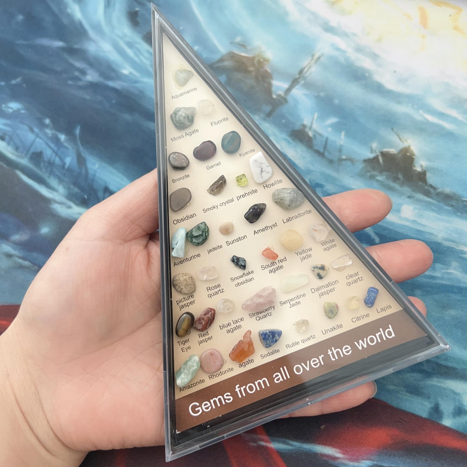 Discover the beauty of 36 kinds of crystal agate gemstone ore specimens in a triangle set. Perfect gift for Christmas, teaching, mineral enthusiasts, and rock crystal lovers.
