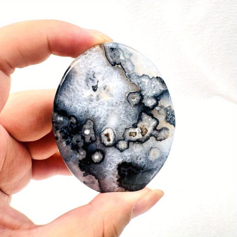 Enhance your home decor, jewelry making, and meditation practice with this polished flower agate heart and palm stone. The marbling in grey adds a touch of bohemian charm to your space.
