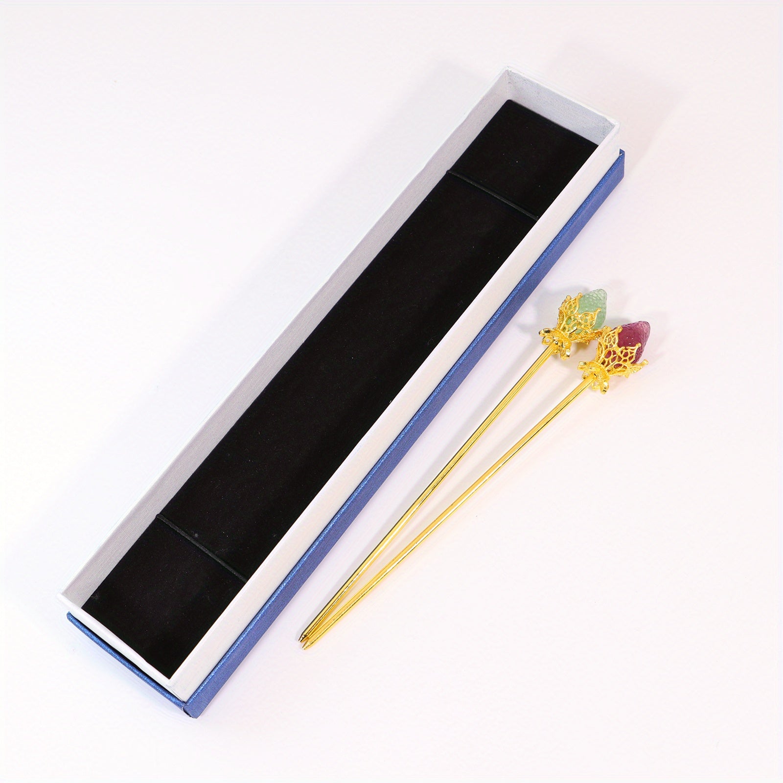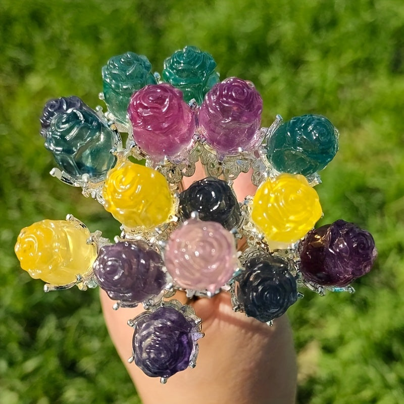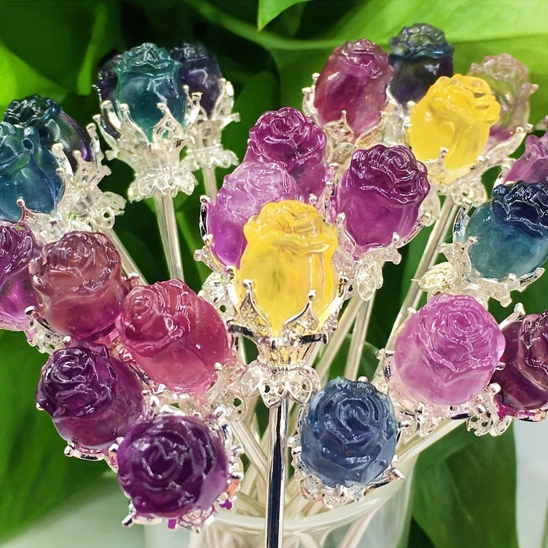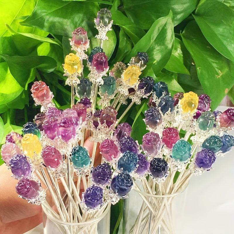 This crystal hair clip features natural fluorite in a rose and strawberry shape, perfect for energy healing and Reiki practices.