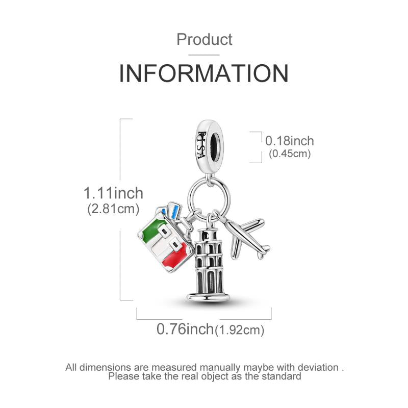 Elegant Pisa Tower and airplane charm keychain with Italian flag colors. Made of durable metal, perfect for keys, luggage, and travel accessories.