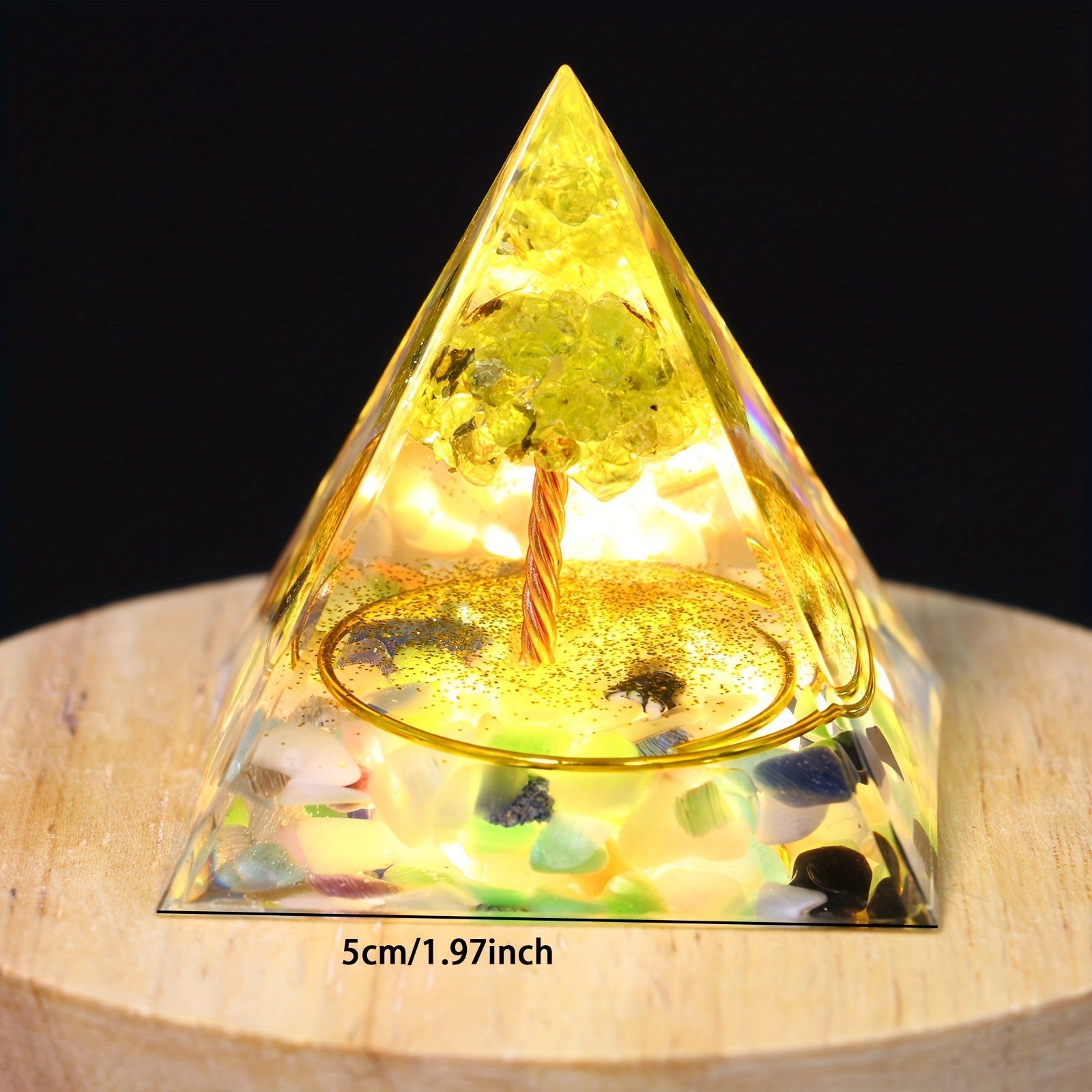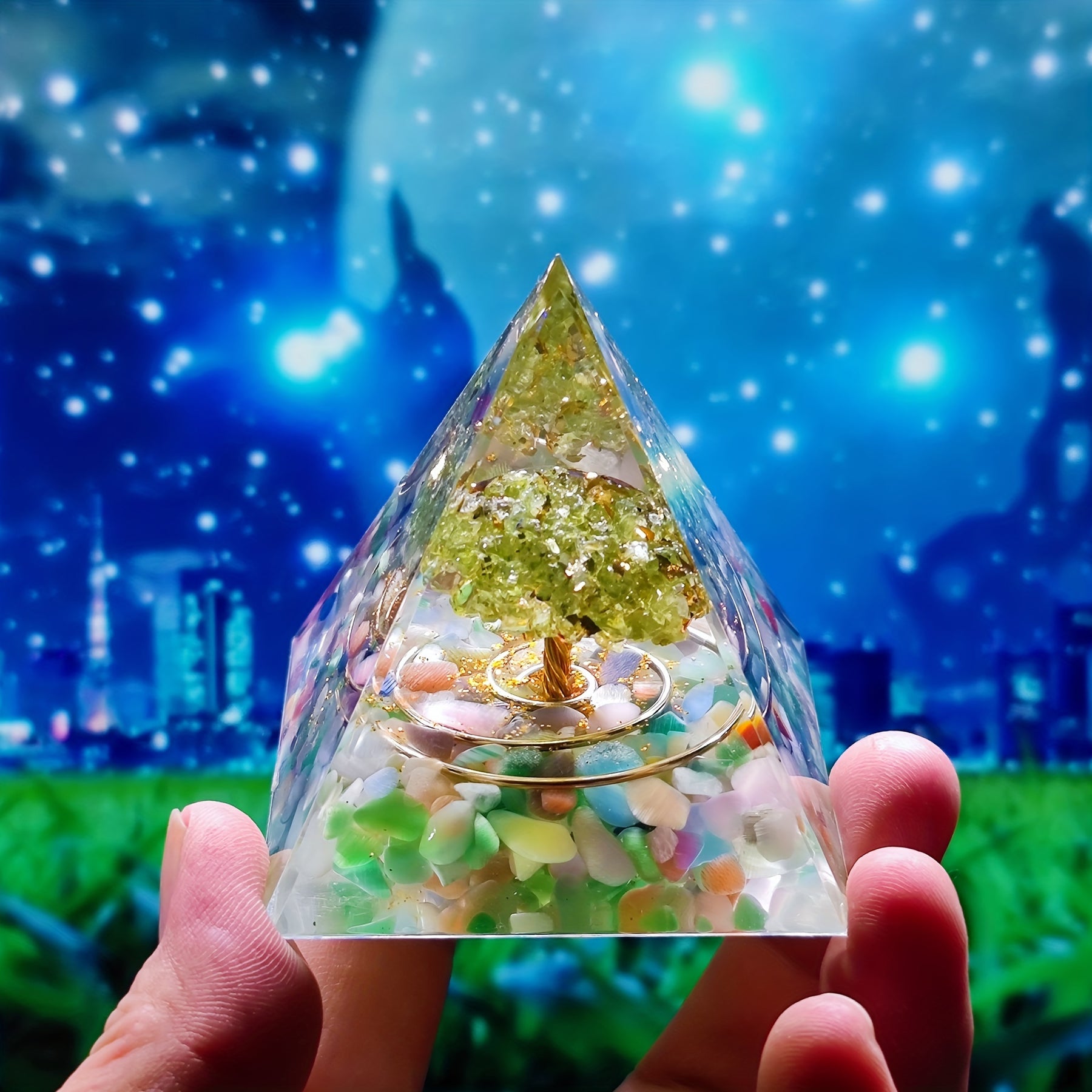 This orgone pyramid is crafted with Rainbow Fluorite for positive energy healing. It helps protect and balance energy fields.