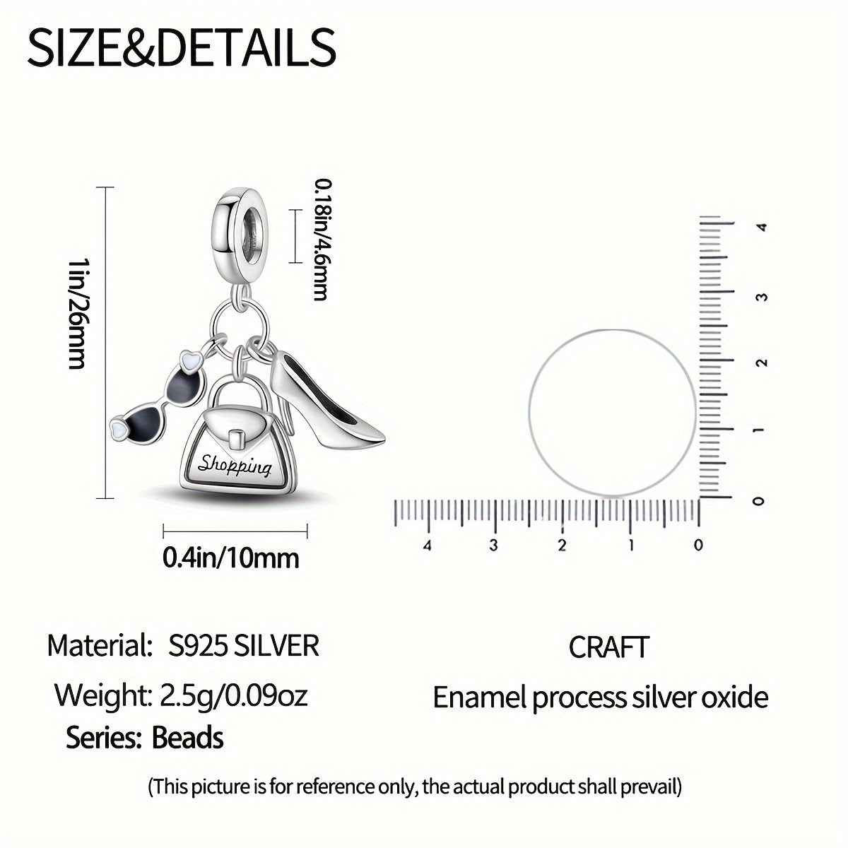Add a touch of elegance with this sterling silver charm bracelet set featuring high heel, glasses, and handbag pendants. Perfect gift for women, family, and friends.