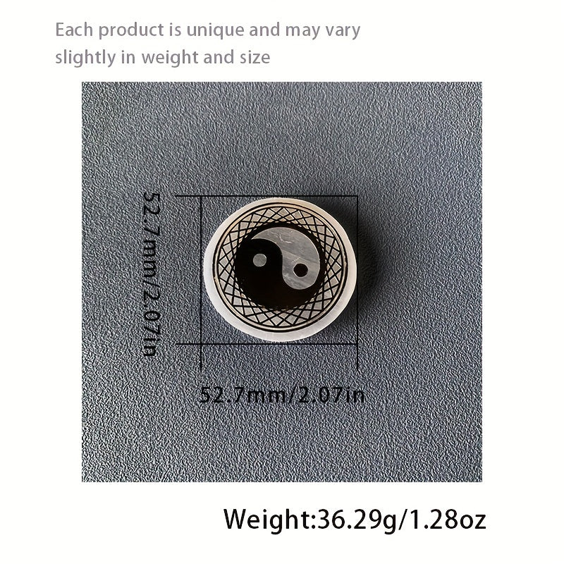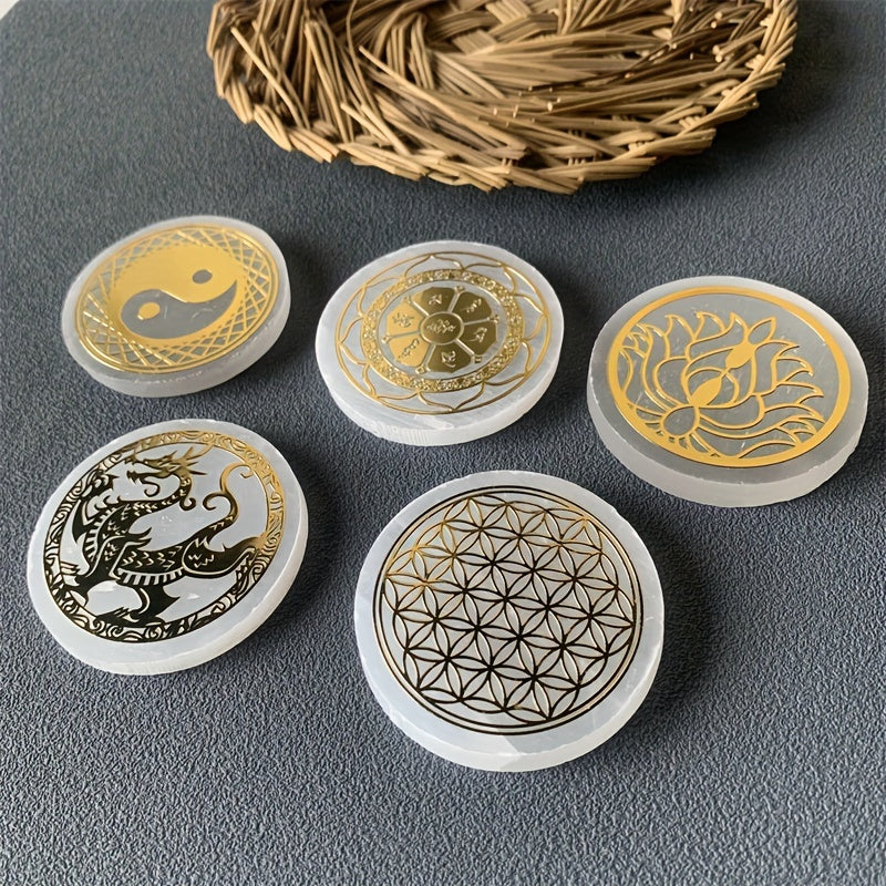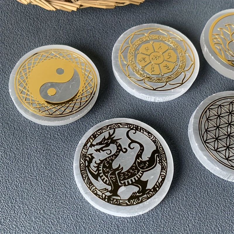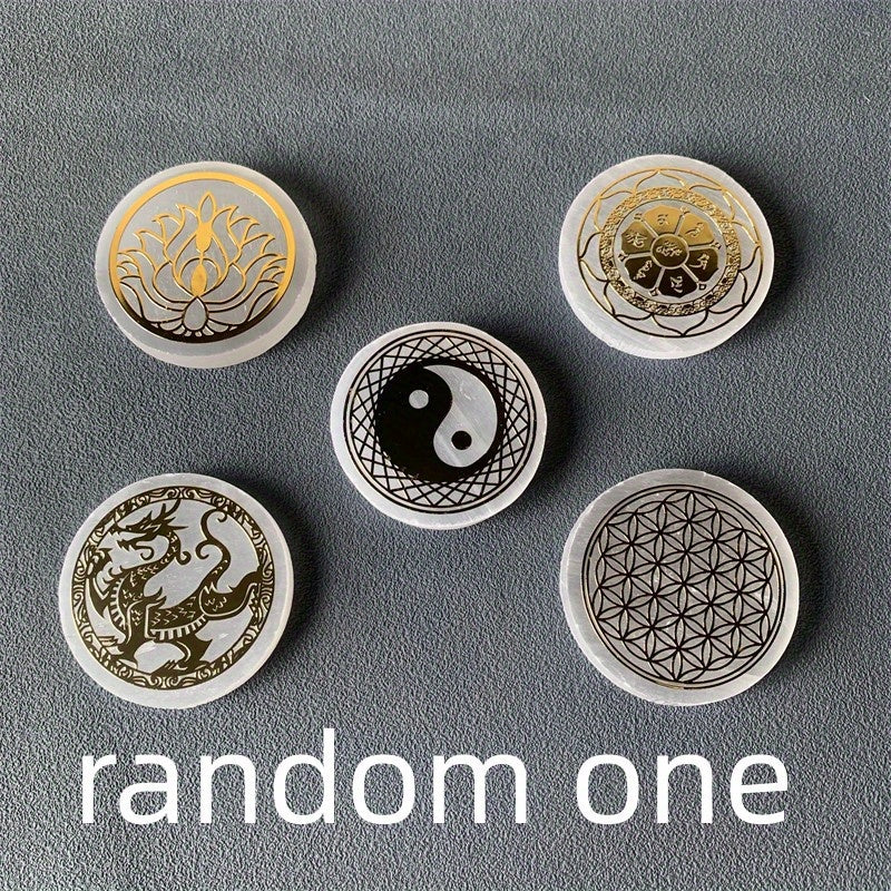 Enhance your space with this 52mm selenite round shaped plate featuring unique patterns. Perfect for decoration and healing purposes.