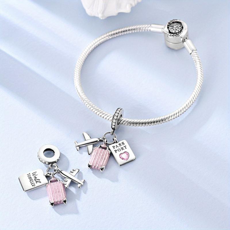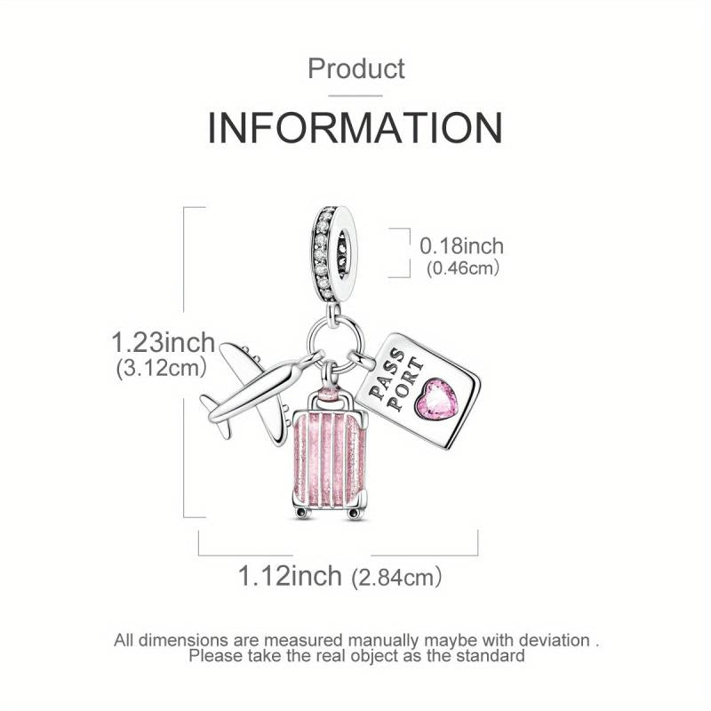 This whimsical charm keychain set features a copper tone silvery design with an airplane, suitcase, and passport adorned with pink cubic zirconia accents. Perfect for travelers and wanderlust enthusiasts.