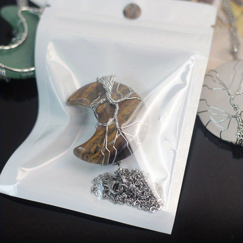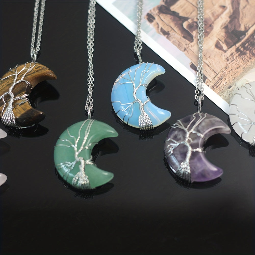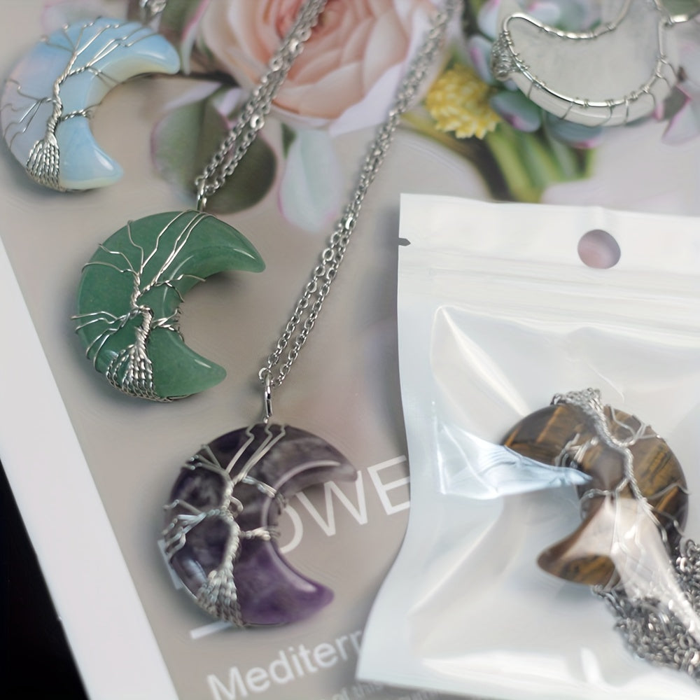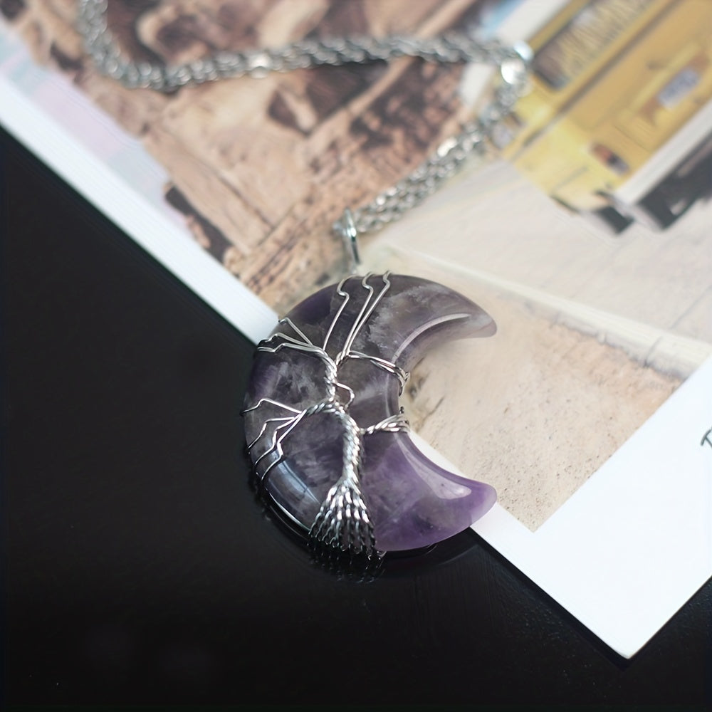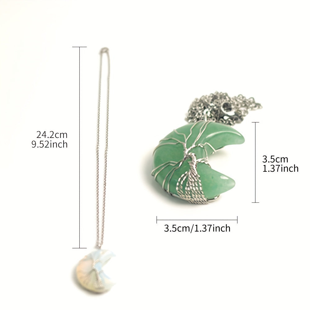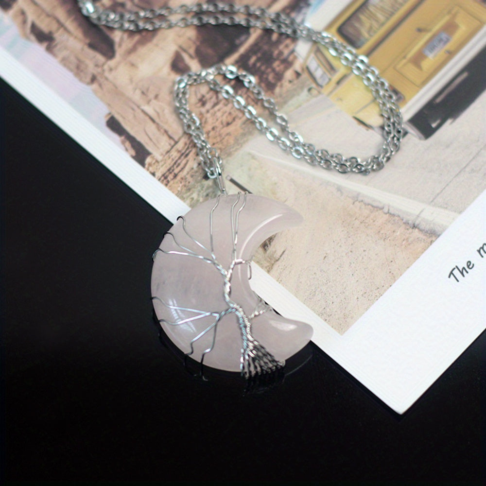 Embrace the mystical energy with this Tree of Life crystal crescent moon pendant necklace. This polished mineral jewelry is perfect for reiki healing and brings positive energy into your life.