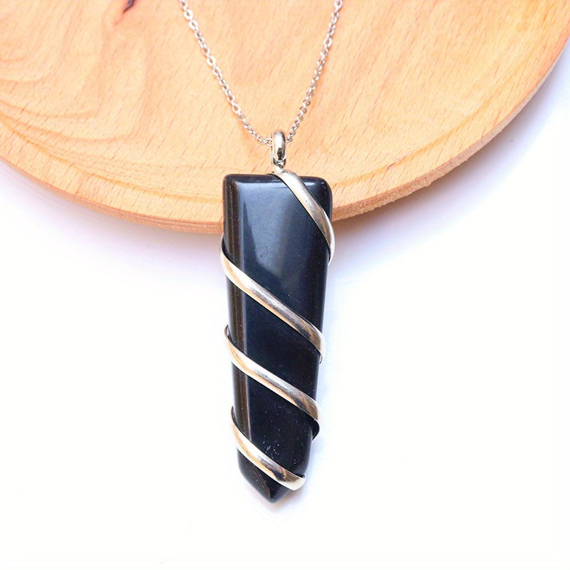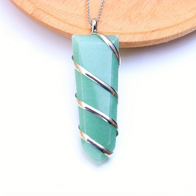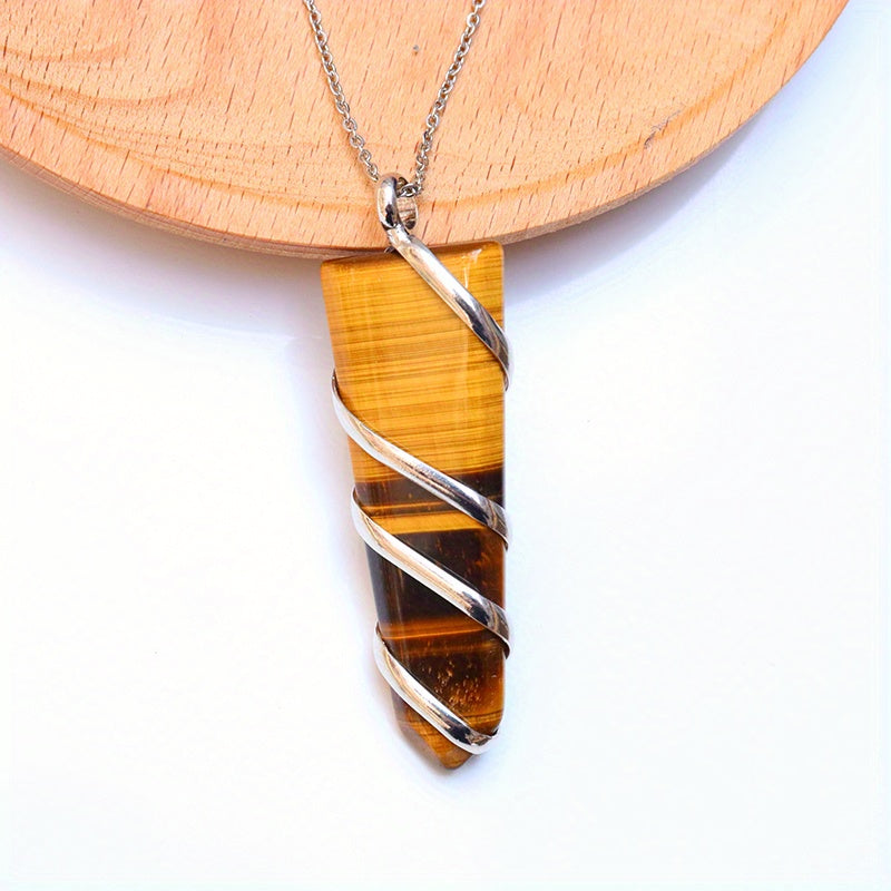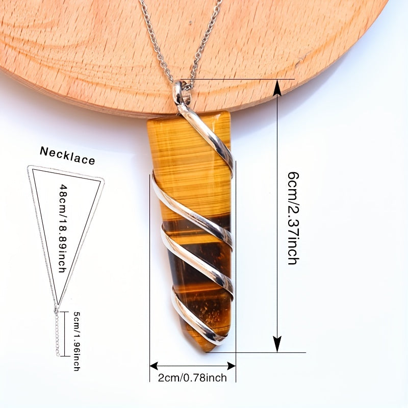 This beautiful necklace features a tree of life design, with natural stone sword-shaped pendants in rose quartz, amethyst, and tiger eye. Each stone represents one of the seven chakras. The pendant is wire wrapped in silver for a unique and elegant look.
