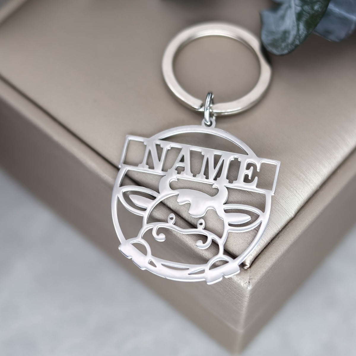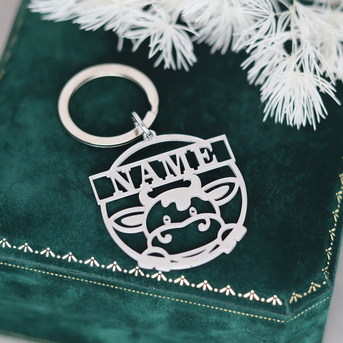 Get ready for school with this adorable Cow Name Keychain personalized with your name. A unique and fun accessory for your backpack or keys.
