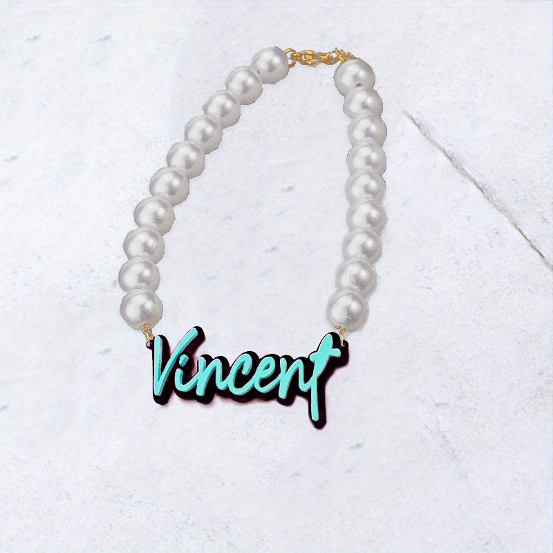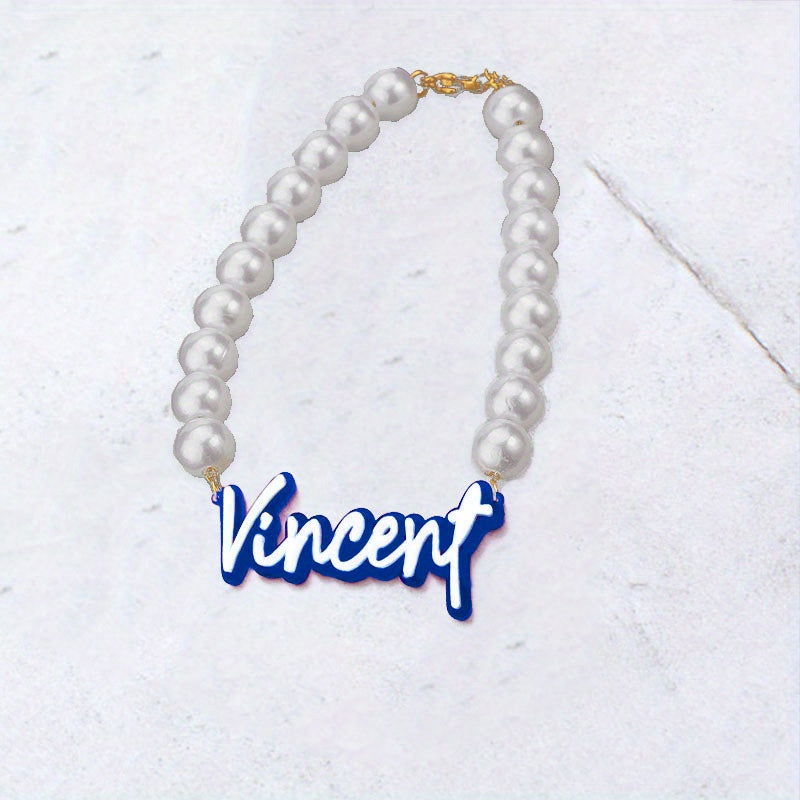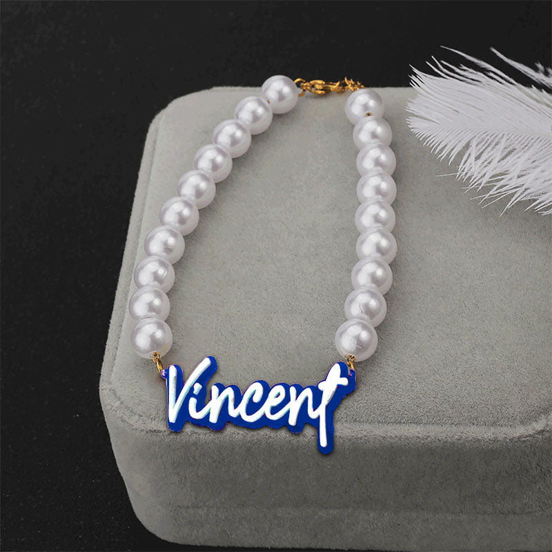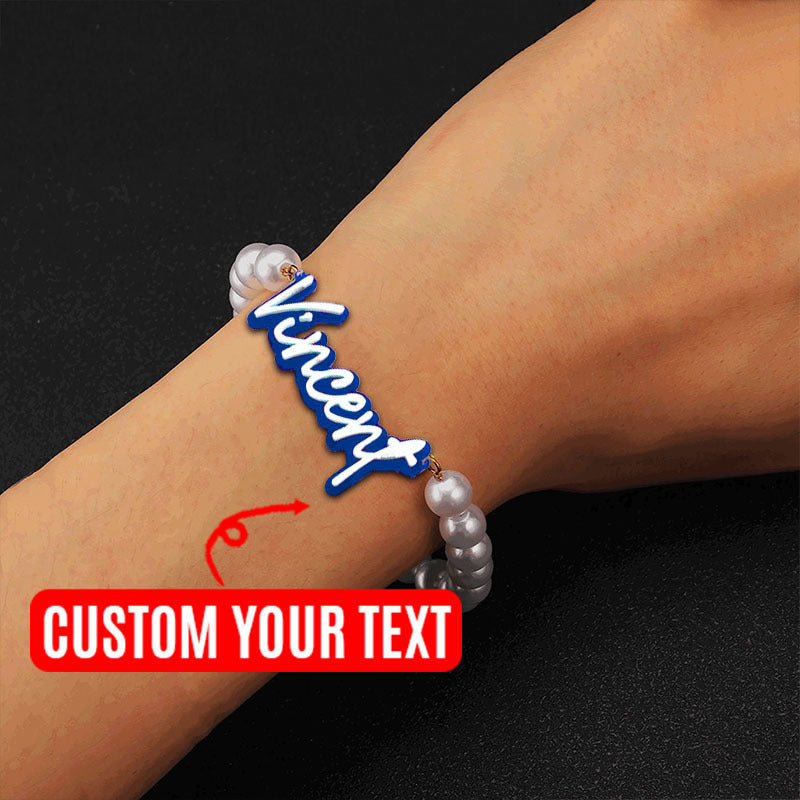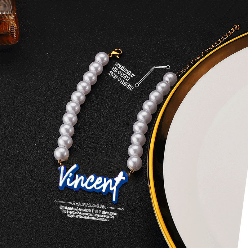 Stylish gift for lover, birthday, or family. This custom acrylic name bracelet features pearls, making it a unique and thoughtful accessory for any occasion.