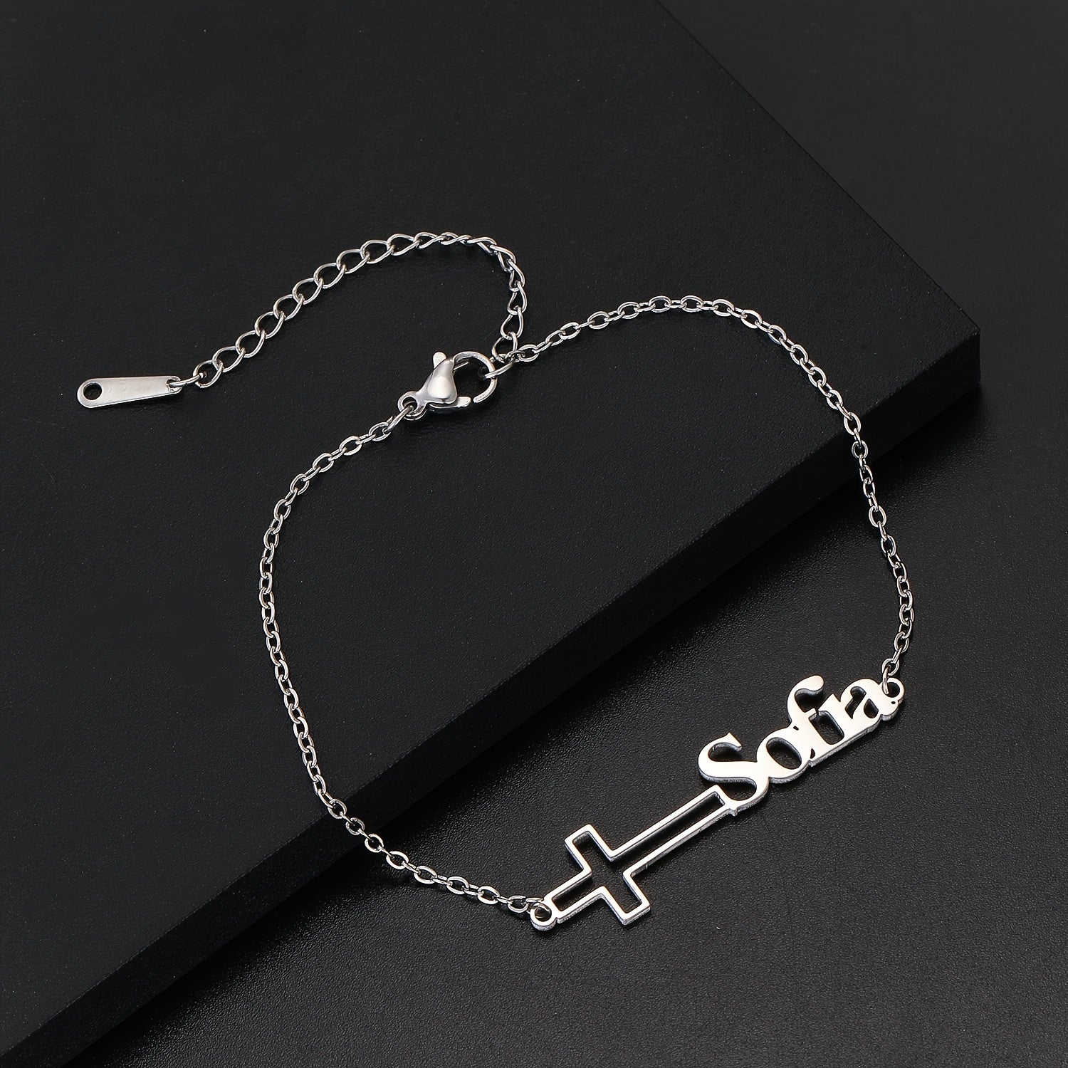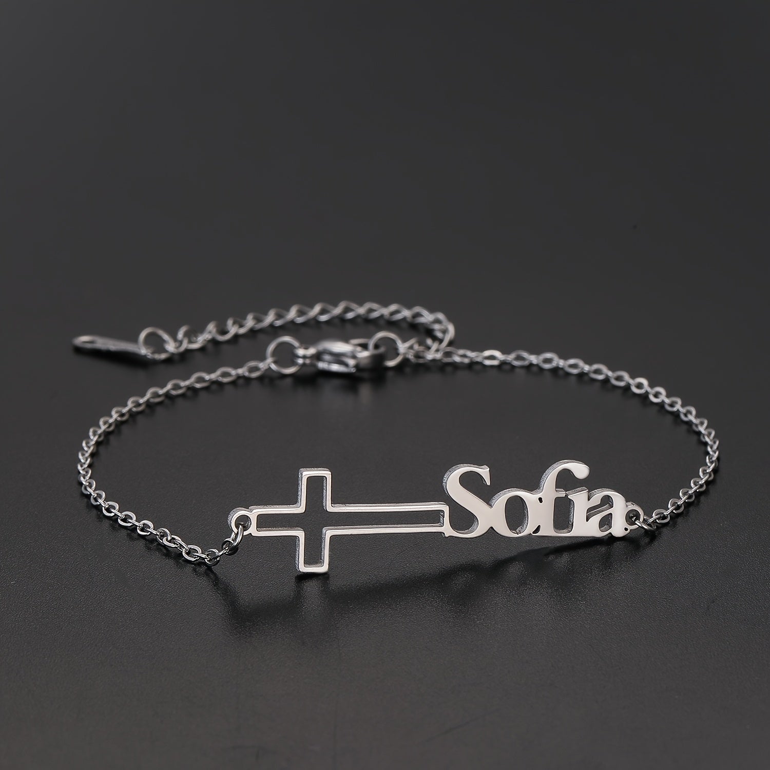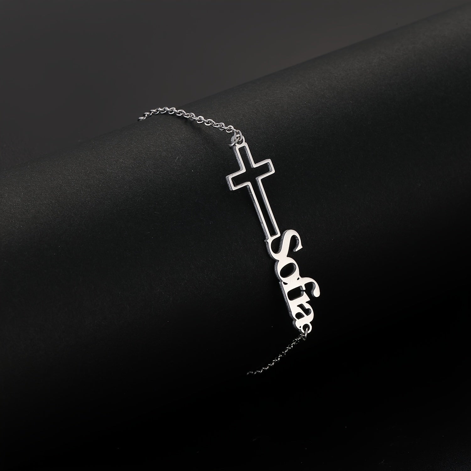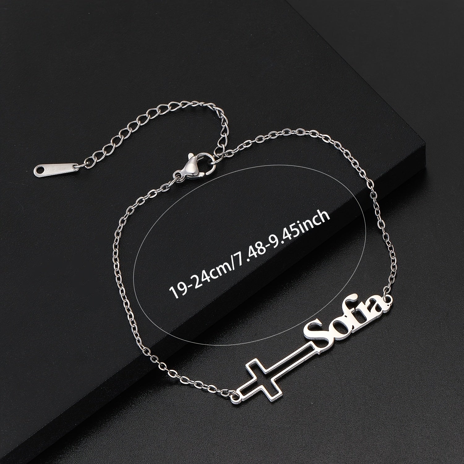 Express your faith with this personalized name bracelet featuring a cross, crafted from durable stainless steel.
