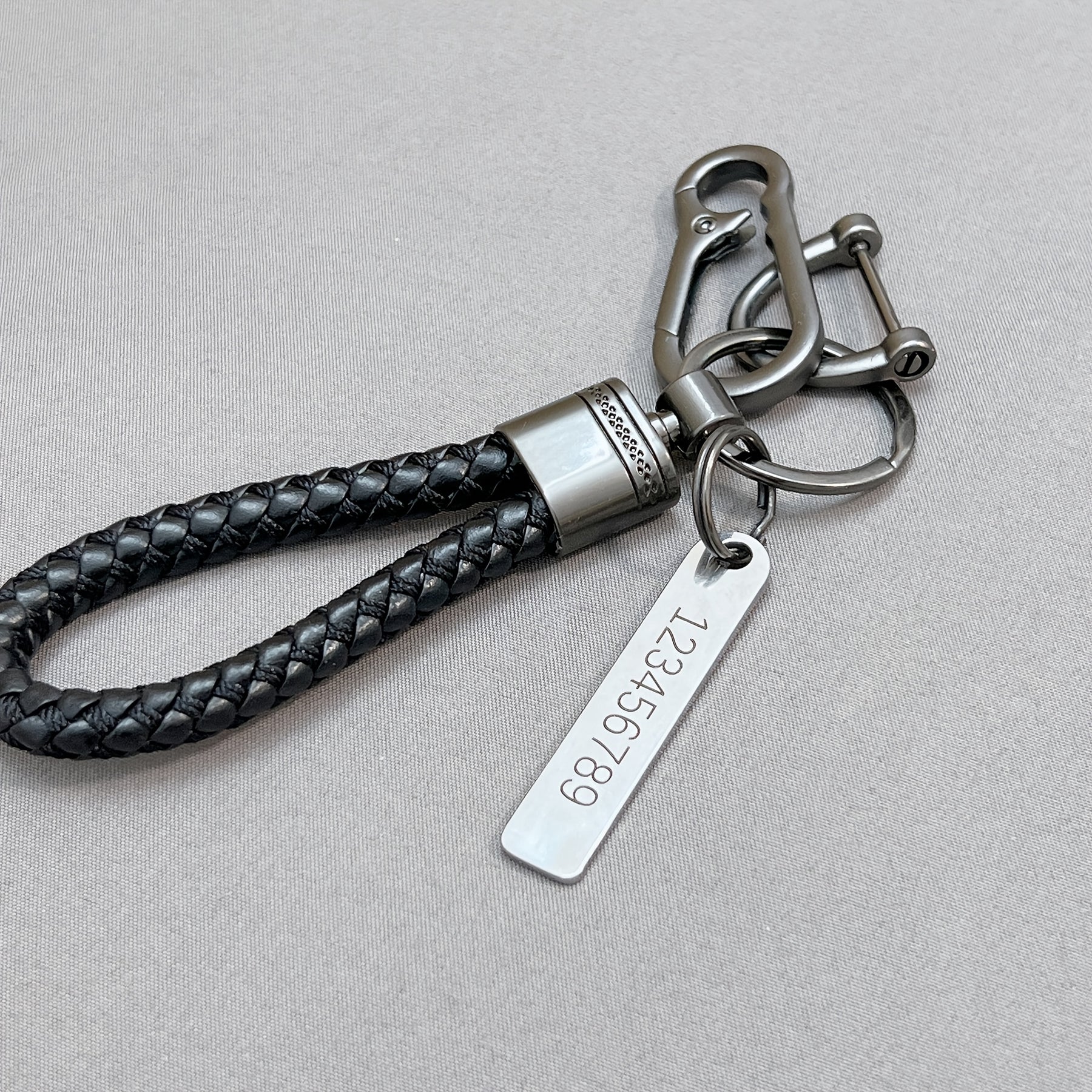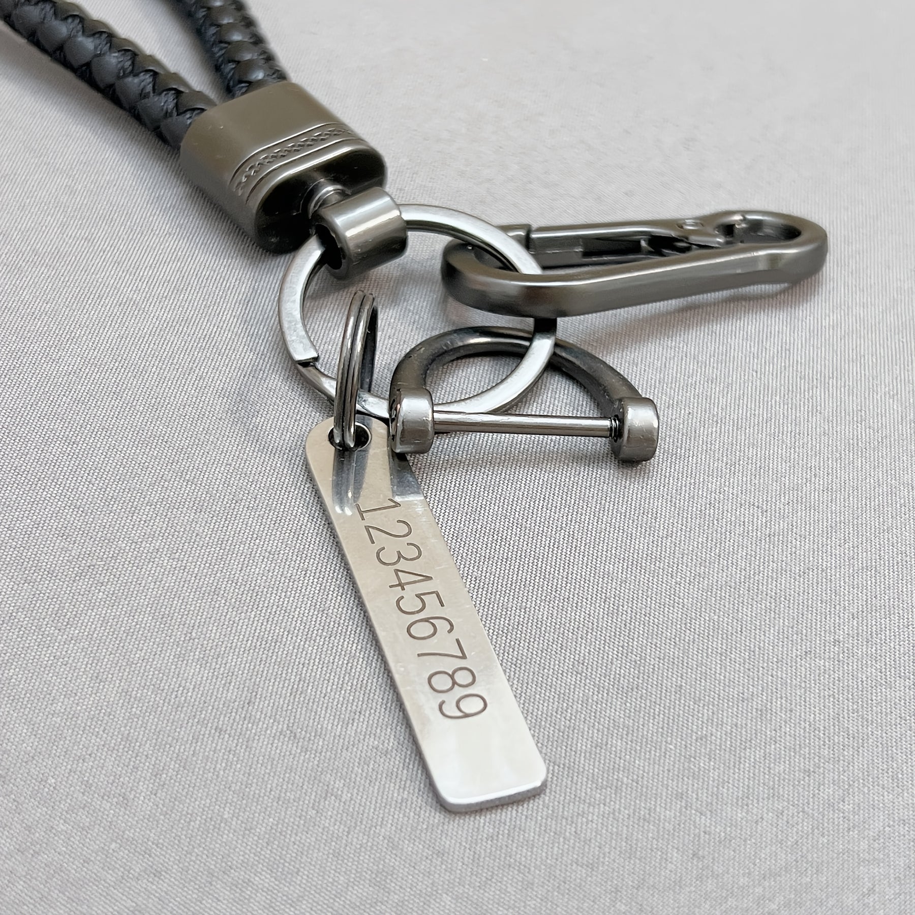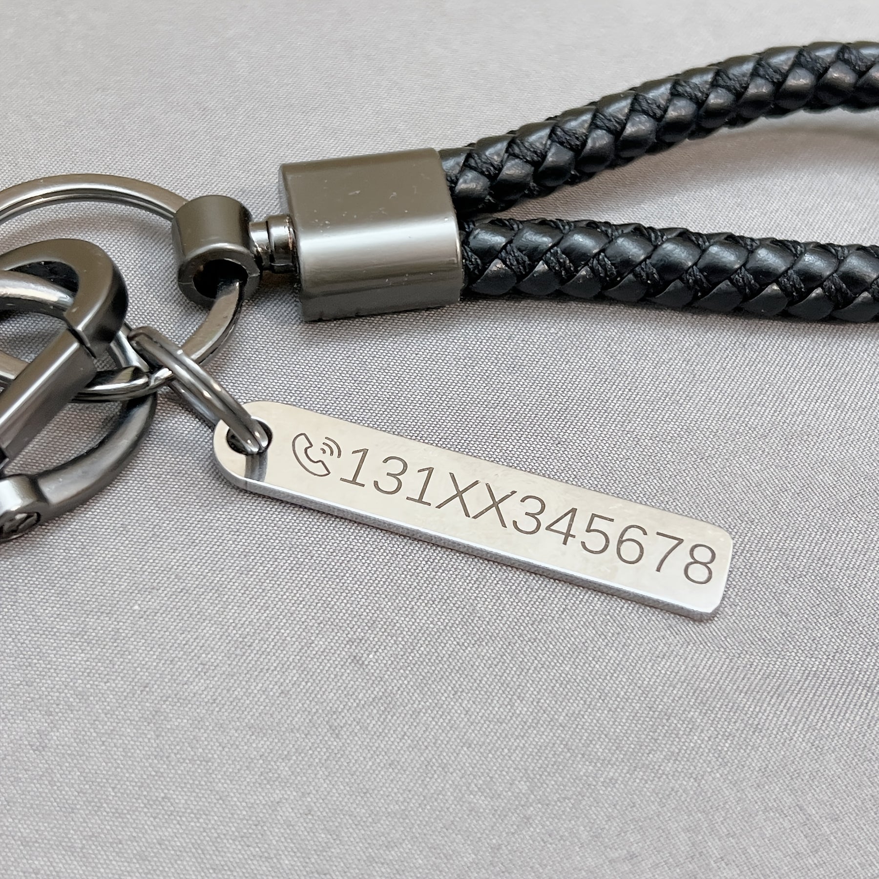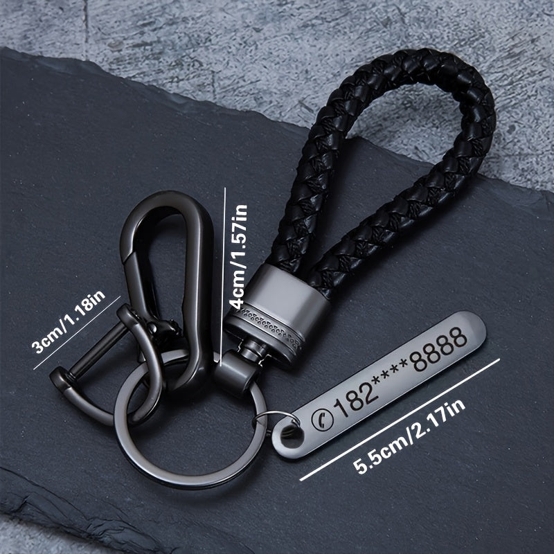 Get a personalized ID tag keychain with custom text that is engraved on stainless steel. This unique keychain comes with a braided rope pendant, making it a perfect gift for yourself or a loved one.