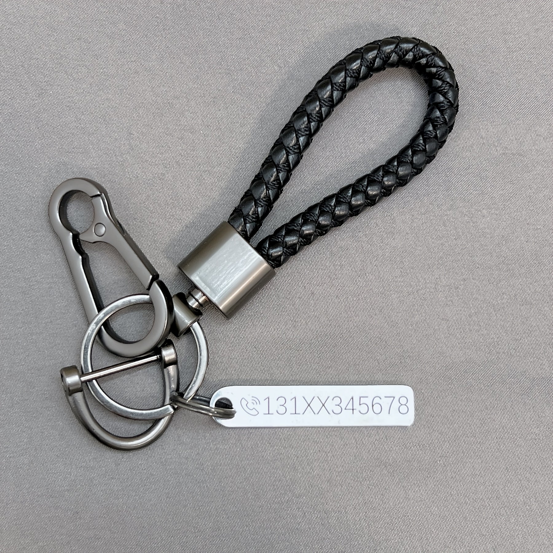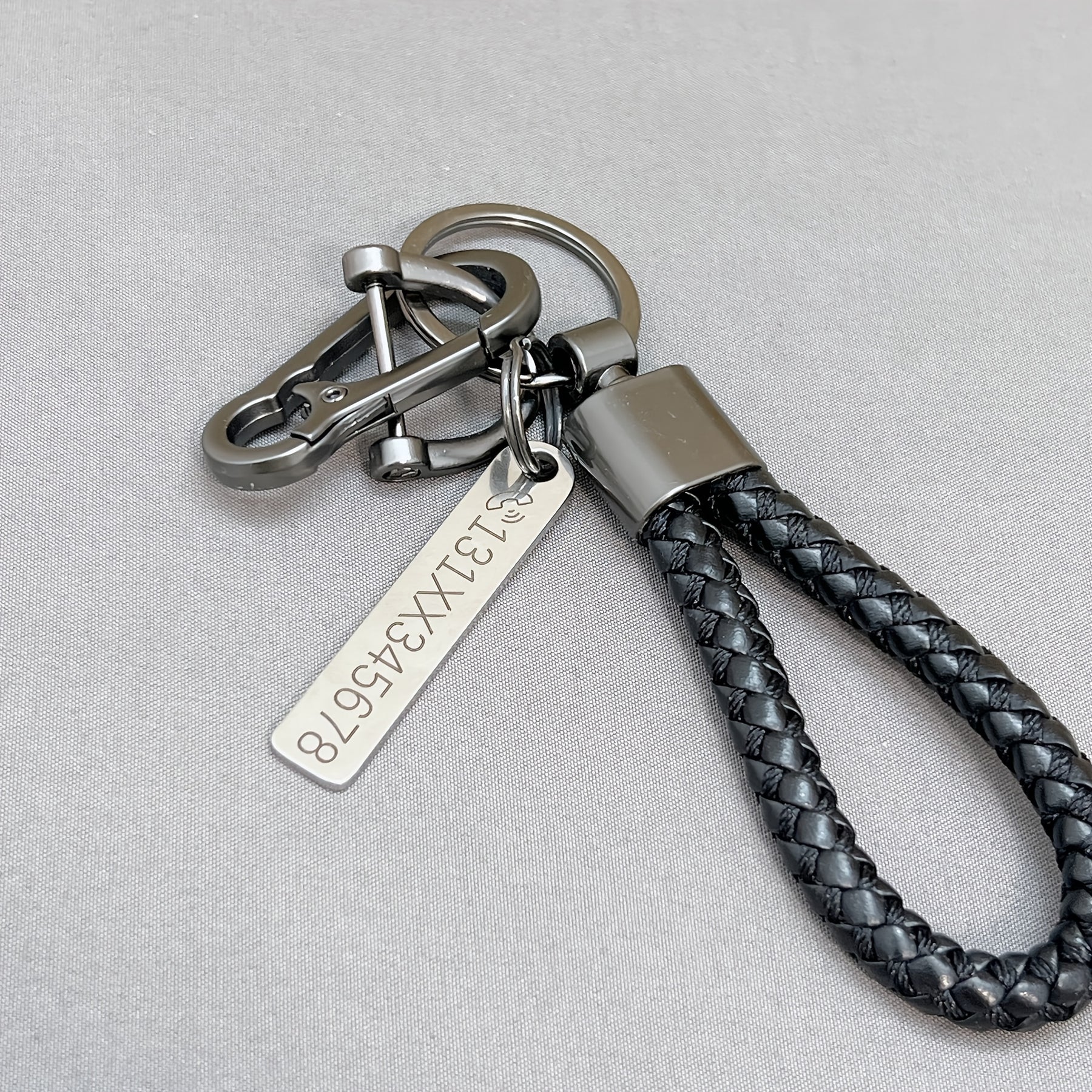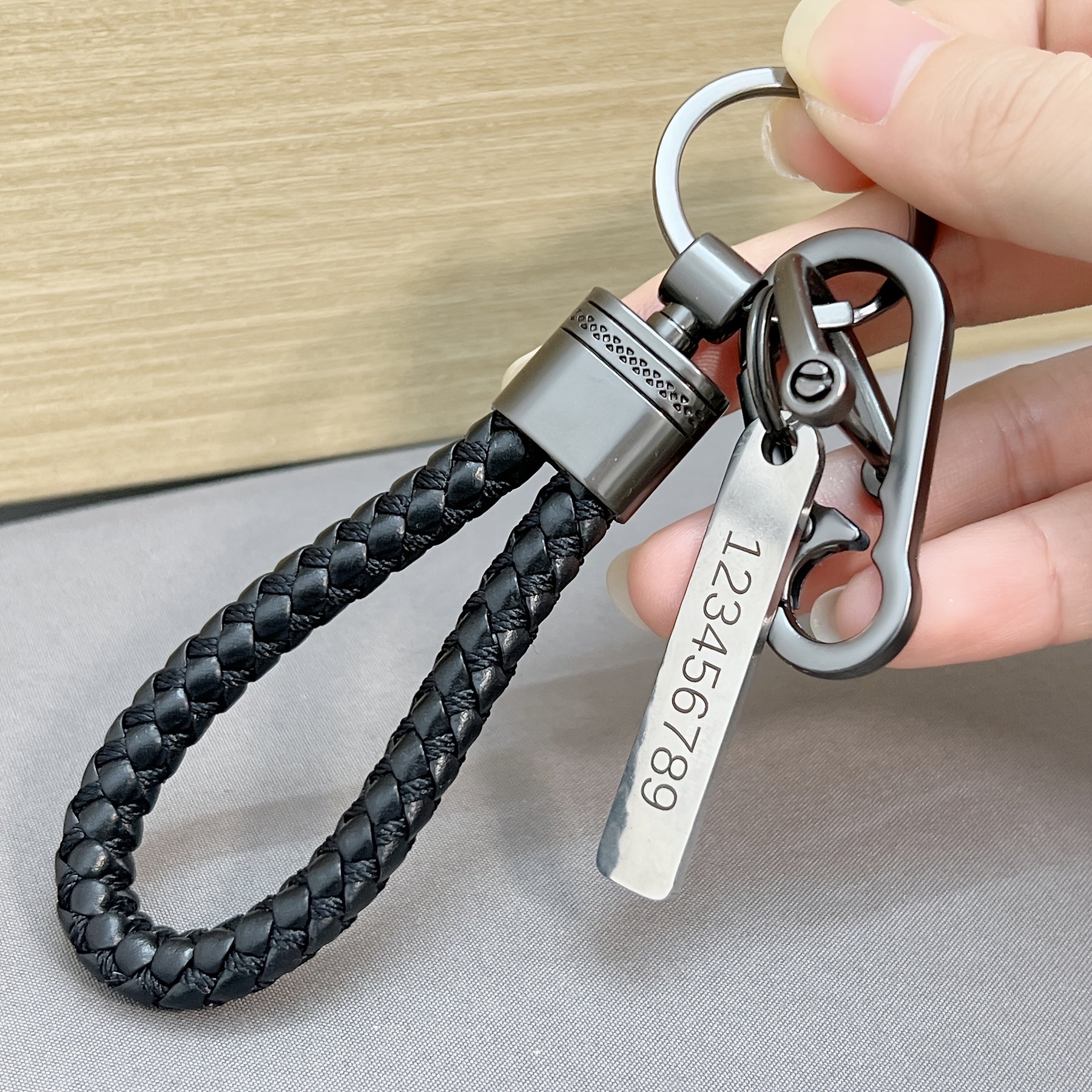 Get a personalized ID tag keychain with custom text that is engraved on stainless steel. This unique keychain comes with a braided rope pendant, making it a perfect gift for yourself or a loved one.