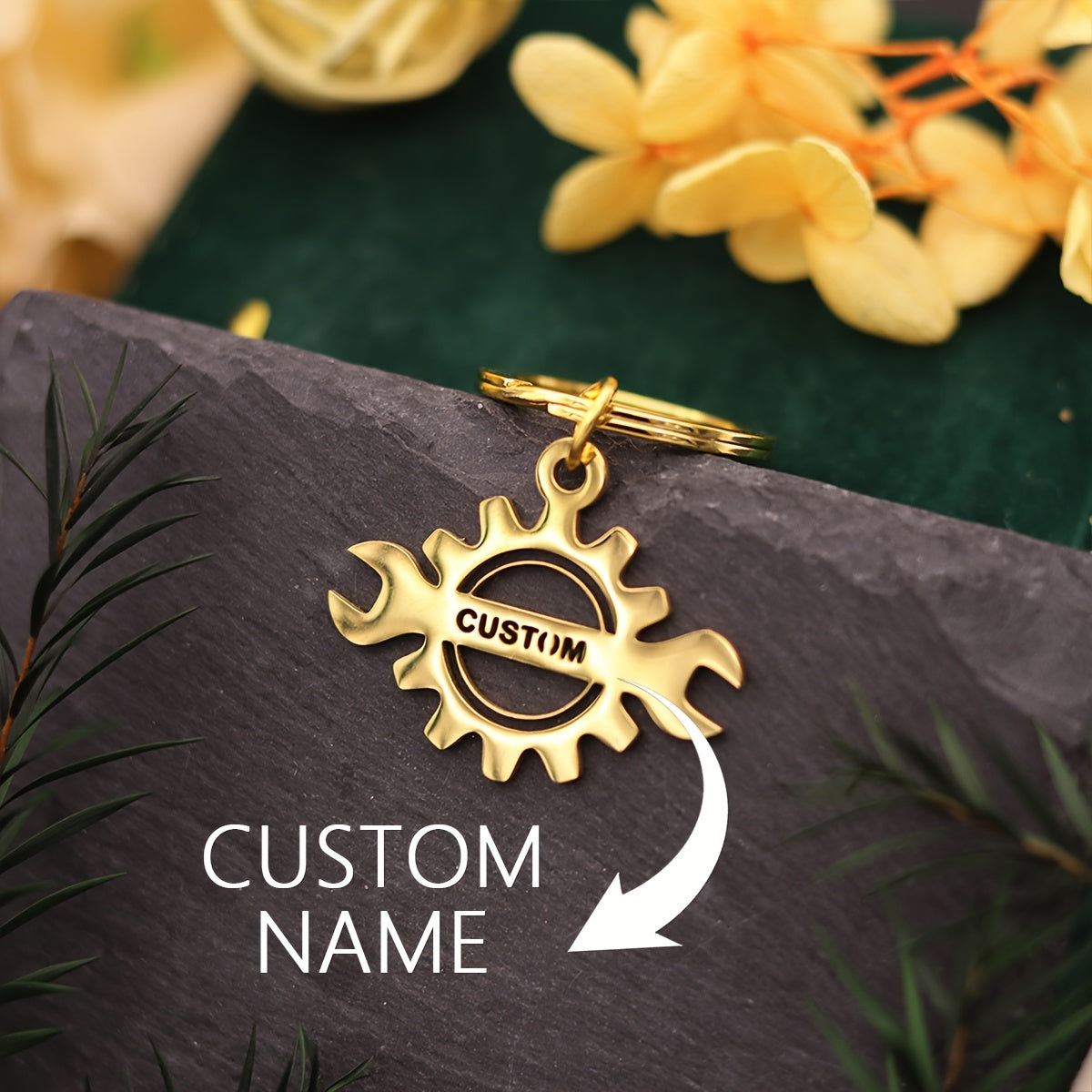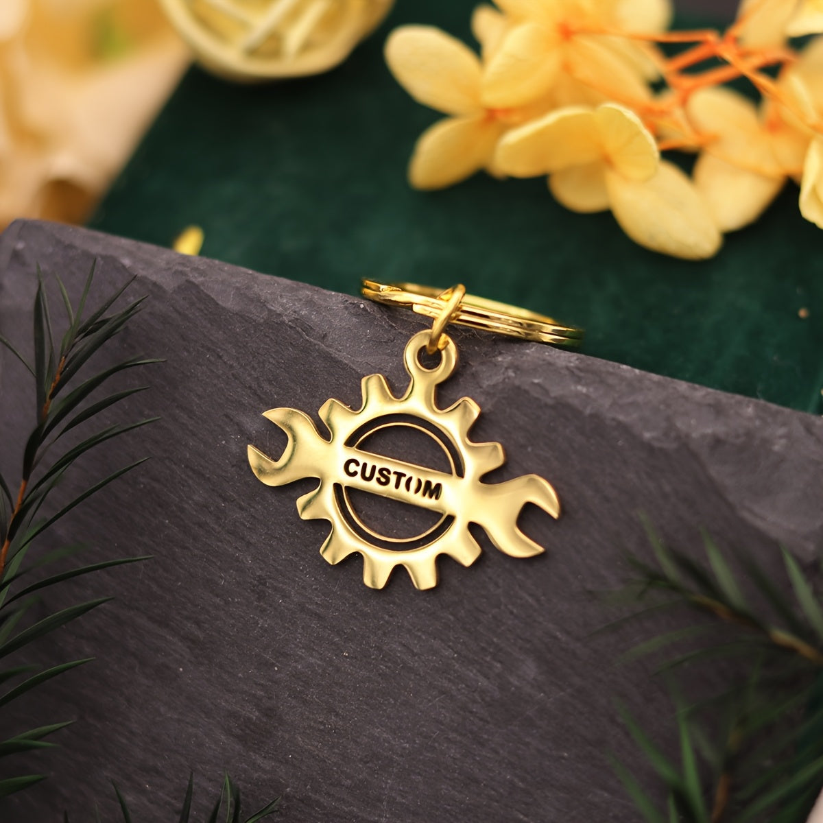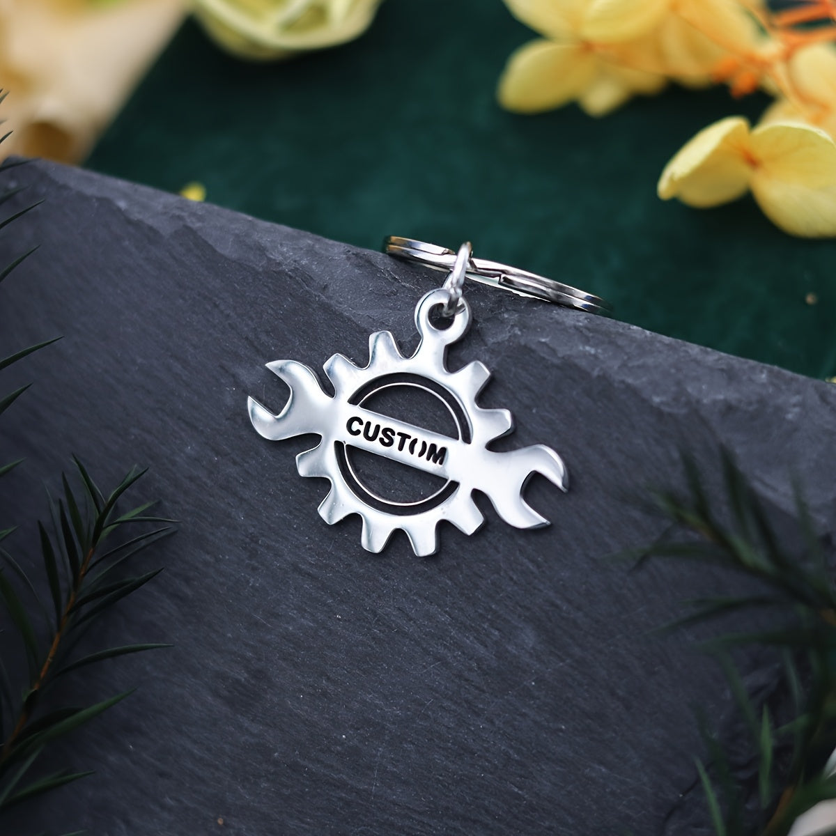 This customized keychain features gears and wrenches design, made of durable stainless steel. It's an ideal birthday gift for men who love mechanical themes.