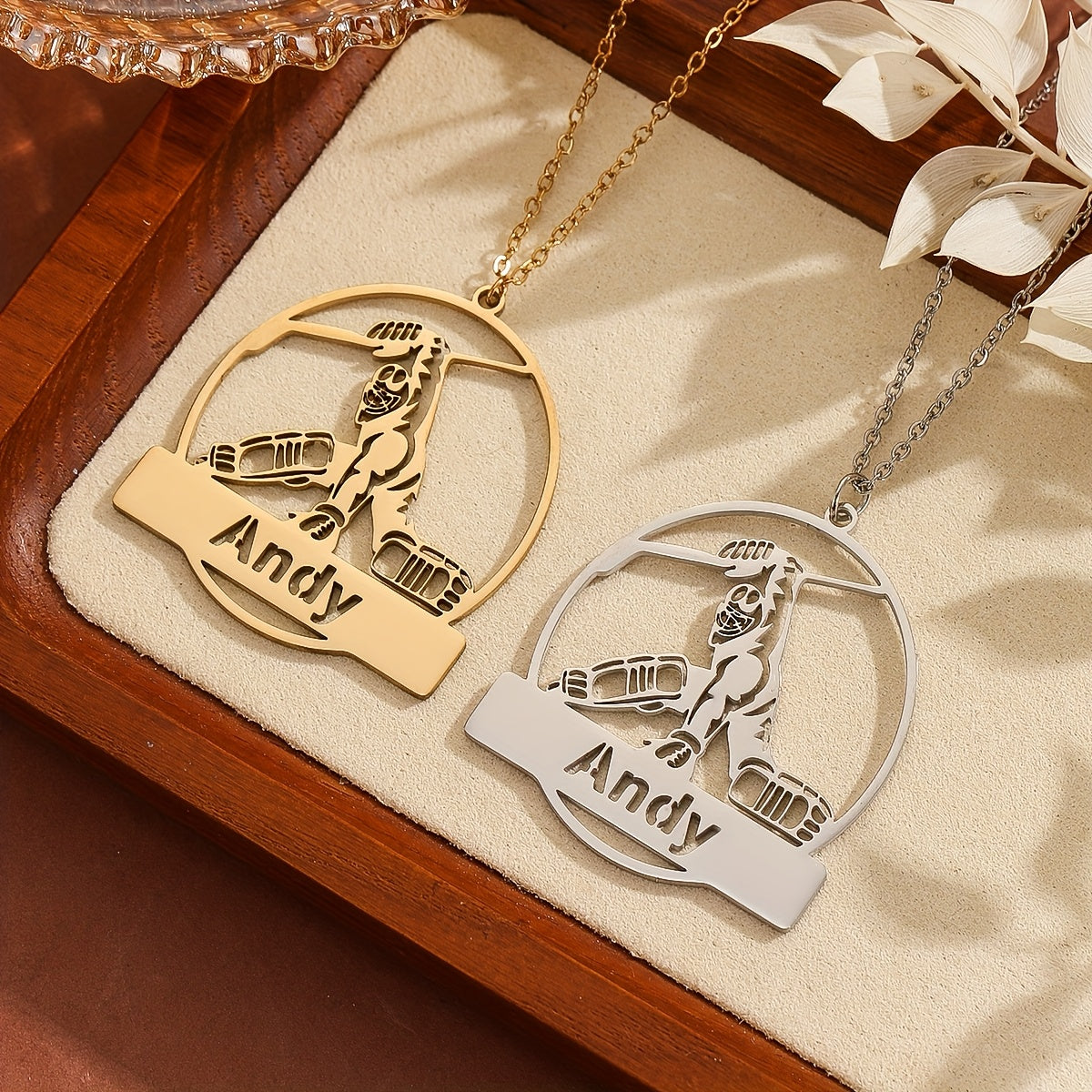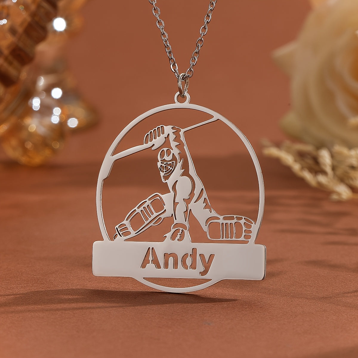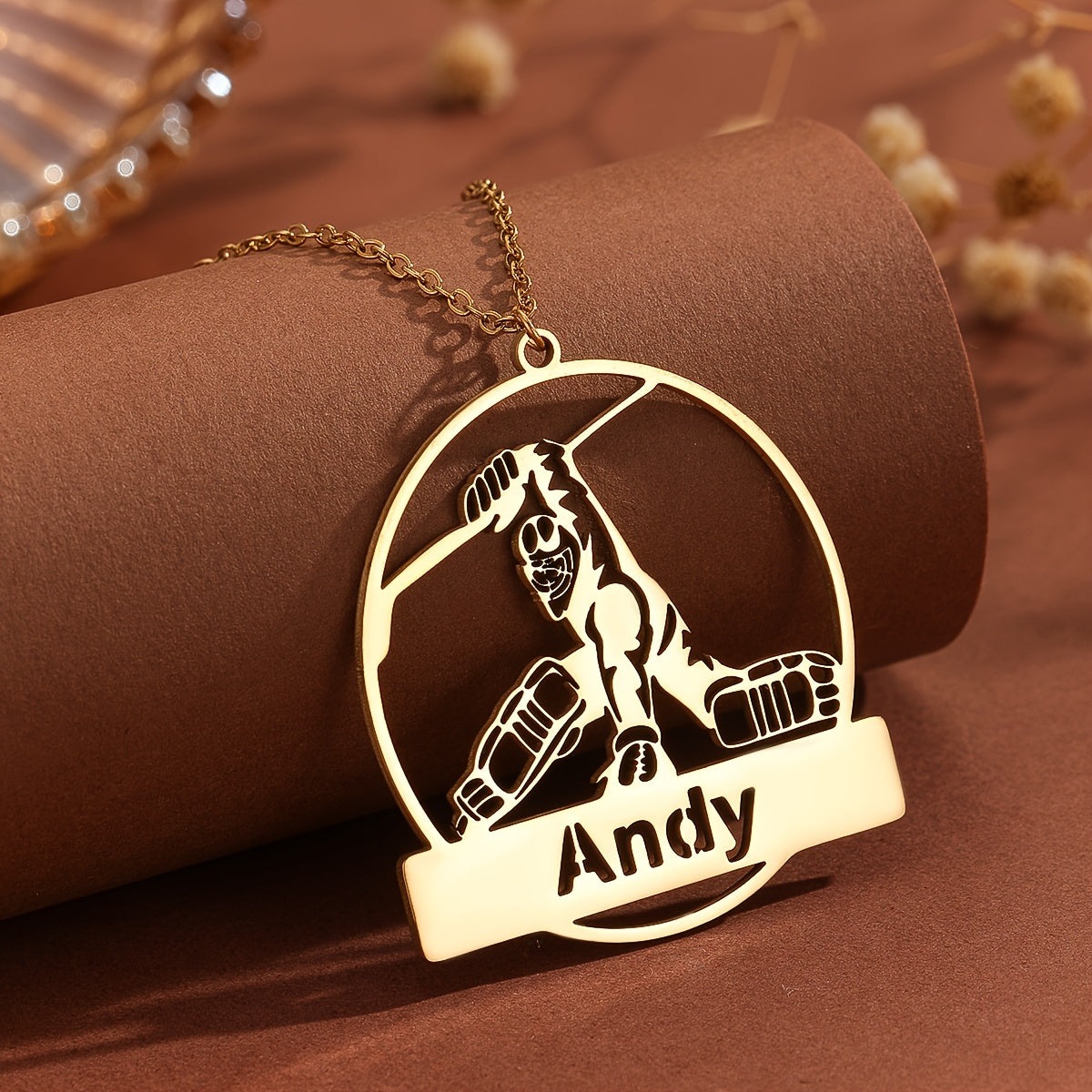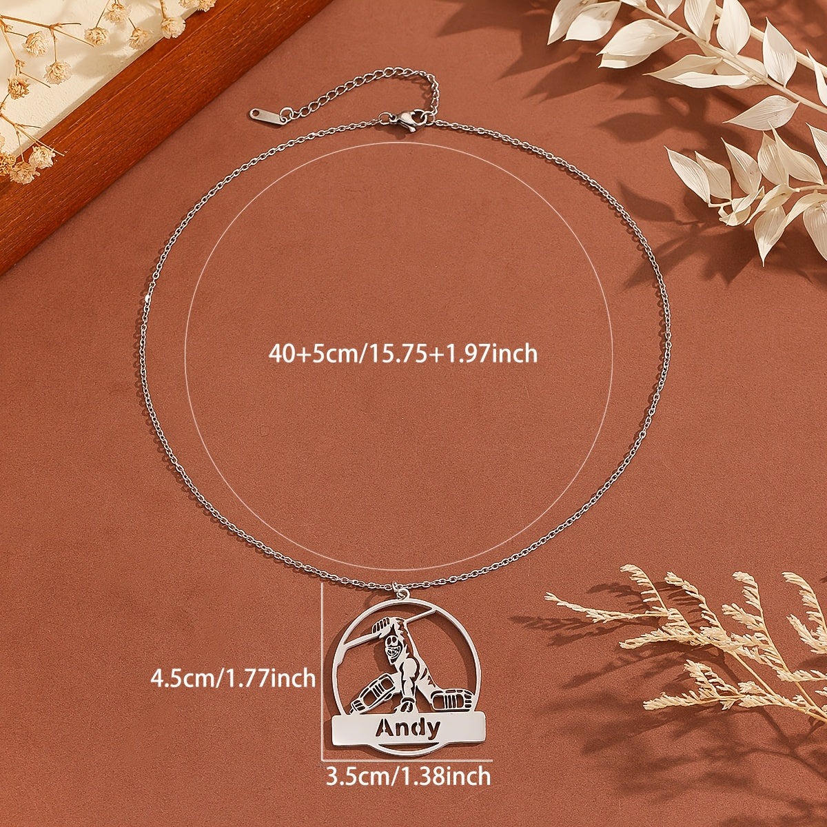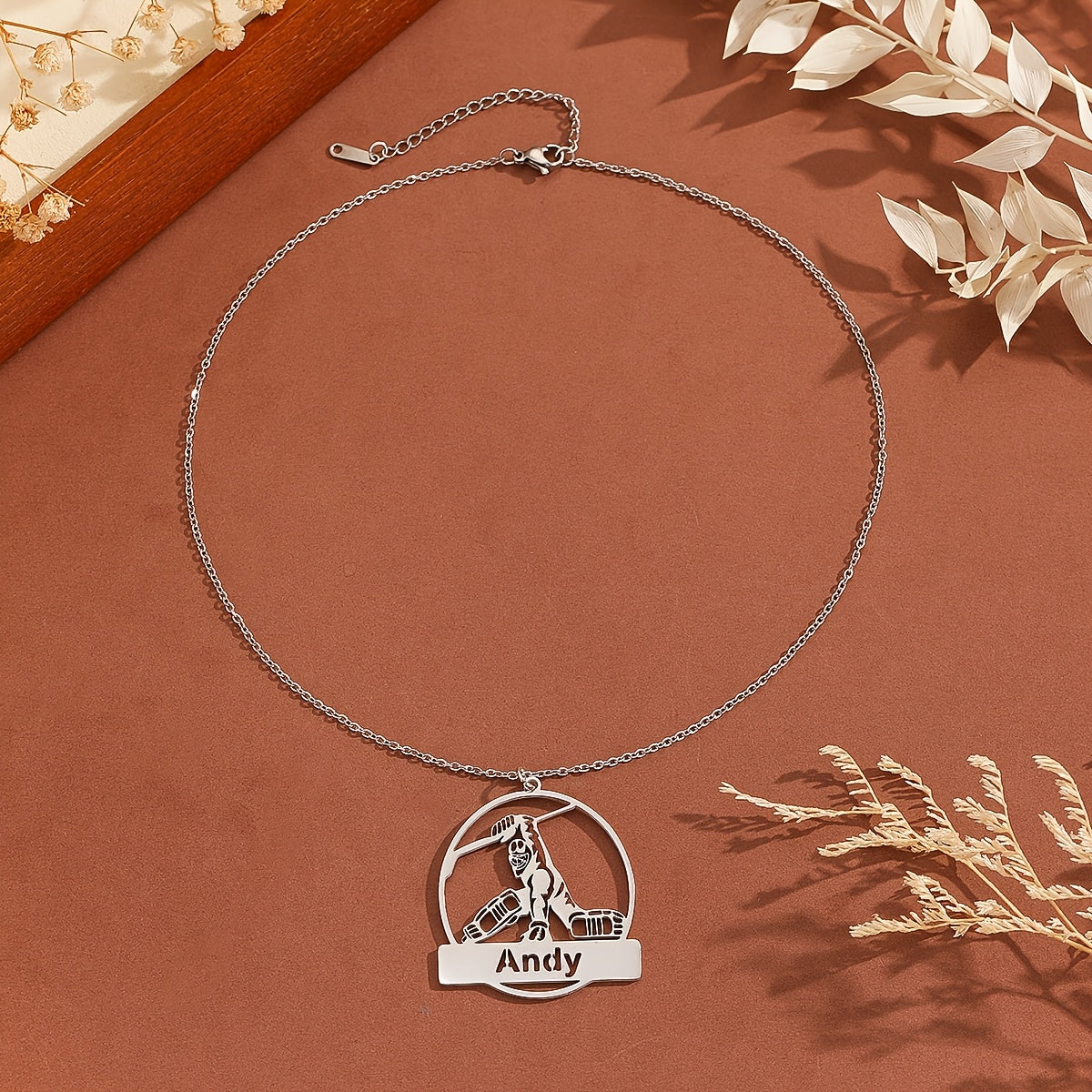 This customizable ice hockey player pendant necklace is made of durable stainless steel. Personalize it with a name or message to make it the perfect gift for any hockey enthusiast.