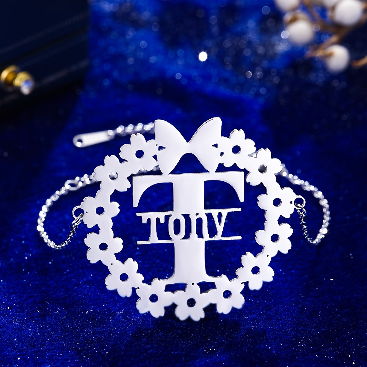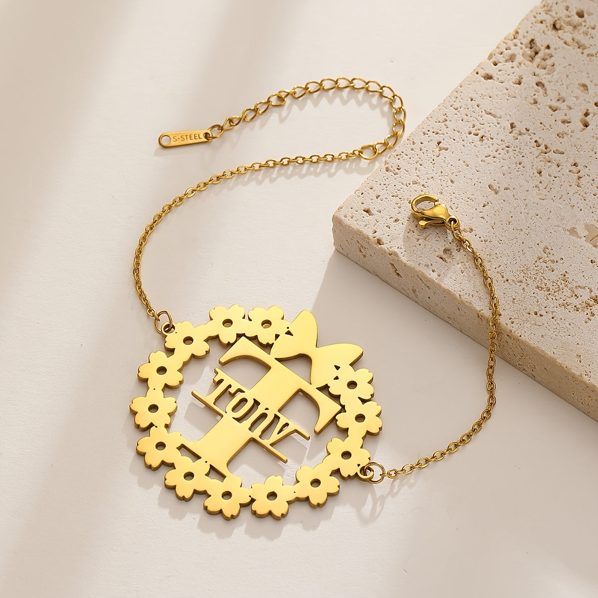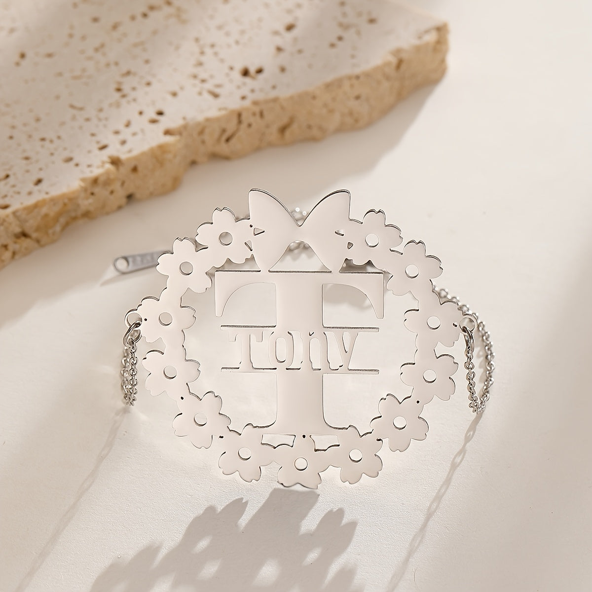 Personalized stainless steel bracelet for women featuring a charming design with a custom name, bow, and flowers pendant.