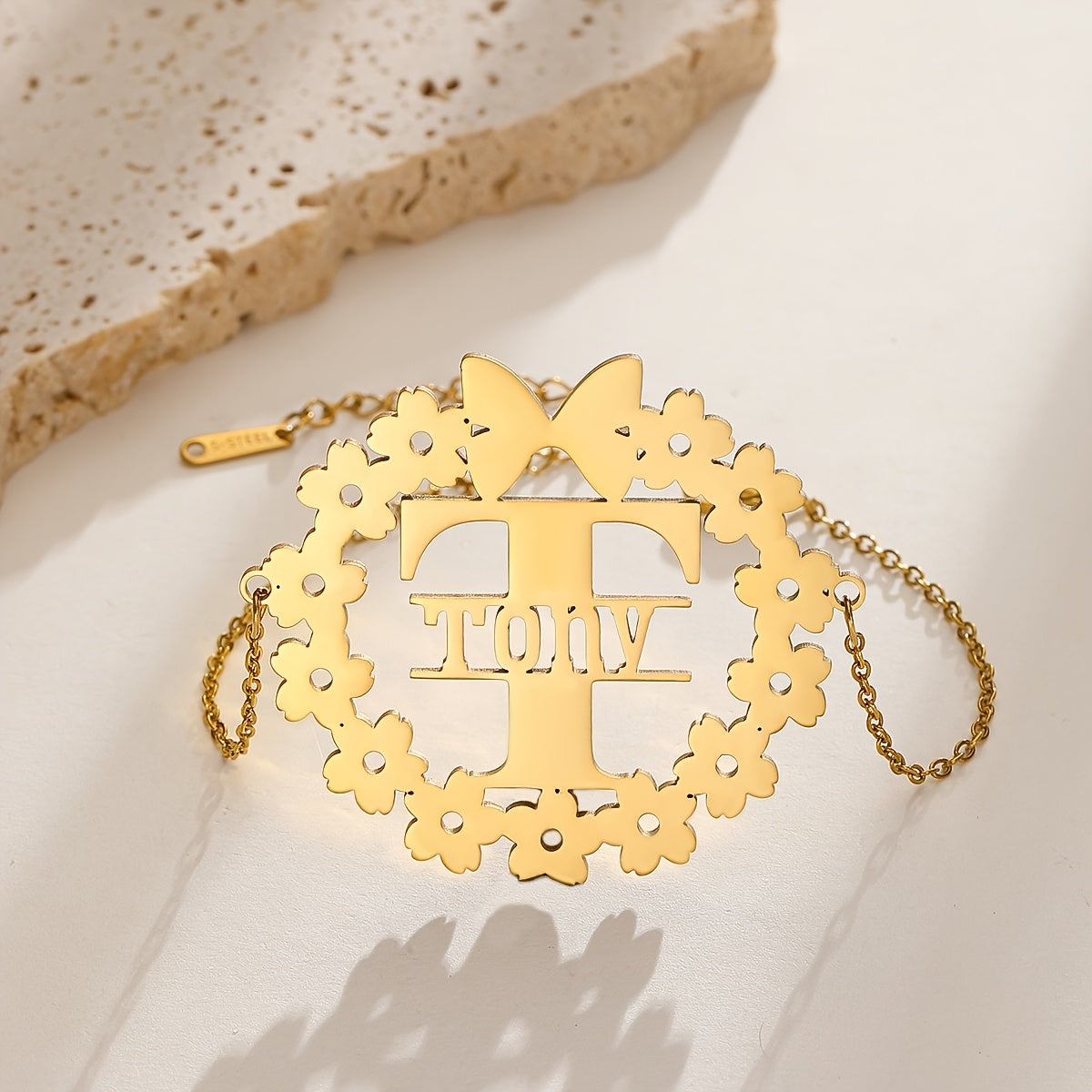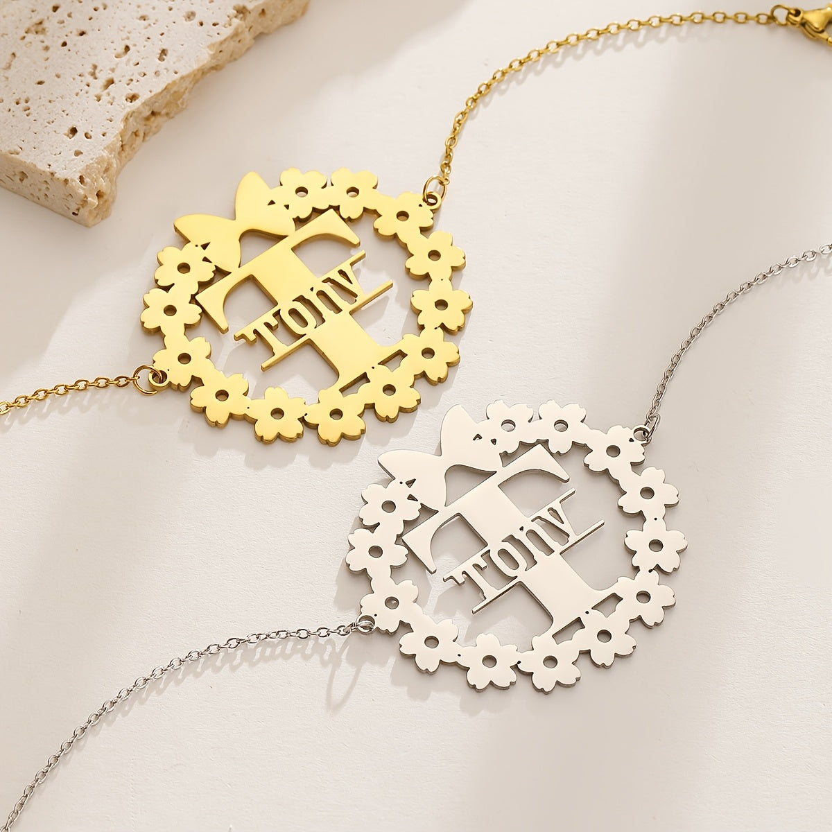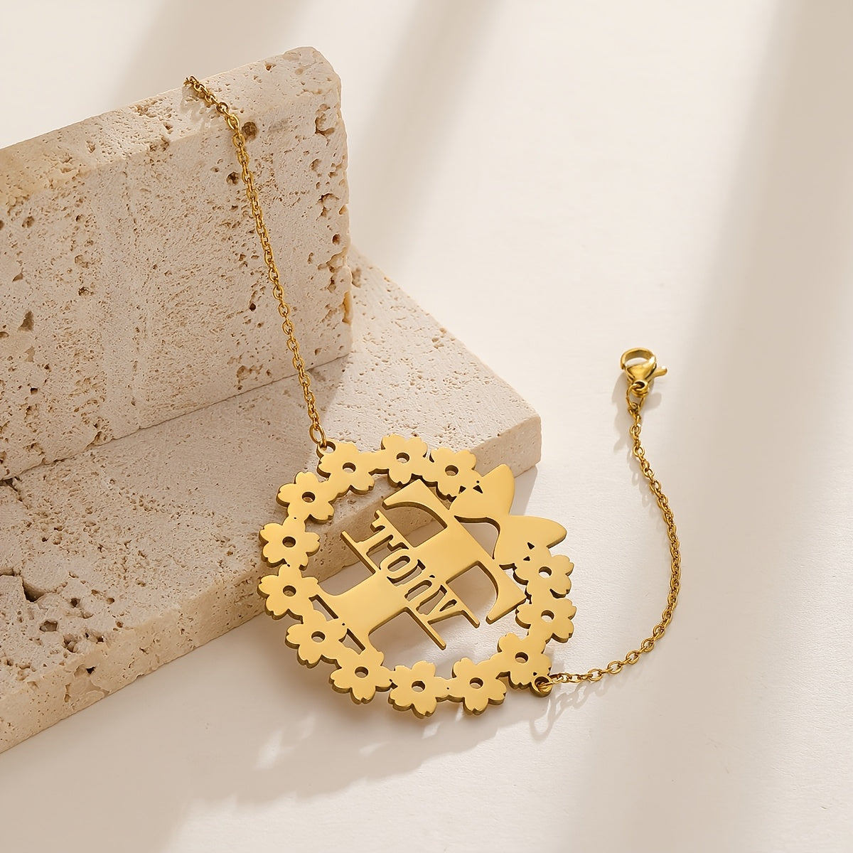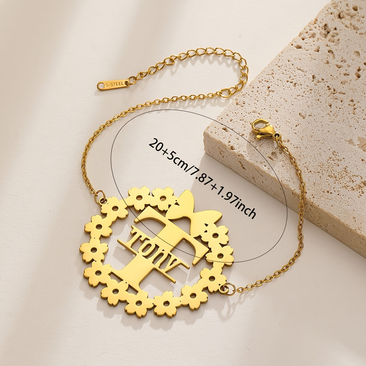 Personalized stainless steel bracelet for women featuring a charming design with a custom name, bow, and flowers pendant.