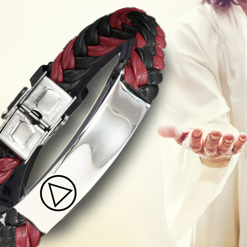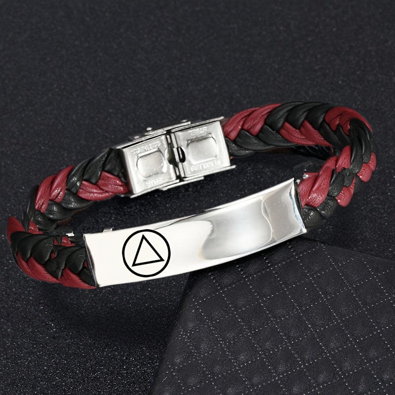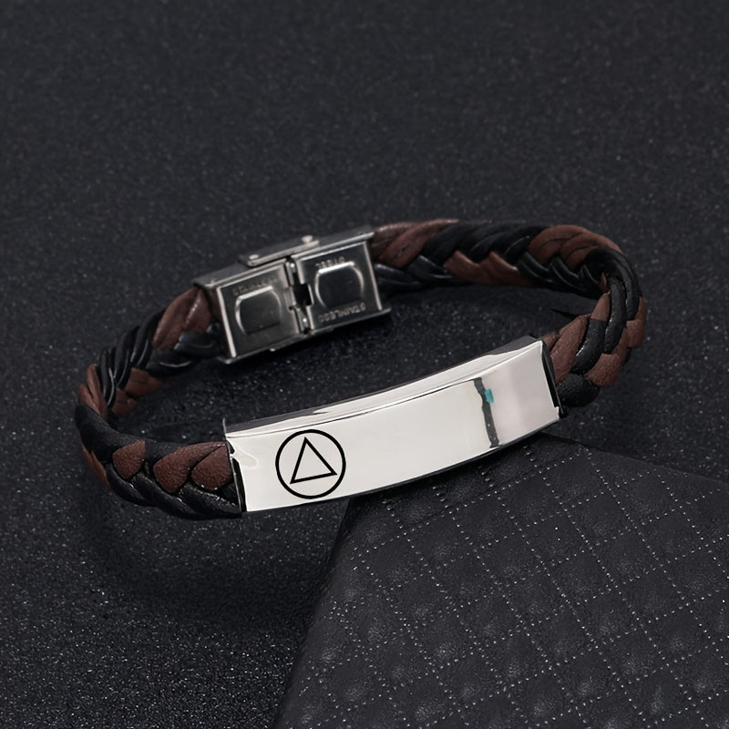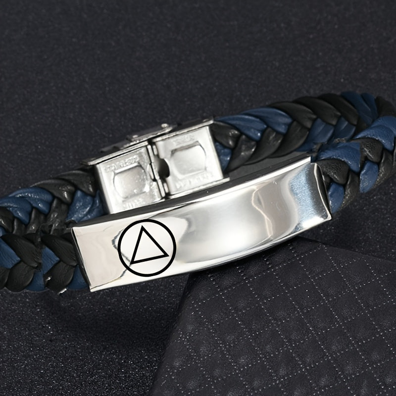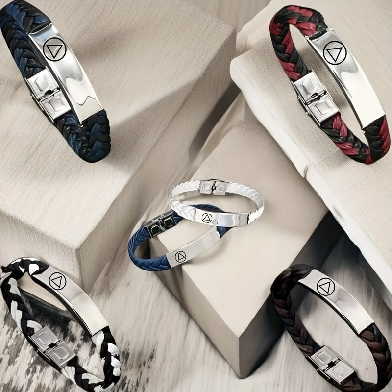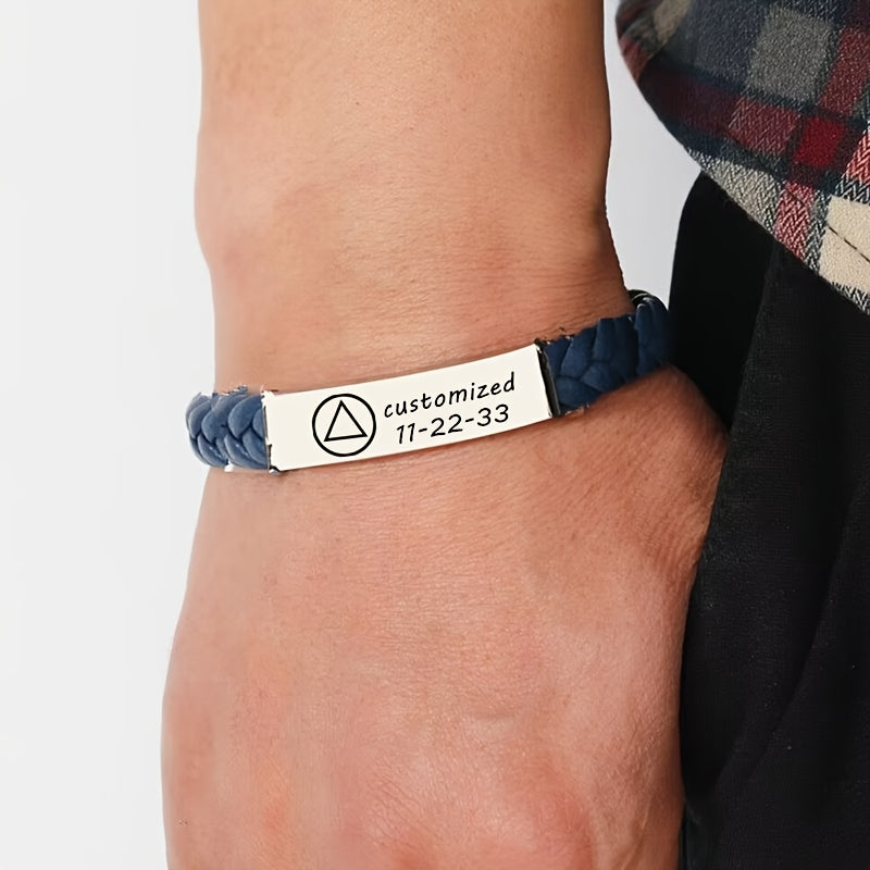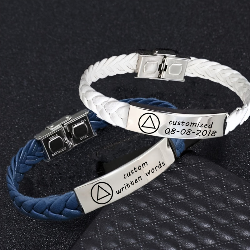 This stylish bracelet is a perfect gift for men and women. Made of woven faux leather, it can be personalized with a name, phone number, and date. Adjustable for a comfortable fit.
