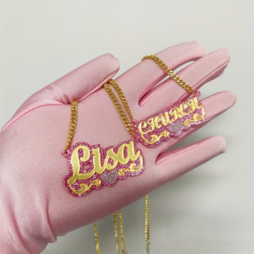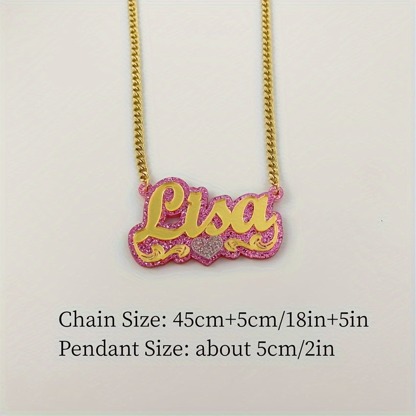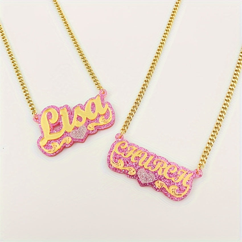 A custom acrylic name necklace featuring a heart theme design, plated in 18K gold. Perfect for daily wear, gift-giving occasions like Christmas, holidays, and all seasons.