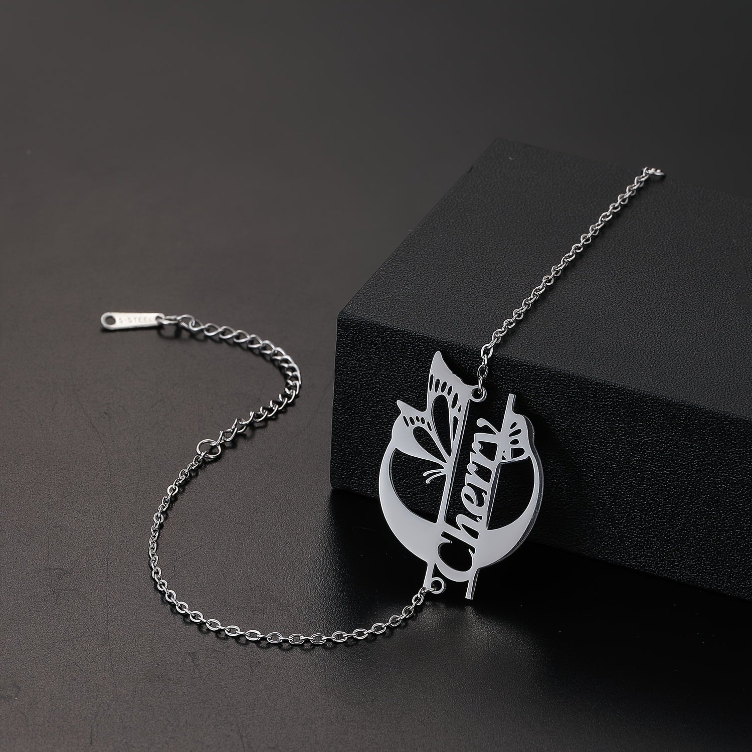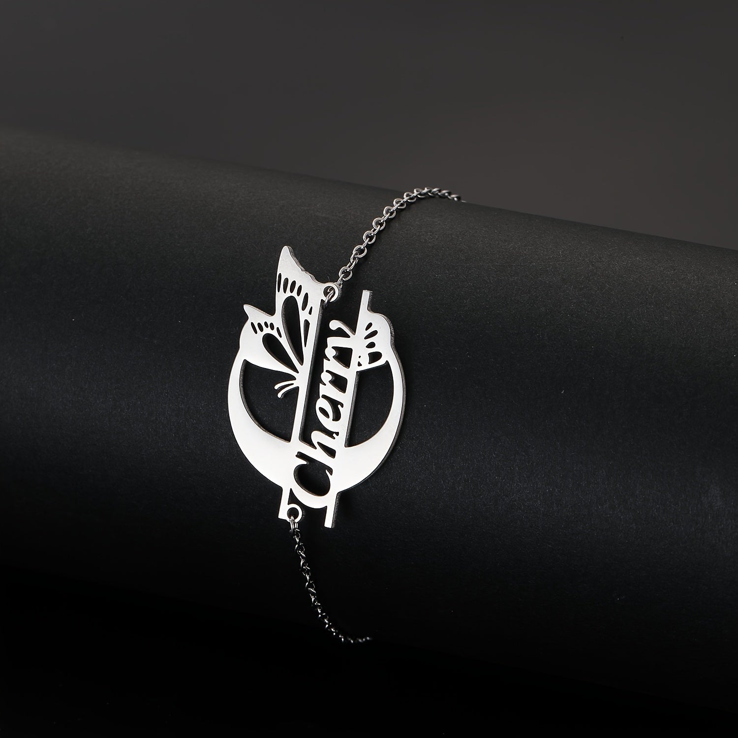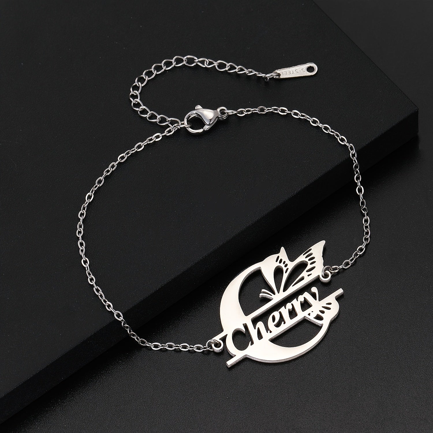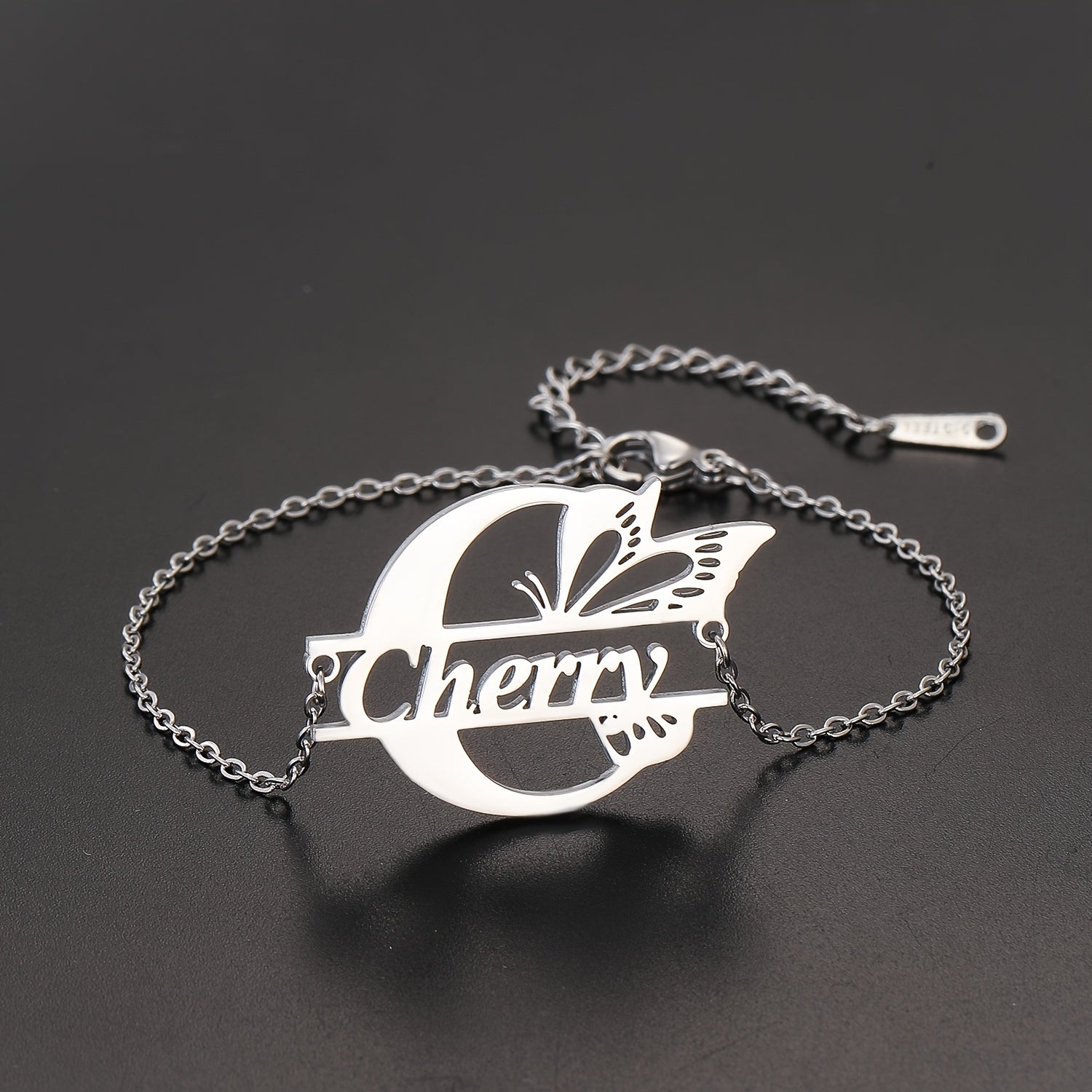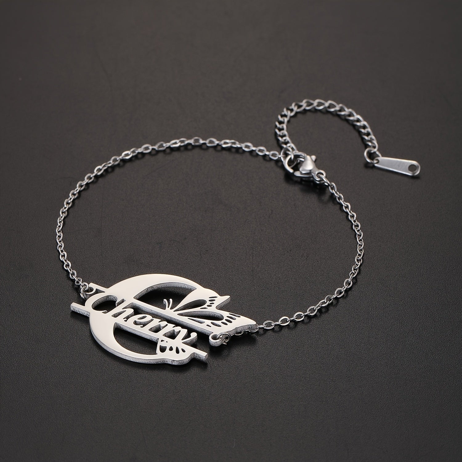This customizable bracelet features a boho butterfly wing design with your chosen name and initial. Made of stainless steel, this personalized jewelry makes a perfect gift for friends and family.